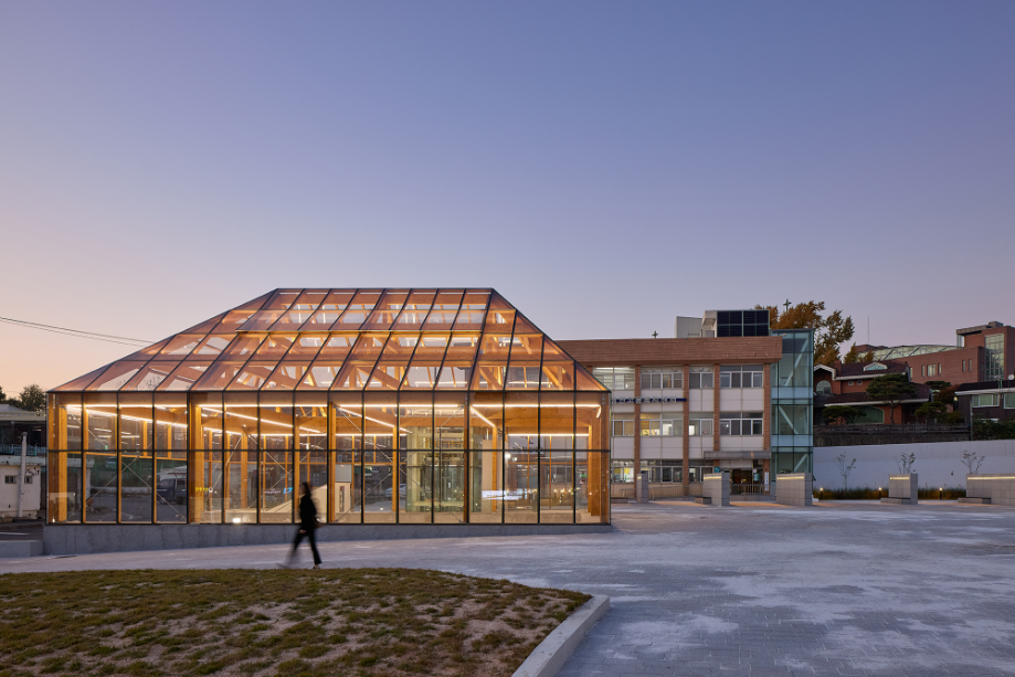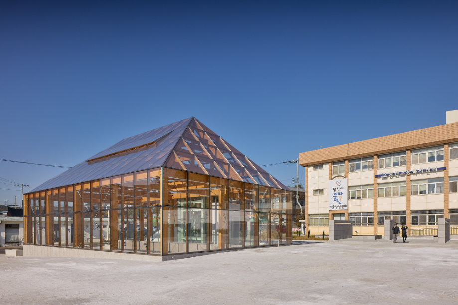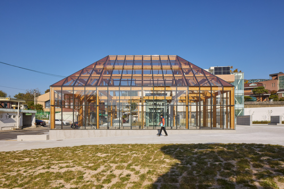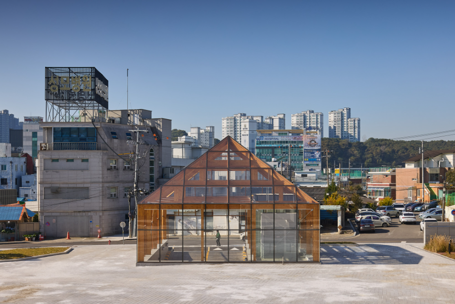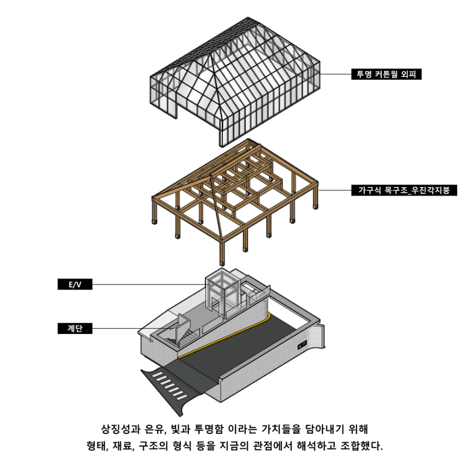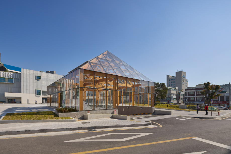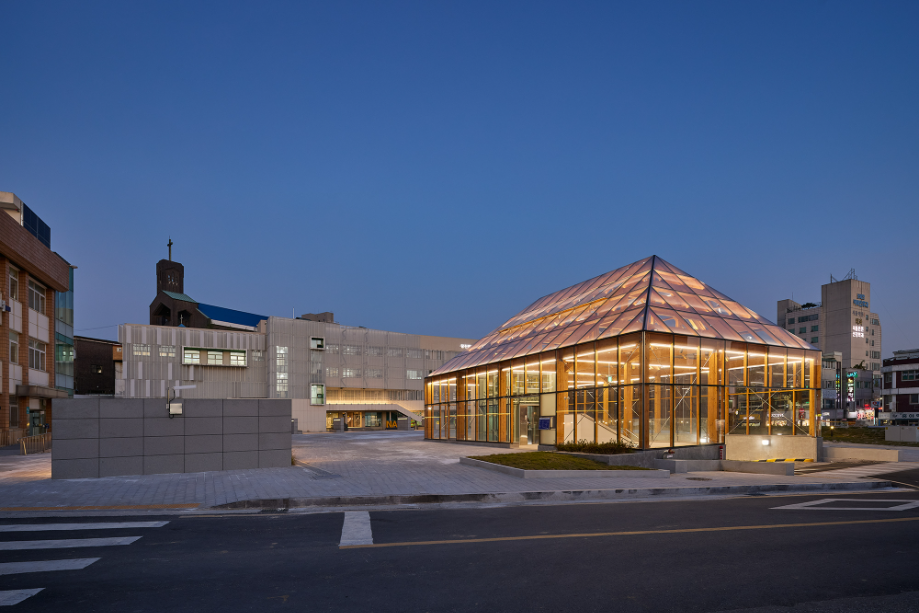 또한 복원된 성벽과 함께 바라보이고 인식될 수 밖에 없는 위치에 있기 때문에 역사적 관점에서 조화로운 형태를 고민하고자 했다. 우리는 과거 읍성 성벽 안쪽에 있던 여러 시설들에 대한 자료들을 찾아보고 그 건축형태를 지금의 관점으로 변환하고자 했다. 그 결과 구조는 중목구조, 형태는 우진각지붕, 그리고 구도심의 중심이라는 상징성을 고려해 유리 외피를 가진 건축구조물을 완성했다.