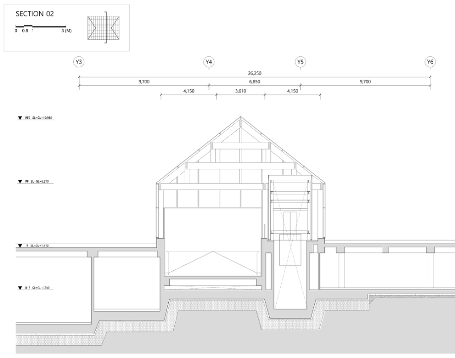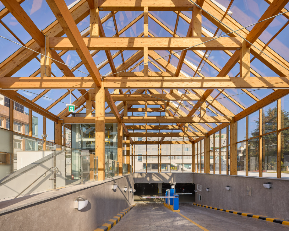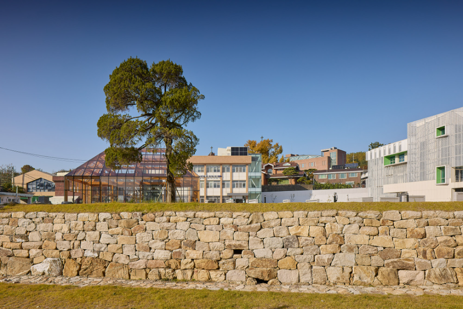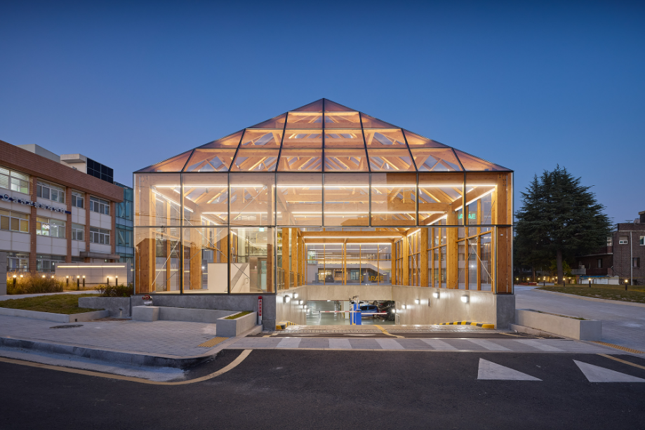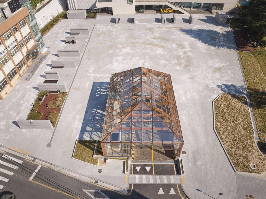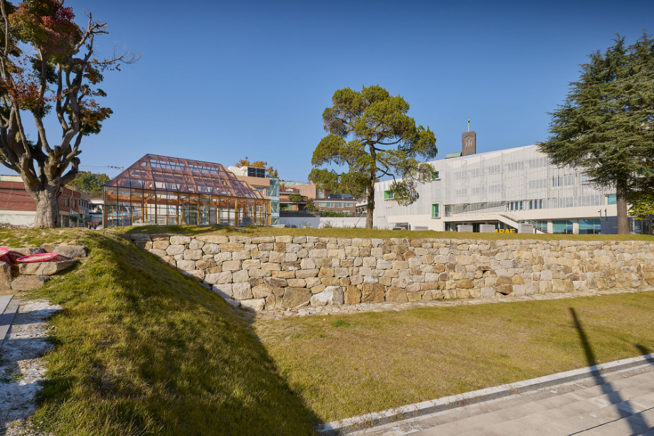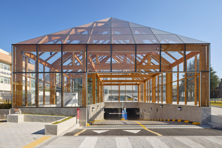 또한 복원된 성벽과 함께 바라보이고 인식될 수 밖에 없는 위치에 있기 때문에 역사적 관점에서 조화로운 형태를 고민하고자 했다. 우리는 과거 읍성 성벽 안쪽에 있던 여러 시설들에 대한 자료들을 찾아보고 그 건축형태를 지금의 관점으로 변환하고자 했다. 그 결과 구조는 중목구조, 형태는 우진각지붕, 그리고 구도심의 중심이라는 상징성을 고려해 유리 외피를 가진 건축구조물을 완성했다.