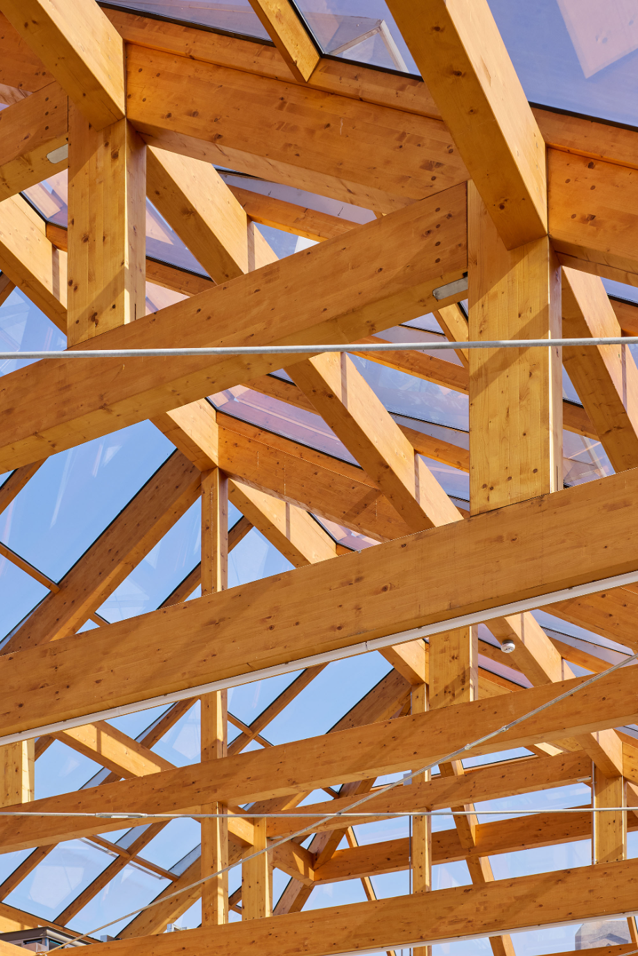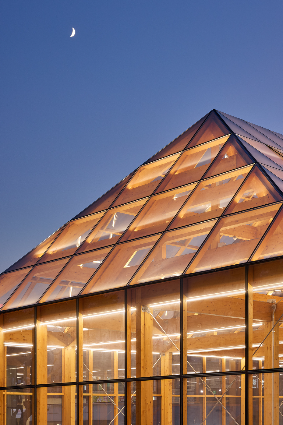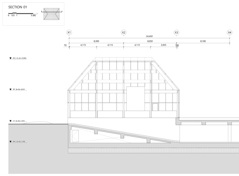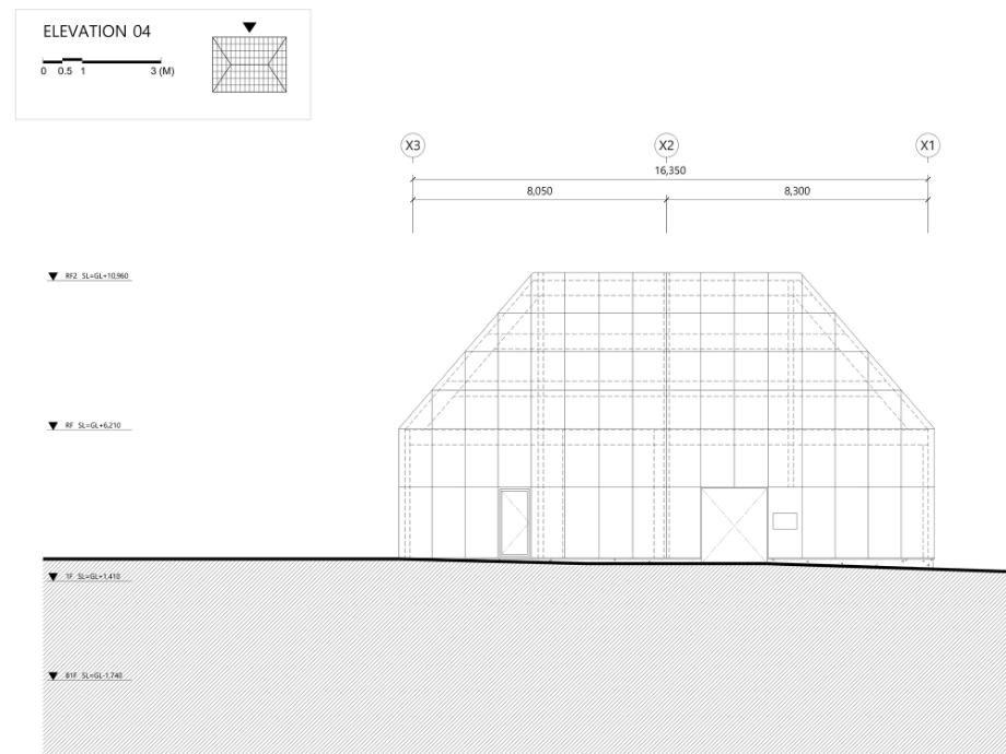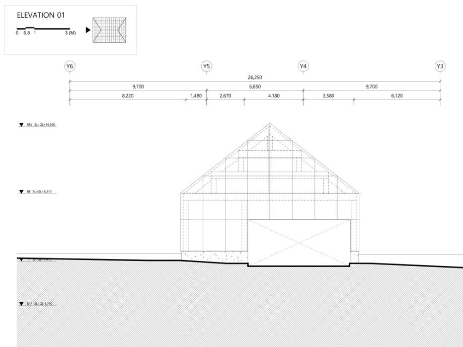 또한 복원된 성벽과 함께 바라보이고 인식될 수 밖에 없는 위치에 있기 때문에 역사적 관점에서 조화로운 형태를 고민하고자 했다. 우리는 과거 읍성 성벽 안쪽에 있던 여러 시설들에 대한 자료들을 찾아보고 그 건축형태를 지금의 관점으로 변환하고자 했다. 그 결과 구조는 중목구조, 형태는 우진각지붕, 그리고 구도심의 중심이라는 상징성을 고려해 유리 외피를 가진 건축구조물을 완성했다.