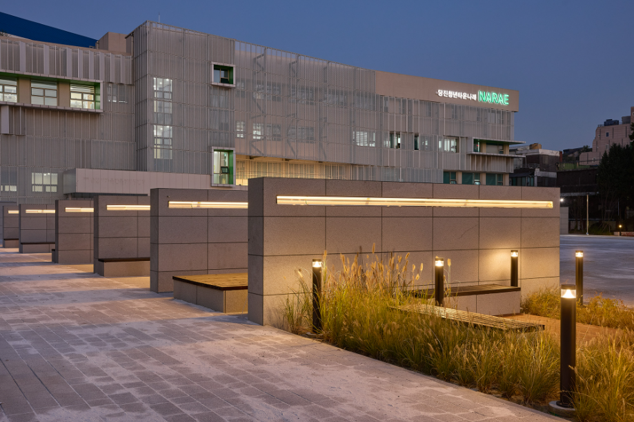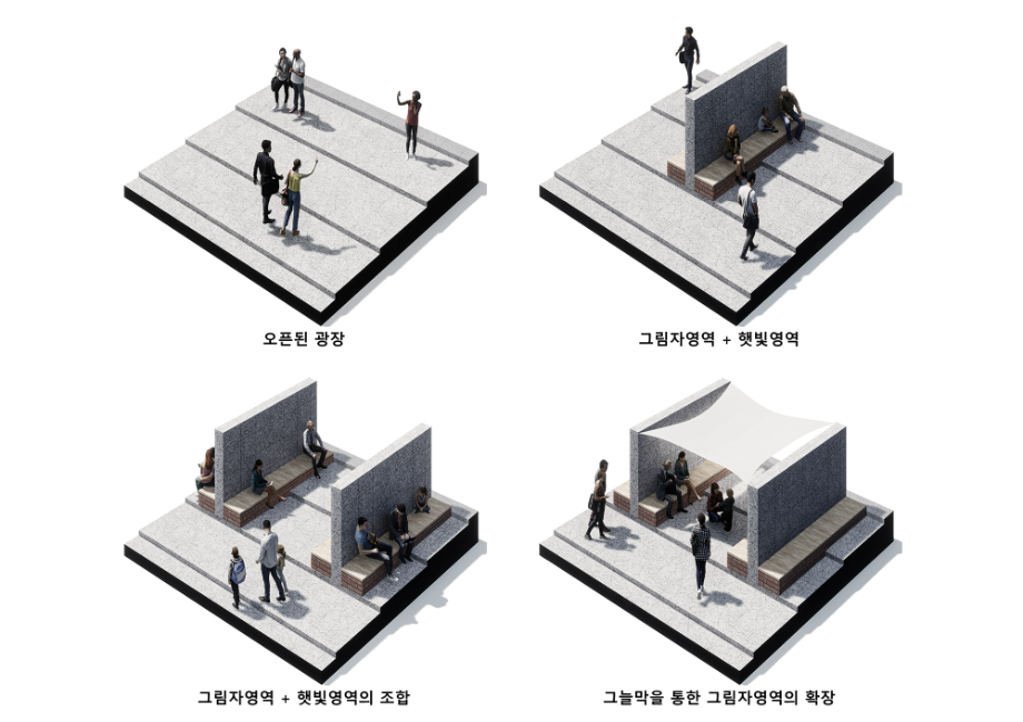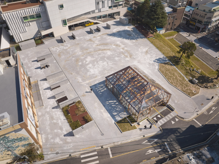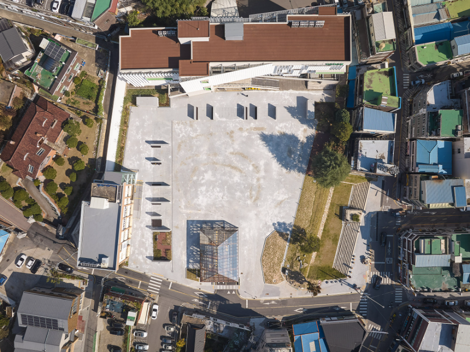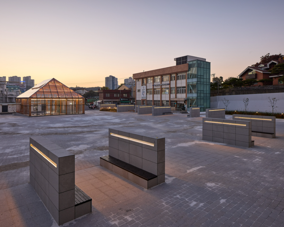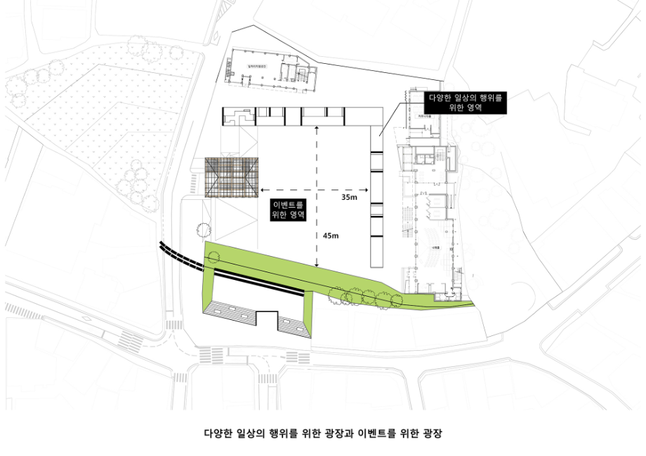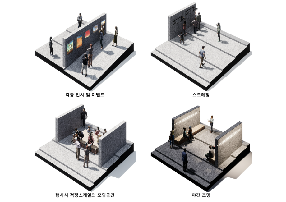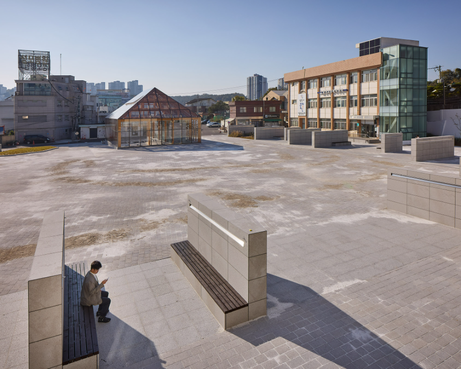 다른 계획은 지하의 주차장 조성과 함께 지상에 광장을 계획하는 것이었다. 특히 여러 다른 지자체의 광장들이 잘 사용되지 못하고 방치되는 현실을 고려하여, 행사가 있을 때 뿐만 아니라 일상속에서도 주민들이 이용할 수 있는 장치를 계획하고자 했다. 따라서 남쪽을 향해 직각과 평행을 하는 두 방향 벽들을 만들어 계절과 태양의 이동에 따라 볕을 쬘 수 있거나, 그림자에서 쉴 수 있는 영역을 만들어 주민들이 선택하여 사용할 수 있도록 했다. 그리고 그 벽을 중심으로 벤치, 평상, 전시벽 등을 설치해 넓은 광장이지만 다양한 일상 속 행위들이 발생할 수 있는 작은 스케일의 거점들을 여럿 만들었다.