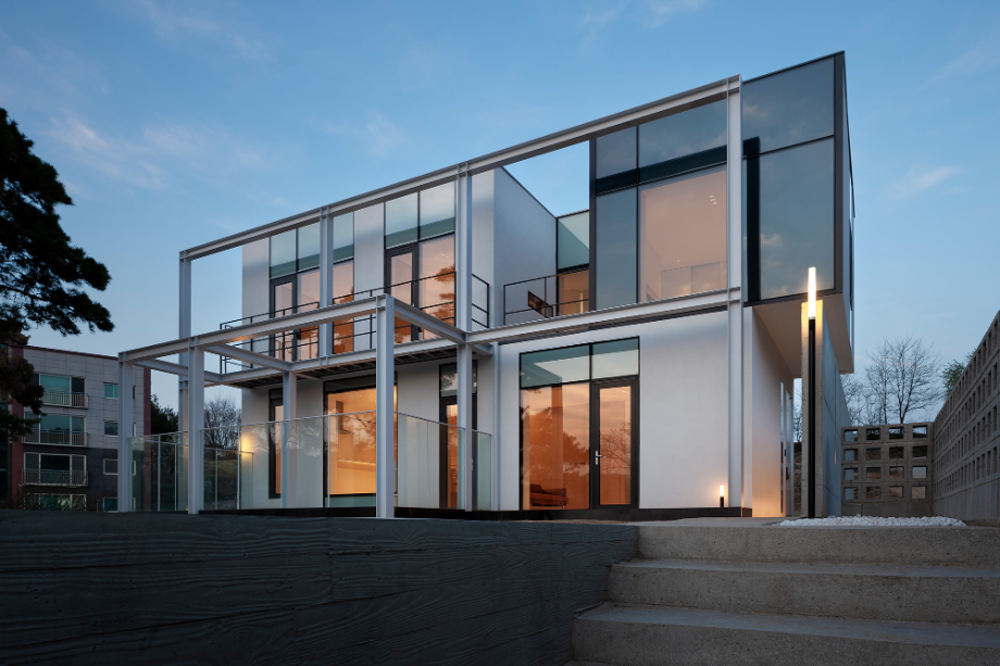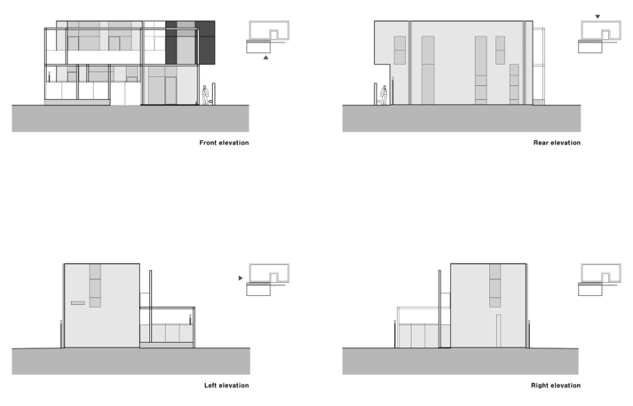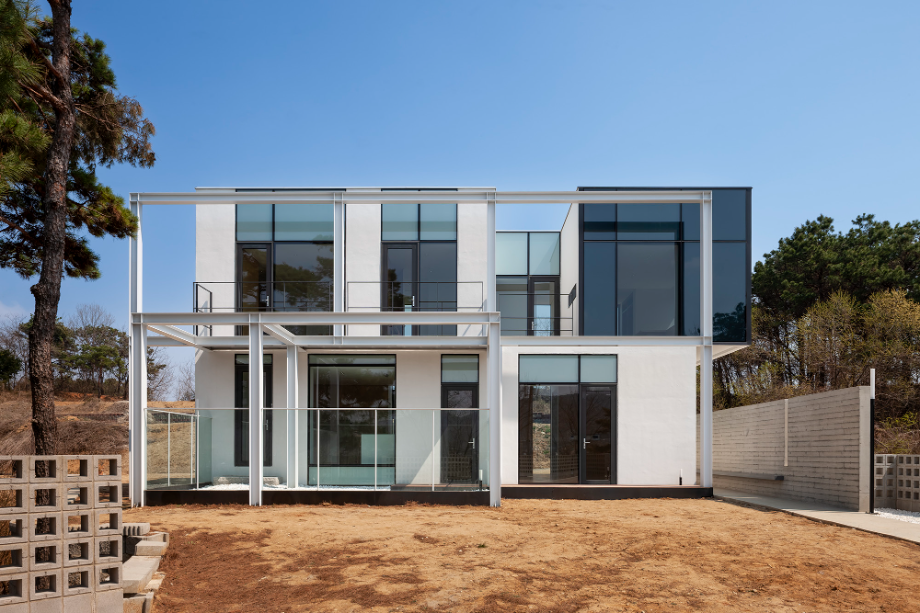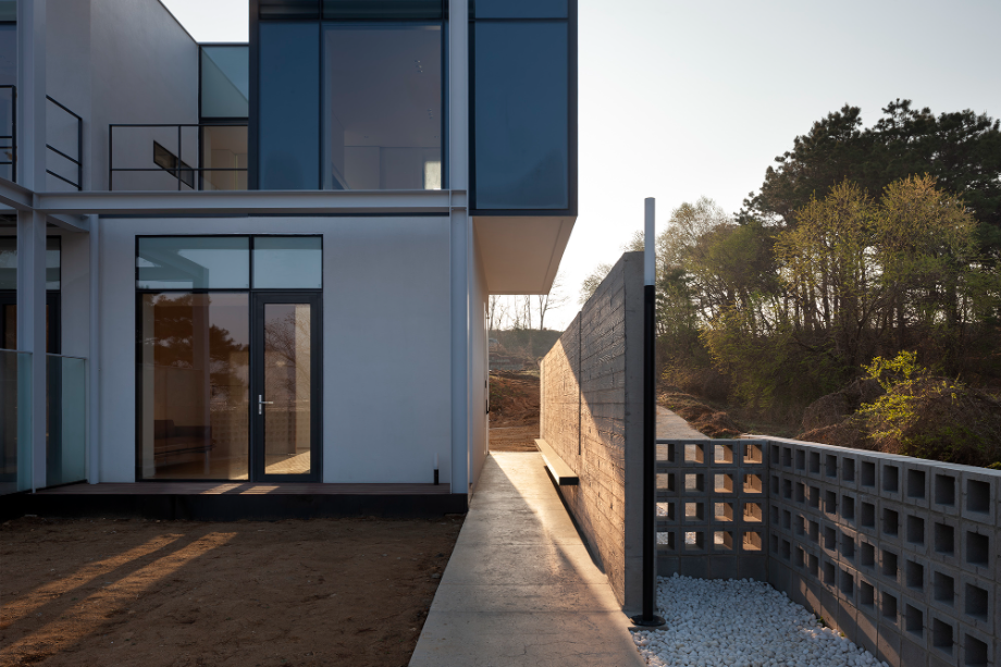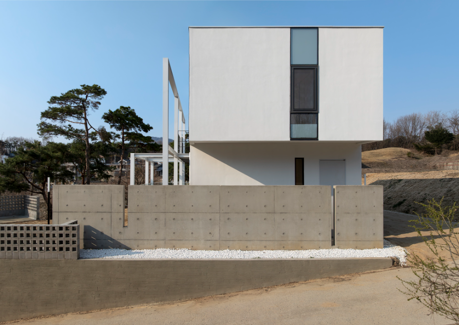 건물의 입면은 최대한 단순화했다. 다만, 마당 측에 면한 부분에 철재 형강으로 구조물을 만들어, 건물의 표정을 만드는 역할을 하고 있다. 이 구조물은 1층의 외부 중정을 구성하는 역할뿐 아니라. 2층의 캐노피 및 테라스로 사용하고 있다. 서측에서의 일사량을 조절하기 위한 장치로도 사용할 수 있다.