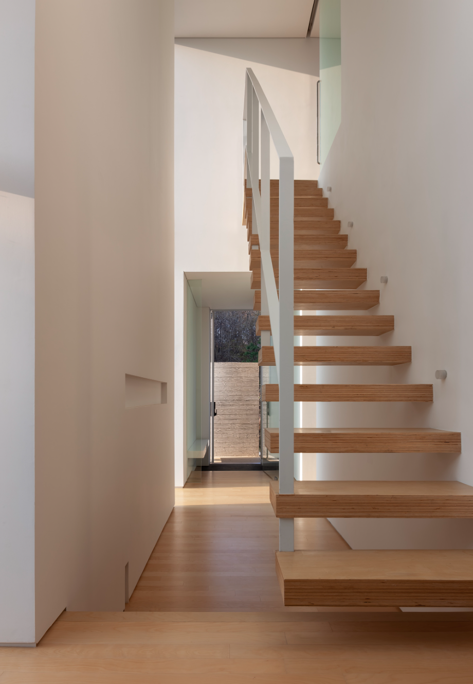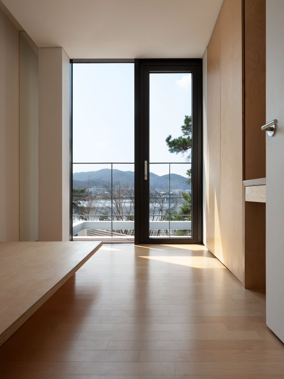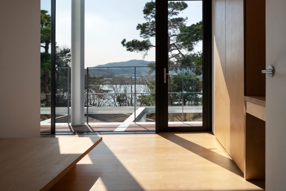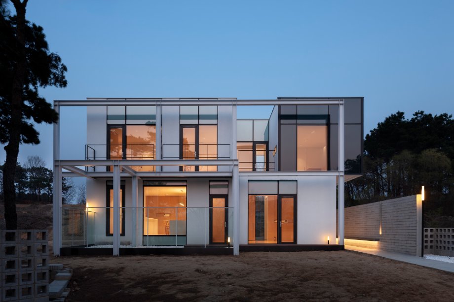 건축주 부부와 두 자녀를 위한 평면이다. 면적이 30여 평 남짓하고 크지 않은 조건이어서, 1층은 거실, 식당, 주방을, 2층에는 침실을 3개 계획했다. 2층으로 올라가는 계단실은 2개 층 오픈 공간에 만들어서 내부의 동선을 풍요롭게 하는 역할을 한다. 이 공간은 채광, 환기, 시야 확보 등에 중요하다. 이 중정을 중심으로 거실, 주방, 식당, 침실, 2층 복도 등, 각각의 용도로 쓰인 공간을 연결한다. 건물은 전형적인 전원주택이므로, 야생동물의 침입을 고려하여 문을 열고 지낼 수 있는 옥외공간을 건물 전면에 유리 벽으로 계획했다.