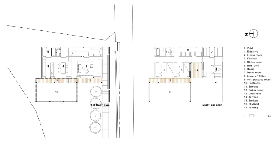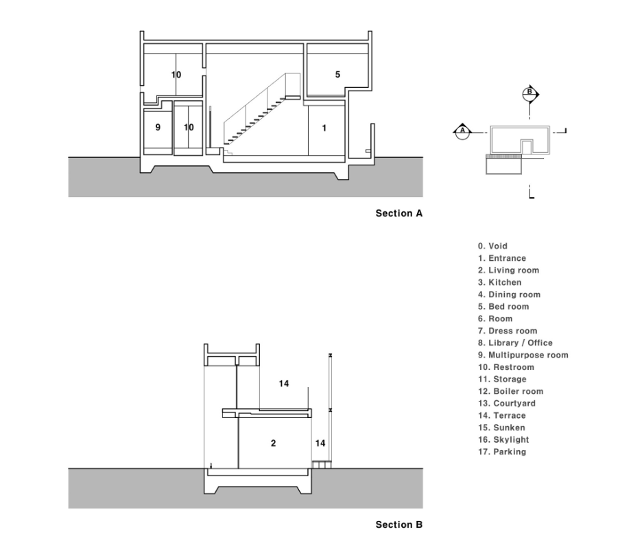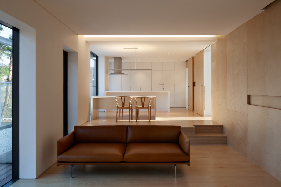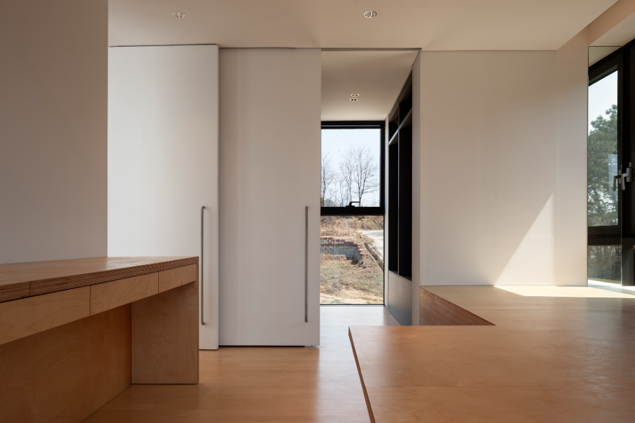 이 주택의 1층 거실은 식당, 주방과 천장 레벨은 동일하지만 거실의 바닥은 450mm 정도 내려가 있어 거실의 천장높이가 높아지도록 계획되었다. 이는 주변의 경사를 이용한 것이다. 또한, 현관에서 진입하는 곳에 2개 층 오픈 공간을 계획하여 내부 공간들이 다양한 느낌으로 연결되도록 했다.