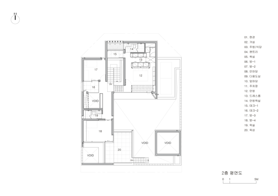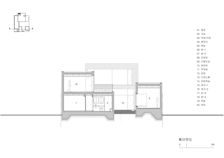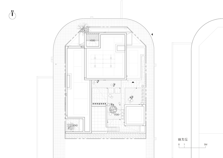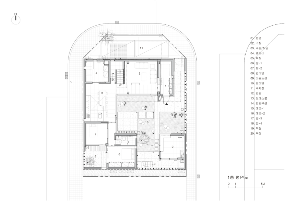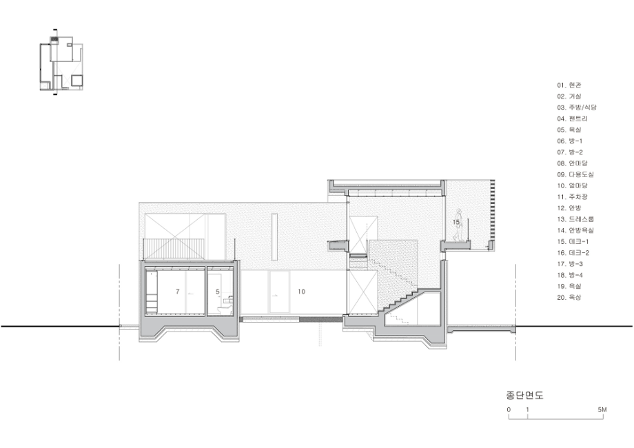 중년 부부는 그들의 노부모와 두 자녀가 함께 거주할 수 있는 규모의 집을 의뢰하였고, 가장의 은퇴 후 이 집이 좀 더 조용한 환경에서 부부의 다양한 여가와 안락한 일상을 담아낼 수 있는 장소가 되기를 바랐다. 우리는 이들 삼대 가족 구성원 각각의 일상에 대한 존중과 집에 대한 인식 차이를 고려하여 상호 공감이 가능한 집의 원형을 제시함과 동시에 영역 구분을 세분화하여 구성원들 간 사생활이 지켜질 수 있도록 고민했다.