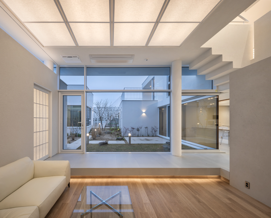 정원을 중심으로 주변에 배치된 거실과 주방, 공방은 각기 다른 바닥 레벨로 조성하여 다양한 공간 경험을 줄 수 있도록 했다. 또한, 각자의 공간에서 거리를 두고 있는 가족들이 서로 시선을 주고받으며 분산되지 않고 결합 되는 공간이 되도록 했다. 기준 바닥 레벨에서 편안한 이동이 가능한 조부모 공간은 가변벽체를 통해 두 개의 침실이 개별 공간이 되거나 통합될 수 있고, 개별 공간에 있더라도 서로 마주할 수 있는 구조의 작은 마당을 통해 정서적 구심점을 공유하도록 했다. 독립적 외부 활동이 필요한 자녀들은 마당에서 별도로 형성된 외부 계단을 통해 자유로운 출입이 가능하다. 부부 공간은 2.5층 높이에 독립적으로 조성하여 사생활을 확보하고 높은 위치에서 주변을 조망할 수 있도록 했다.