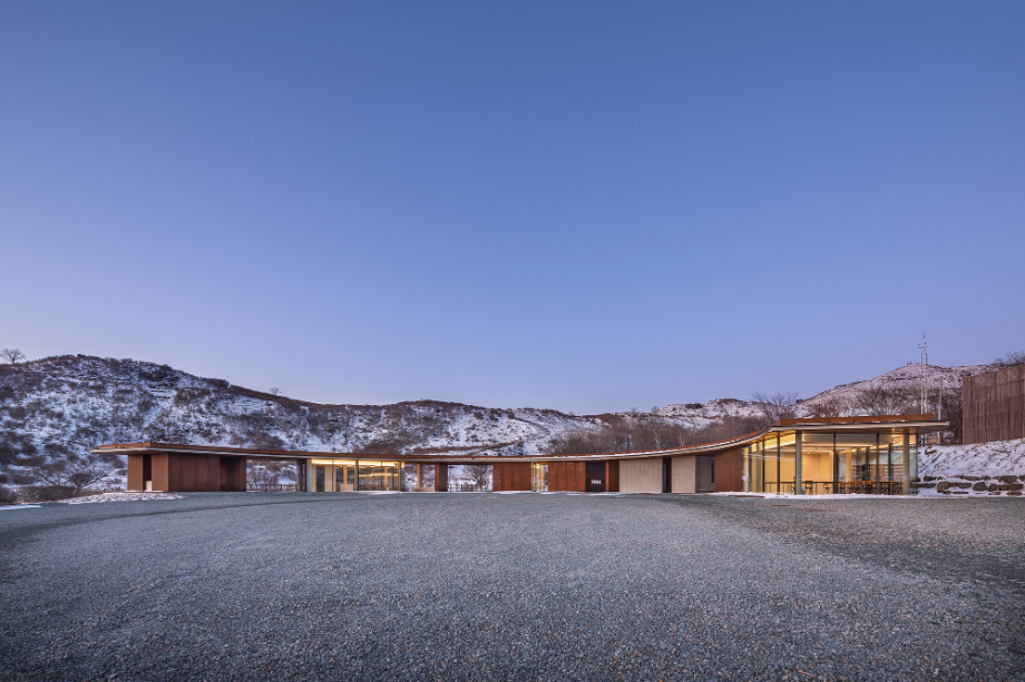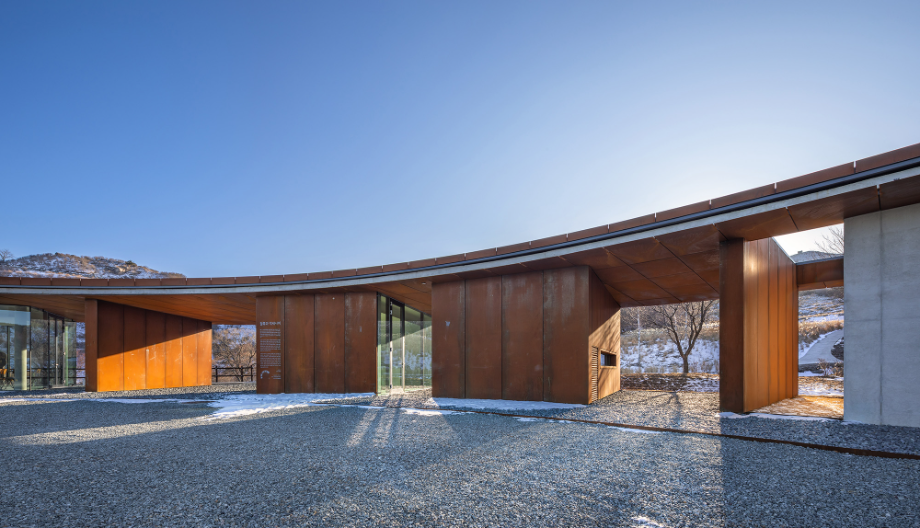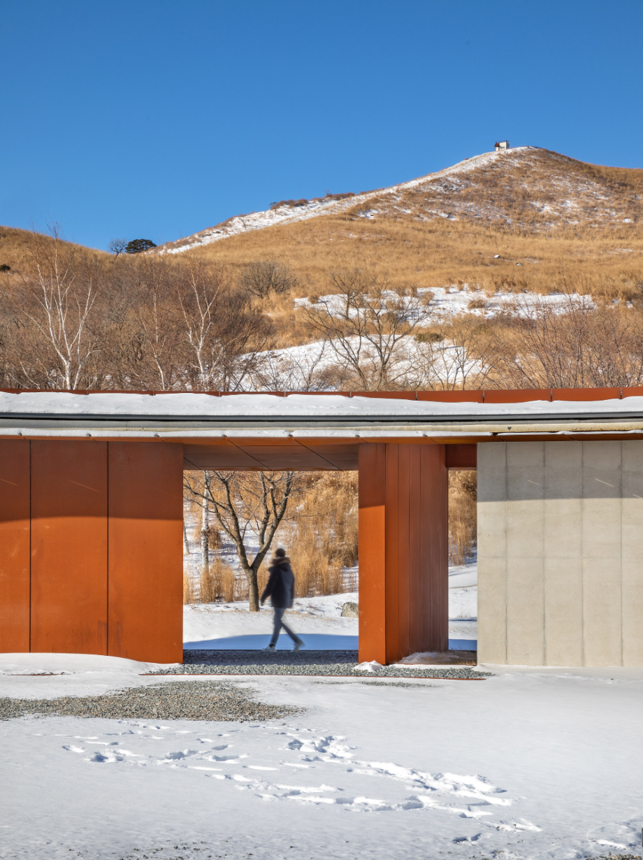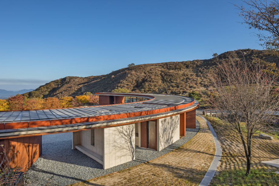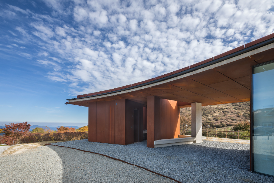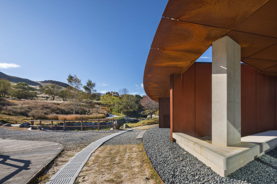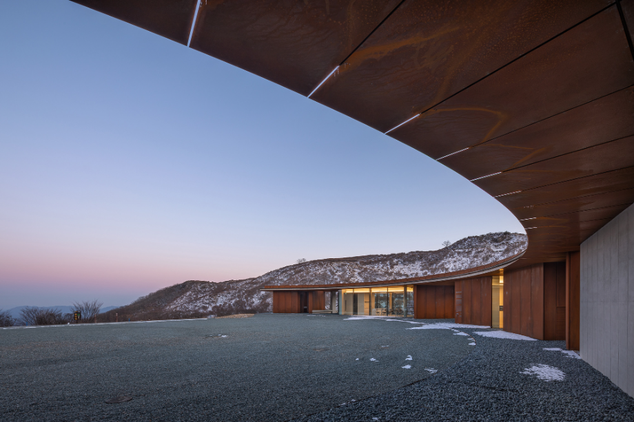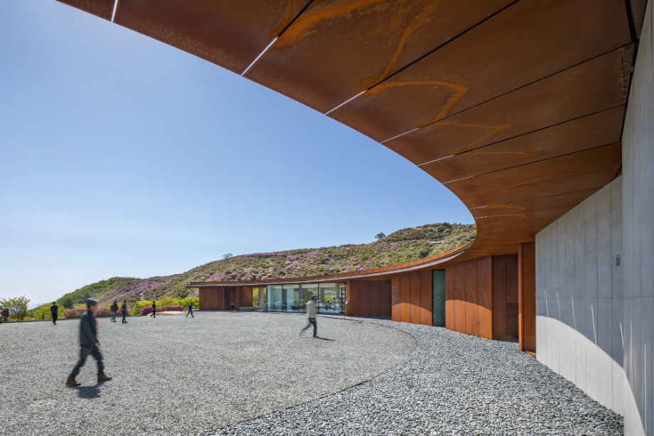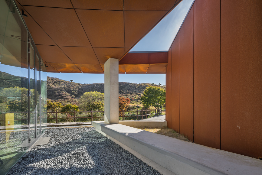 사계절이 변화함에 따라 콘크리트와 철은 점점 자연과 동화되면서 색이 바뀌고, 비바람에 녹슬고 얼룩진다. 외장재로 사용된 내후성강(코르텐강)판은 세월이 흐르면서 서서히 부식되는 재료다. 처음 설치될 때는 단색의 검정이지만 표면이 부식되기 시작하면서 밝은 오렌지색으로 변한다. 봄, 여름, 가을, 겨울 사계절을 거치면서 붉은 색깔이 조금씩 강해지다가 결국에는 검붉은 암적색으로 정착한다. 편의상 단순한 색깔로 설명했지만 실제 보이는 것은 더욱 변화무쌍하다. 비바람에 노출되는 정도에 따라 같은 면이라도 부식의 속도가 다르고, 사람의 손길이 닿는 곳과 아닌 곳의 색감이 다르다. 흐린 날과 맑은 날이 달라 보이고, 해와 달이 비추는 각도에 따라서도 차이가 난다. 이른 새벽, 이슬이 맺힌 강판은 단단하고 강인해 보이지만 해질 무렵 노을 빛을 받으면 주변까지 함께 붉게 물들이면서 부드러운 분위기를 자아낸다. 이런 점에서 내후성강판은 황매산의 다채로운 날씨와 계절을 표현하는 데 제격인 재료라 생각했다. 봄의 철쭉과는 비슷해서 보기 좋고, 여름의 청록색과는 보색으로 조화롭다. 가을의 누런 억새밭은 거칠고 강한 철판의 물성을 순화시키고, 겨울철 건물은 눈 덮인 새 하얀 세상의 한 점 아이콘이 된다.