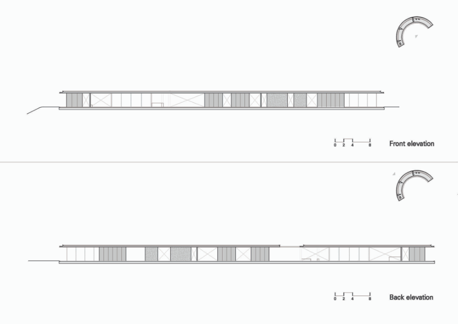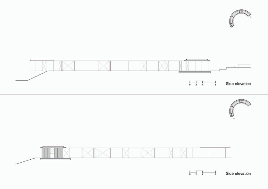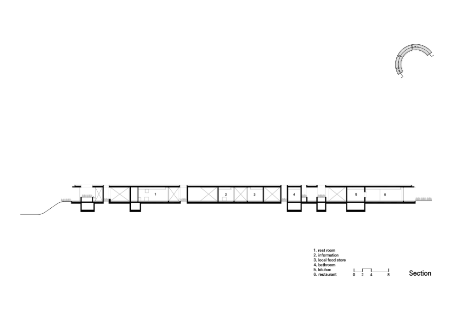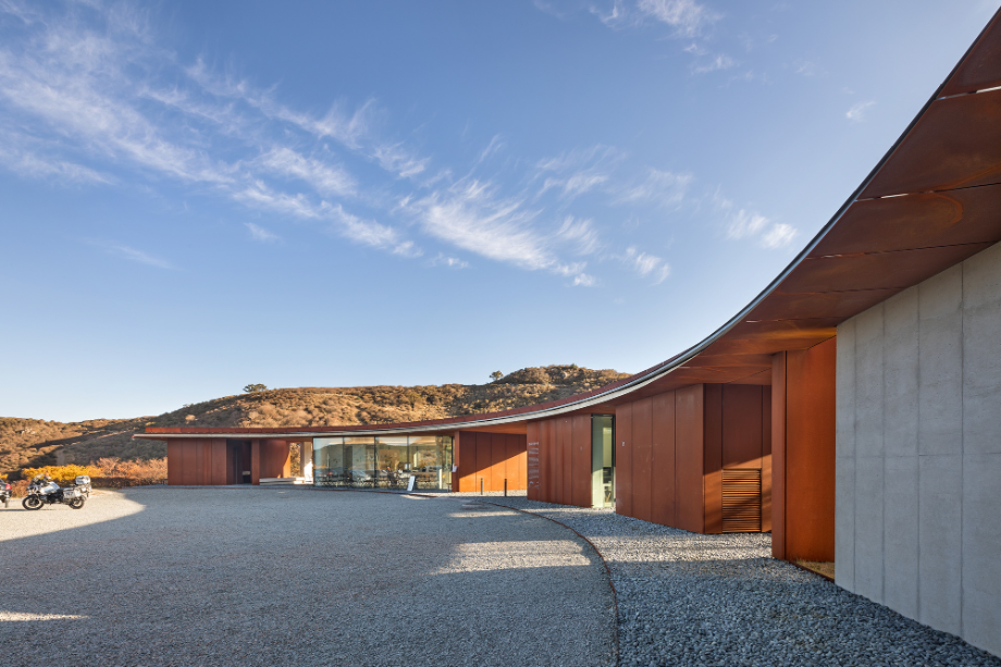 건물은 콘크리트 뼈대에 철과 유리만 입힌 상태로 완성됐다. 감싼 것이 아니라 말 그대로 입혔기 때문에, 콘크리트 구조가 철판과 유리 사이에서 여기저기 모습을 드러내고 있다. 위아래로 살짝 맞댄 철판 사이로 지붕 슬래브의 콘크리트 면이 보이고, 중간에 박힌 기둥과, 그곳에서 이어지는 콘크리트 바닥 구조는 등산객을 위한 벤치 역할을 한다.