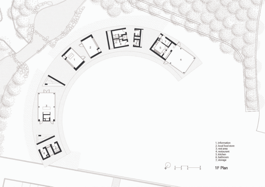 '철쭉과 억새 사이'는 황매산군립공원의 관광휴게소다. 봄에는 철쭉, 가을에는 억새밭이 펼쳐지는 해발 850m 등산로 길목의 대문 역할을 한다. 대지는 황매평전과 작은 계곡을 사이에 두고 마주하고 있기 때문에 마치 계곡이 자연스럽게 인간과 자연의 세계를 분리해 놓은 듯 보인다. 산 위에서 내려다보면 건물은 정확하게 반원의 형태다. 계곡을 등지고, 산을 배경으로 건물이 서 있지만 그 높이가 낮아 황매평전의 산세를 거스르지 않는다. 또한 햇빛을 피할 곳조차 마땅치 않은 고도의 평야에서 잠시 쉬어 갈 수 있는 그늘과 휴식 공간을 제공한다.