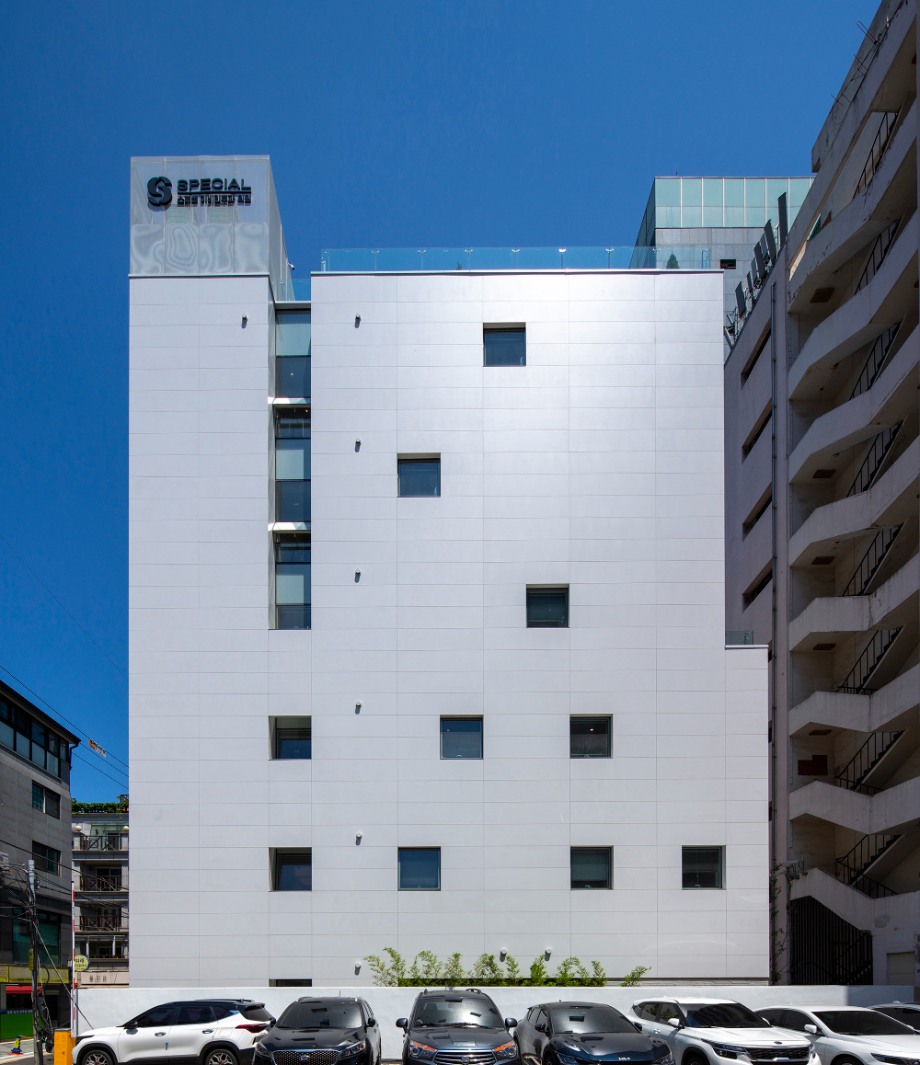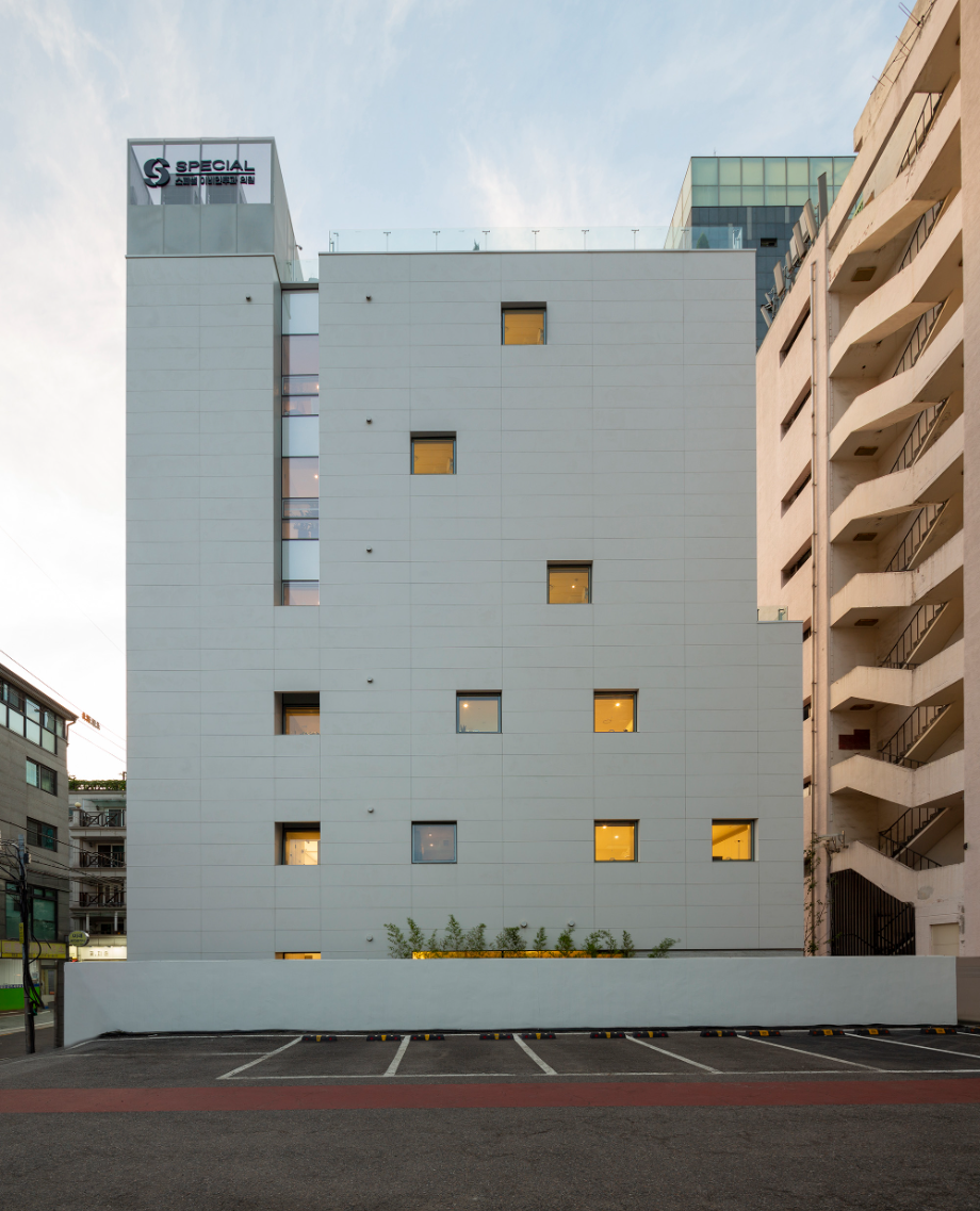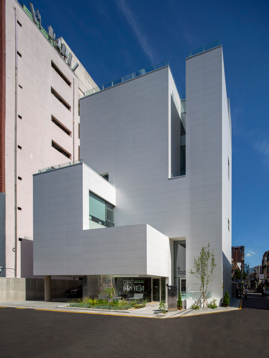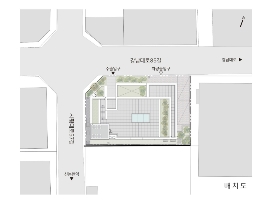 디자인의 첫 번째 방향은, 강남대로 이면도로변의 번잡한 환경 속에 '마당'을 제공하는 것이었다. '마당'은 이면도로에 새로운 생명체와도 같이 살아있는 가로환경을 만들어 주길 기대한다. 두 번째 방향은, 건물 내부에 도시를 향한 열린 '틈'을 만드는 것이었다. '틈'은 도시로 열린 경관을 만들어내며, 건축과 도시의 관계성을 강화한다.