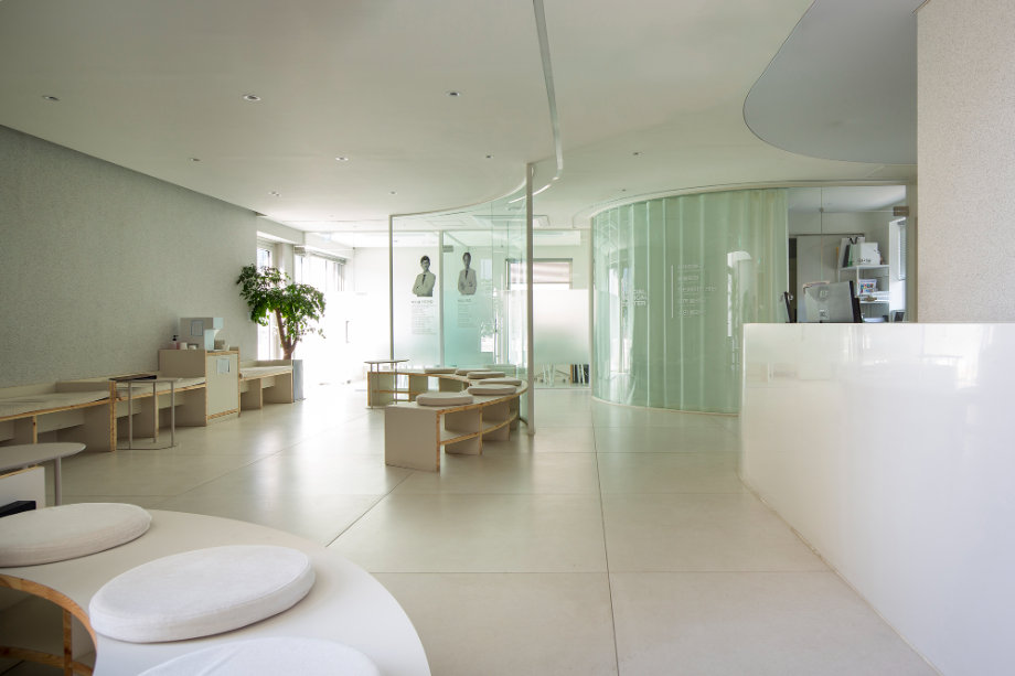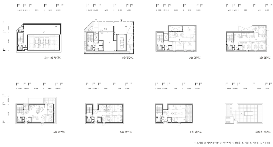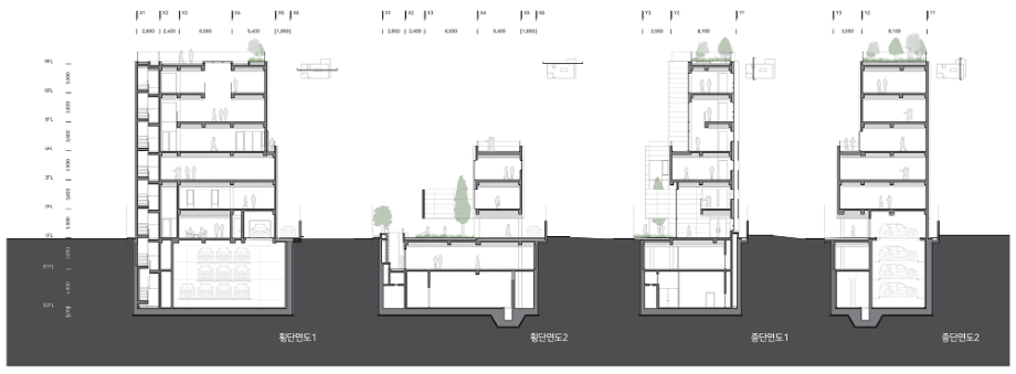 세 번째 방향은, 이면도로의 스케일을 고려하여 저층과 중층 볼륨의 조합으로 디자인하는 것이었다. 가로변에 저층의 볼륨을 마당과 함께 계획하고, 후면에 중층의 볼륨을 중첩시킴으로써, 가로변의 스케일과 주변의 중층 스케일에 적절히 대응하고자 했다. 네 번째 방향은, 코어와 전용공간이 틈에 의해 분리된 개념과 함께, 곡선형의 공간흐름과 하늘로 열린 시선의 흐름 등, 각 층별 다양한 공간 경험이 일어날 수 있도록 했다.
