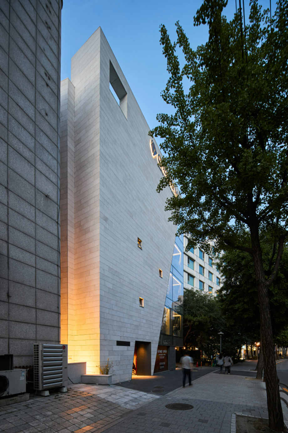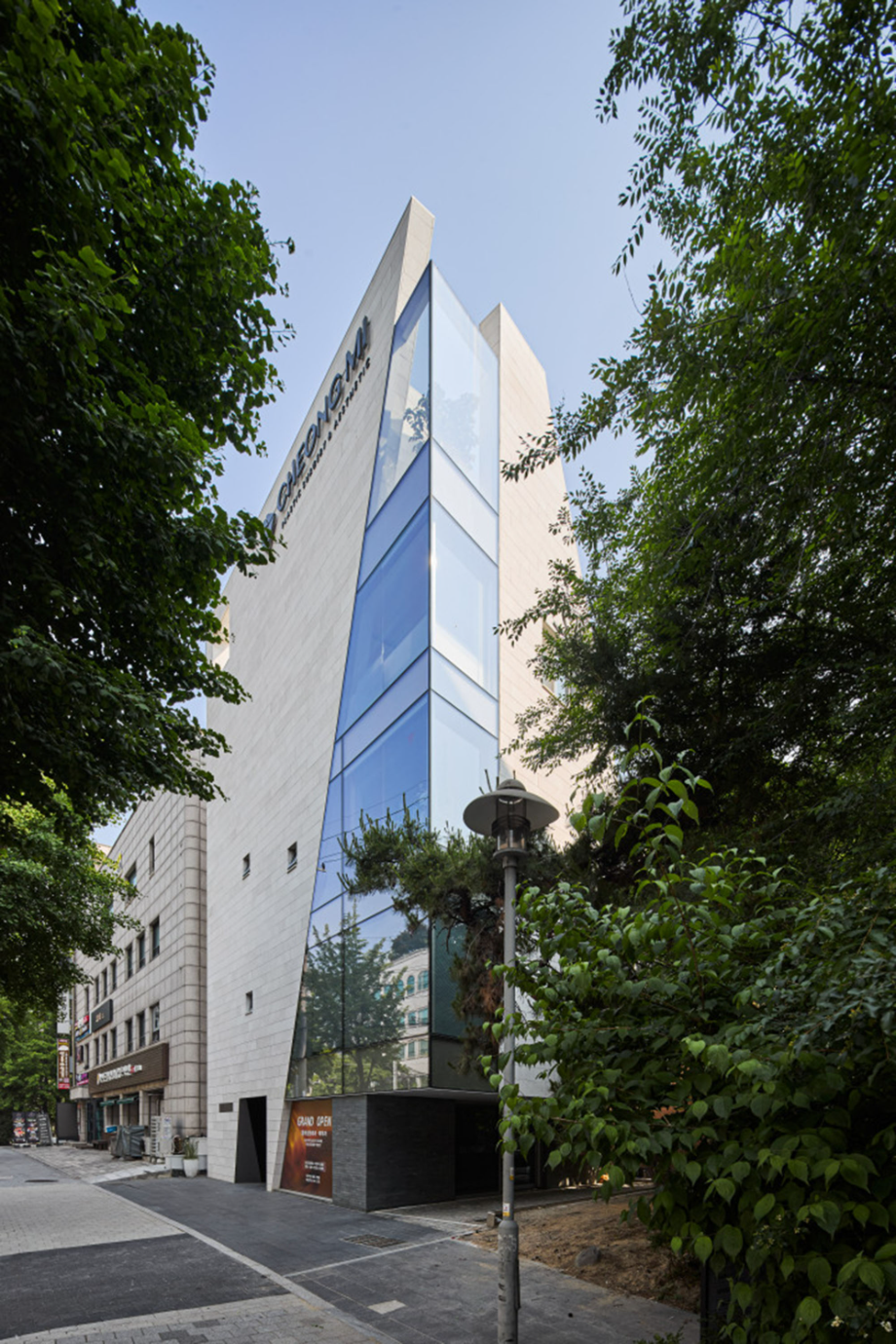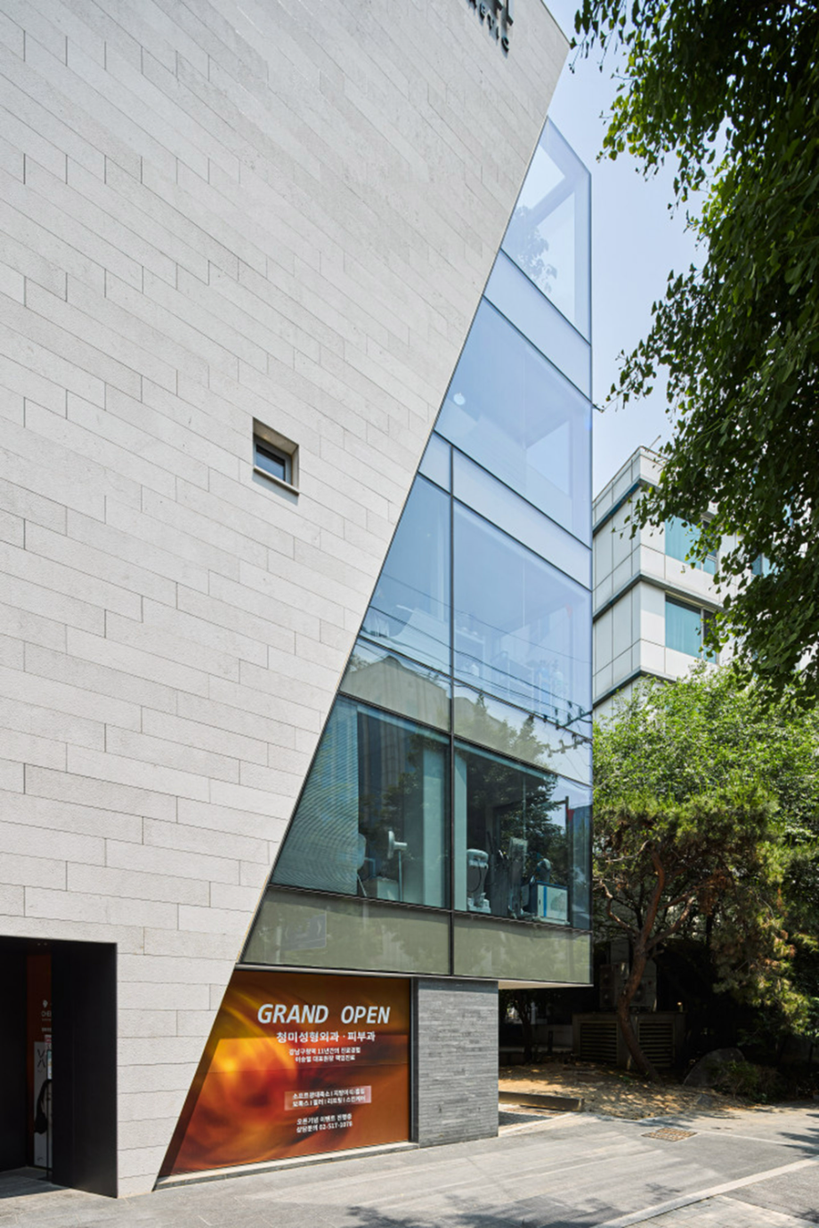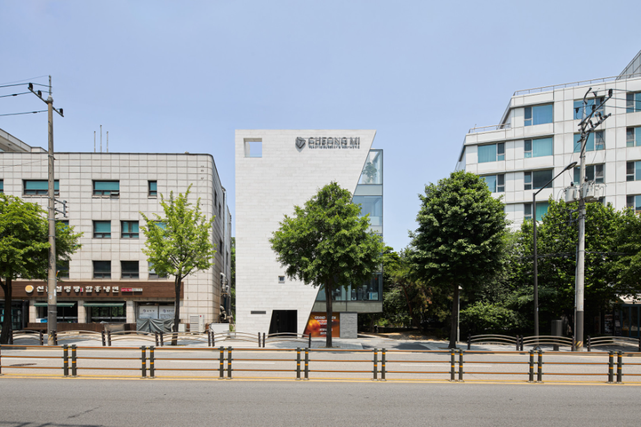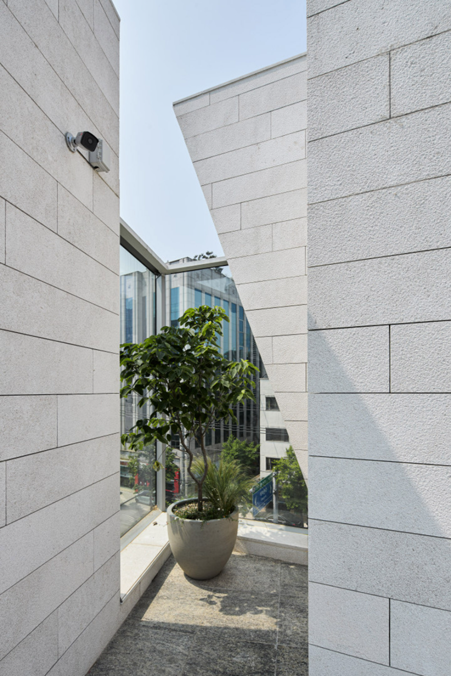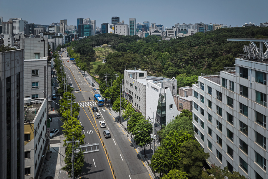대로변 박스형 건물들 사이에서 존재감을 부여하기 위해서, 우리는 선적인 변화가 있으면서도 하나의 단일체 (Monolith) 느낌이 나는 건물을 만들고자 했다. 건물 배면의 정북일조높이 제한이 만드는 사선을 정면 커튼월에도 적용하여 단일체의 느낌을 강조하도록 하였다. 길을 걷다보면 눈에 띄는 건물 남측 코너부는 커튼월로 계획하여 선릉로를 향한 조망을 확보했다. 선릉로에서 보이는 두 매스 사이의 코너창은 낮에는 도시풍경을 반사시키고 밤에는 내부공간을 투명하게 드러내며 인상적인 표정을 만든다.