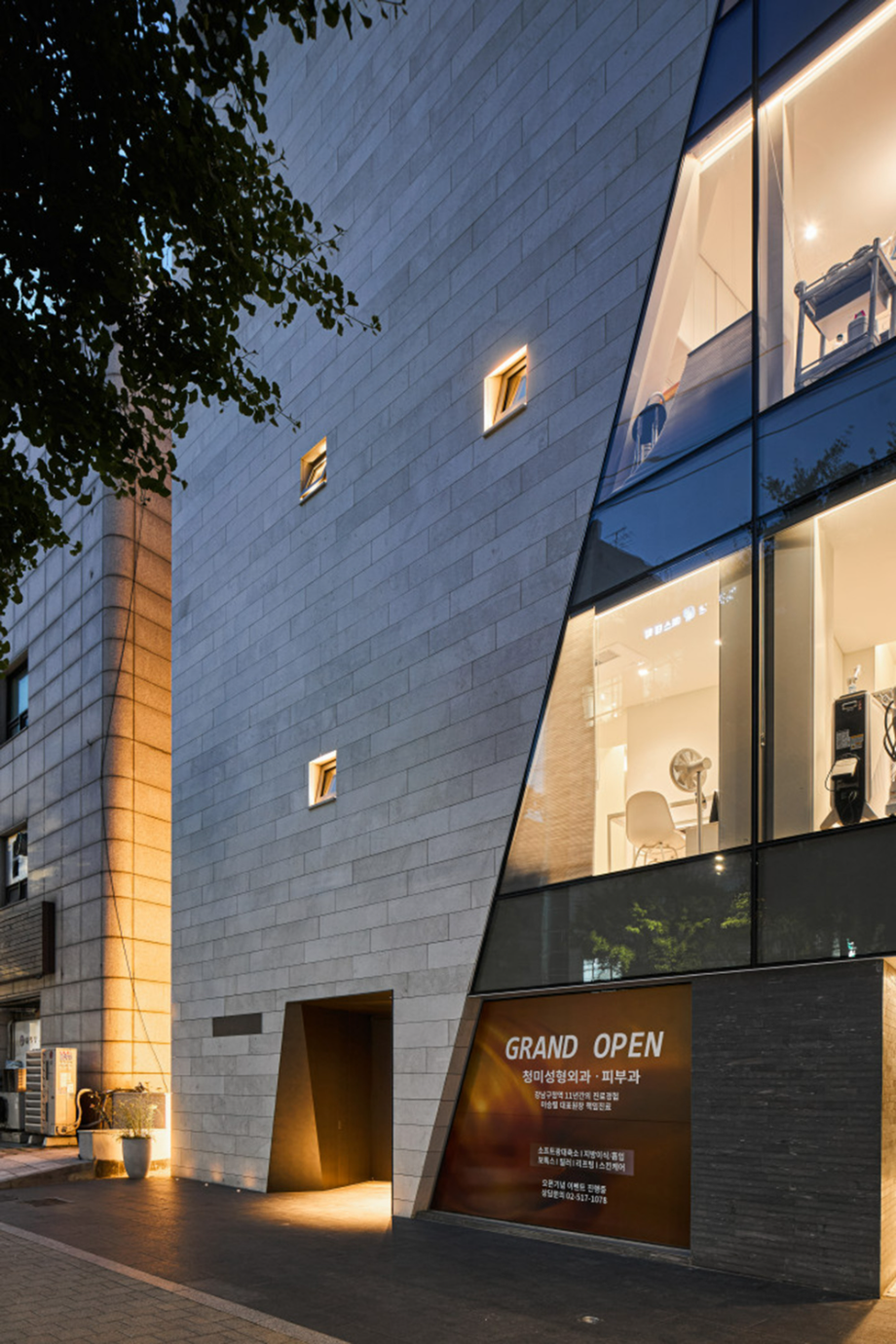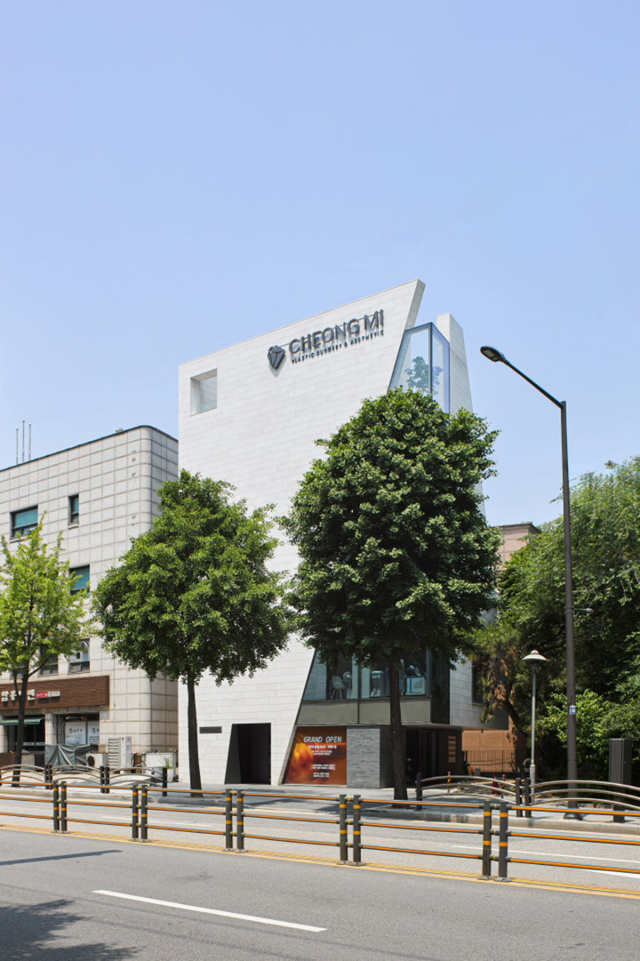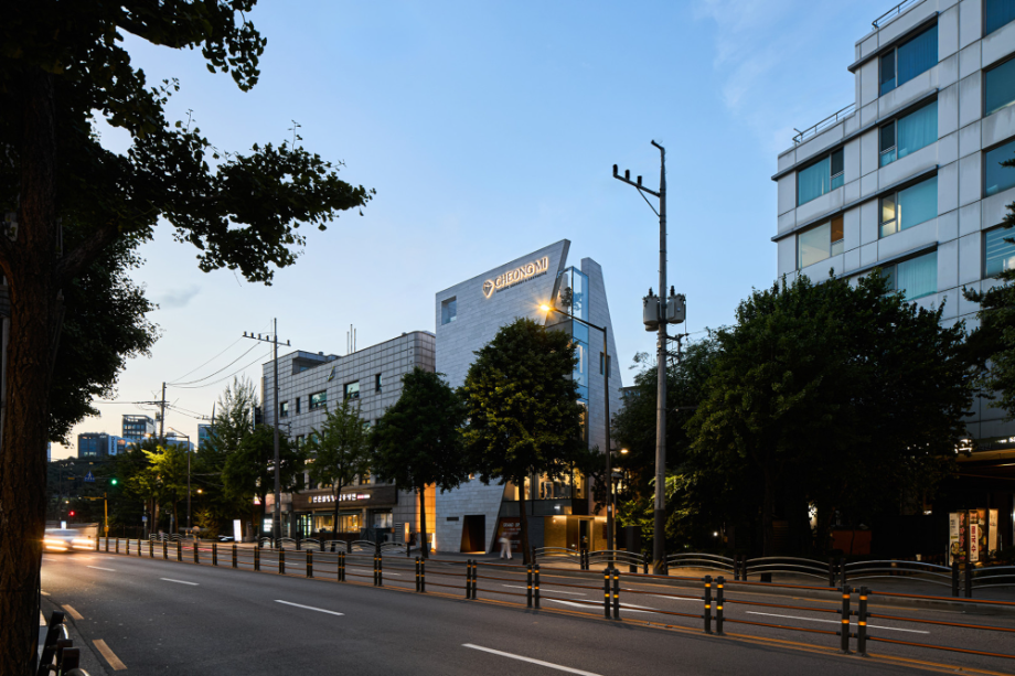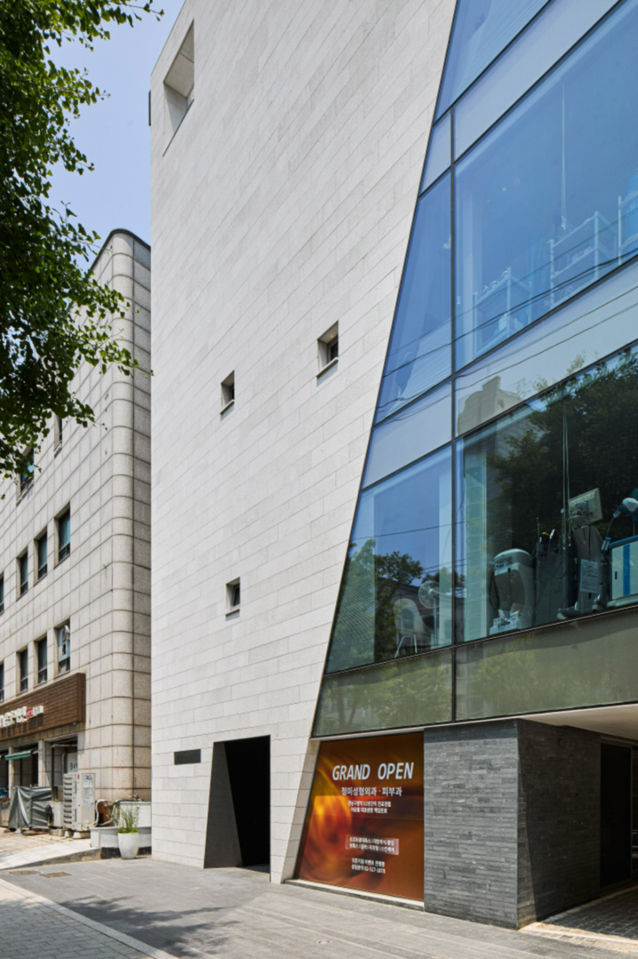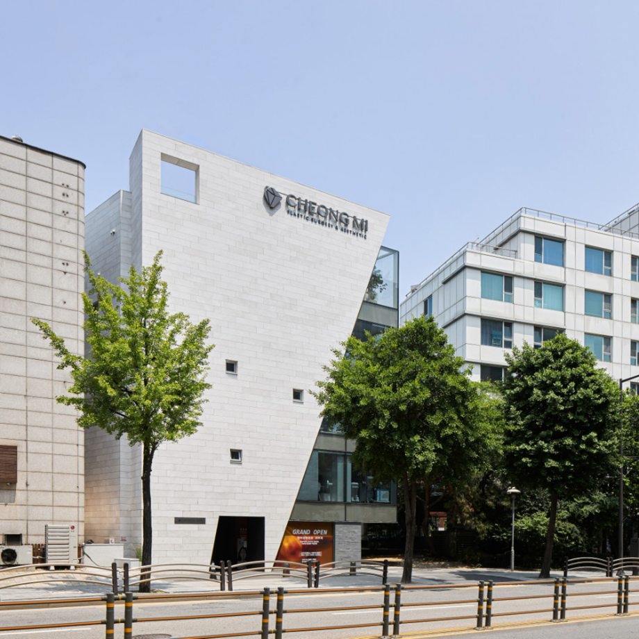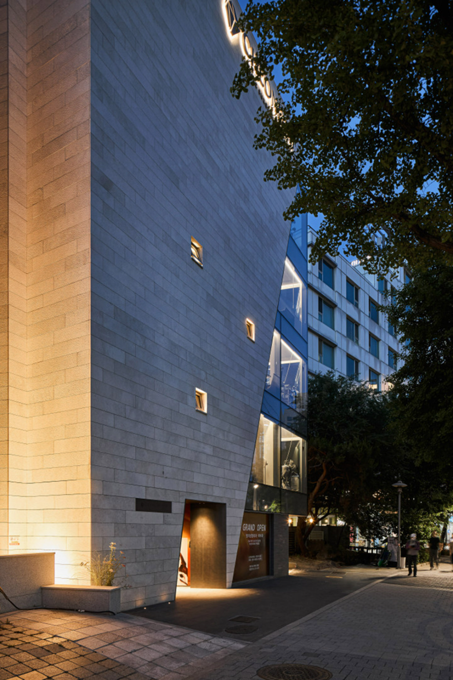 대로변 박스형 건물들 사이에서 존재감을 부여하기 위해서, 우리는 선적인 변화가 있으면서도 하나의 단일체 (Monolith) 느낌이 나는 건물을 만들고자 했다. 건물 배면의 정북일조높이 제한이 만드는 사선을 정면 커튼월에도 적용하여 단일체의 느낌을 강조하도록 하였다. 길을 걷다보면 눈에 띄는 건물 남측 코너부는 커튼월로 계획하여 선릉로를 향한 조망을 확보했다. 선릉로에서 보이는 두 매스 사이의 코너창은 낮에는 도시풍경을 반사시키고 밤에는 내부공간을 투명하게 드러내며 인상적인 표정을 만든다.