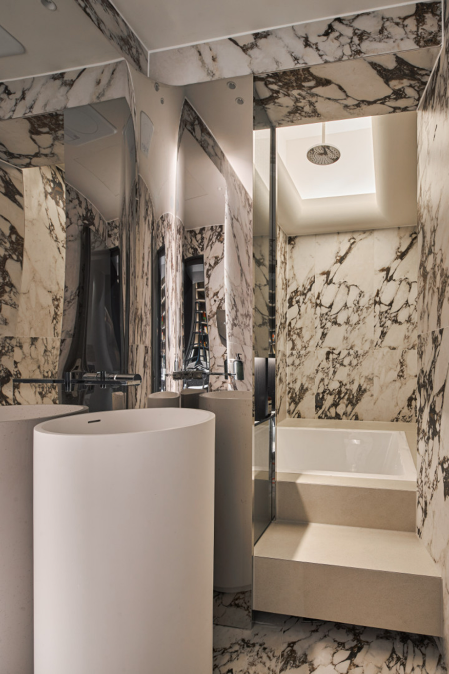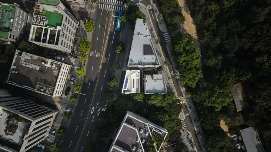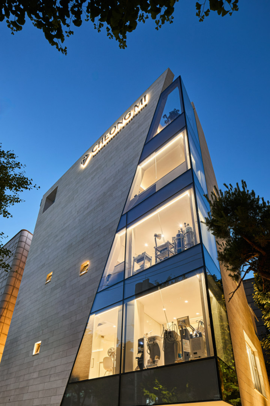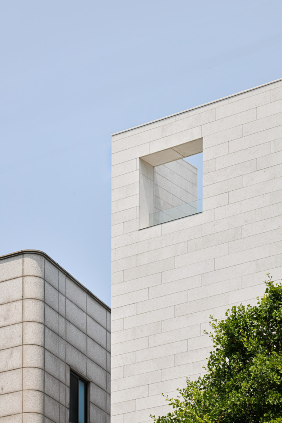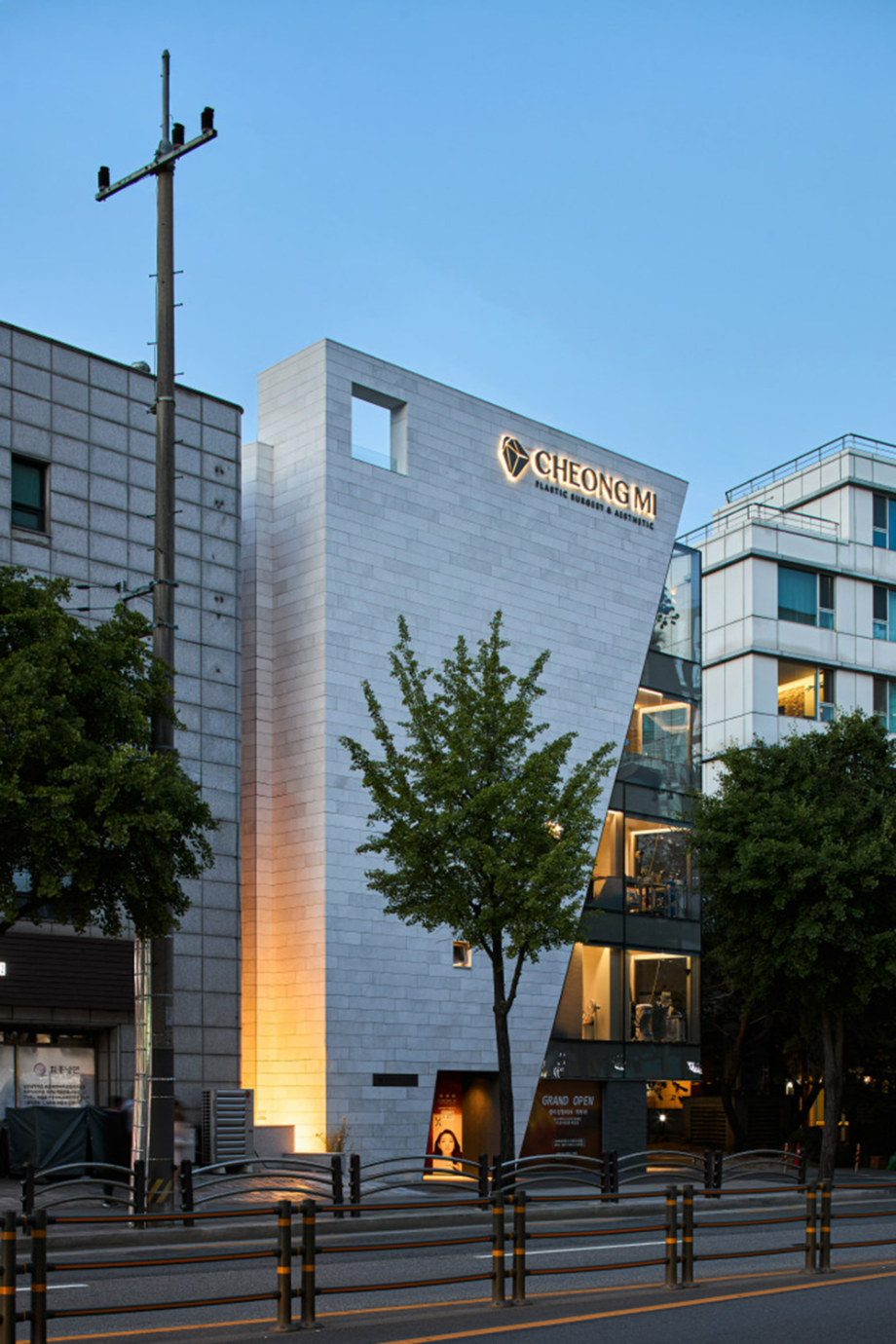 대로변 박스형 건물들 사이에서 존재감을 부여하기 위해서, 우리는 선적인 변화가 있으면서도 하나의 단일체 (Monolith) 느낌이 나는 건물을 만들고자 했다. 건물 배면의 정북일조높이 제한이 만드는 사선을 정면 커튼월에도 적용하여 단일체의 느낌을 강조하도록 하였다. 길을 걷다보면 눈에 띄는 건물 남측 코너부는 커튼월로 계획하여 선릉로를 향한 조망을 확보했다. 선릉로에서 보이는 두 매스 사이의 코너창은 낮에는 도시풍경을 반사시키고 밤에는 내부공간을 투명하게 드러내며 인상적인 표정을 만든다.