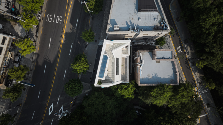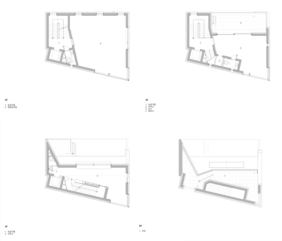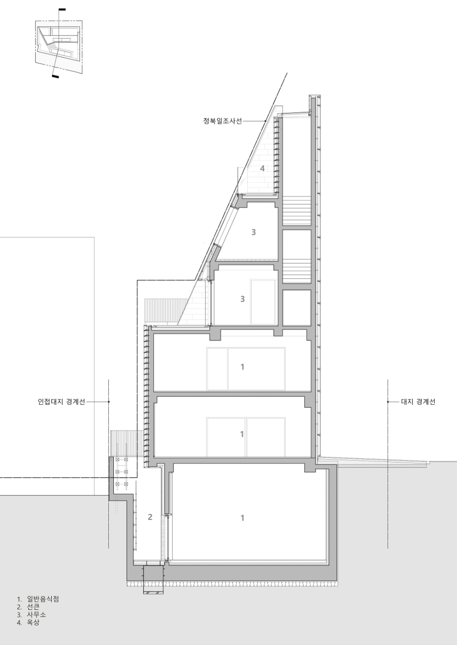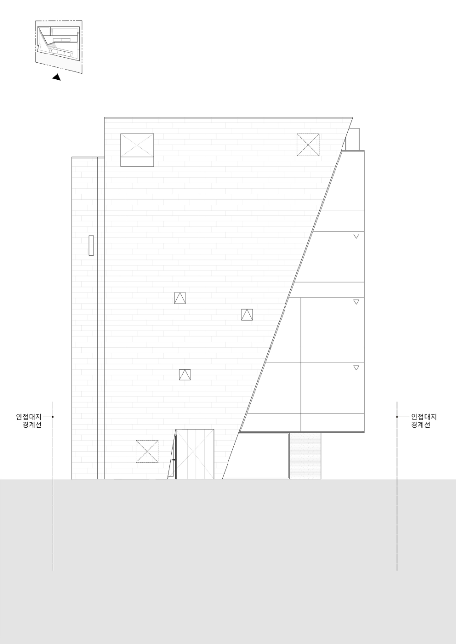 건물의 배면 대부분은 정북일조 높이제한의 영향을 받아서, 3층부터 사용가능한 건물의 볼륨이 매우 제한적이다. 건축주는 최대한의 외부공간을 확보하기를 바랐고, 결과적으로 3층 계단의 상부와 승강기의 상부도 각각 3층의 베란다와 옥상에서 계단으로 연결하여 포켓스페이스로 활용이 가능하도록 했다. 각층의 외부공간들은 동선을 따라다니면서 보이는 전망들은 매우 역동적이며, 건물의 최상부는 선정릉과 선릉로를 동시에 전망할 수 있는 인상적인 곳이 됐다.
