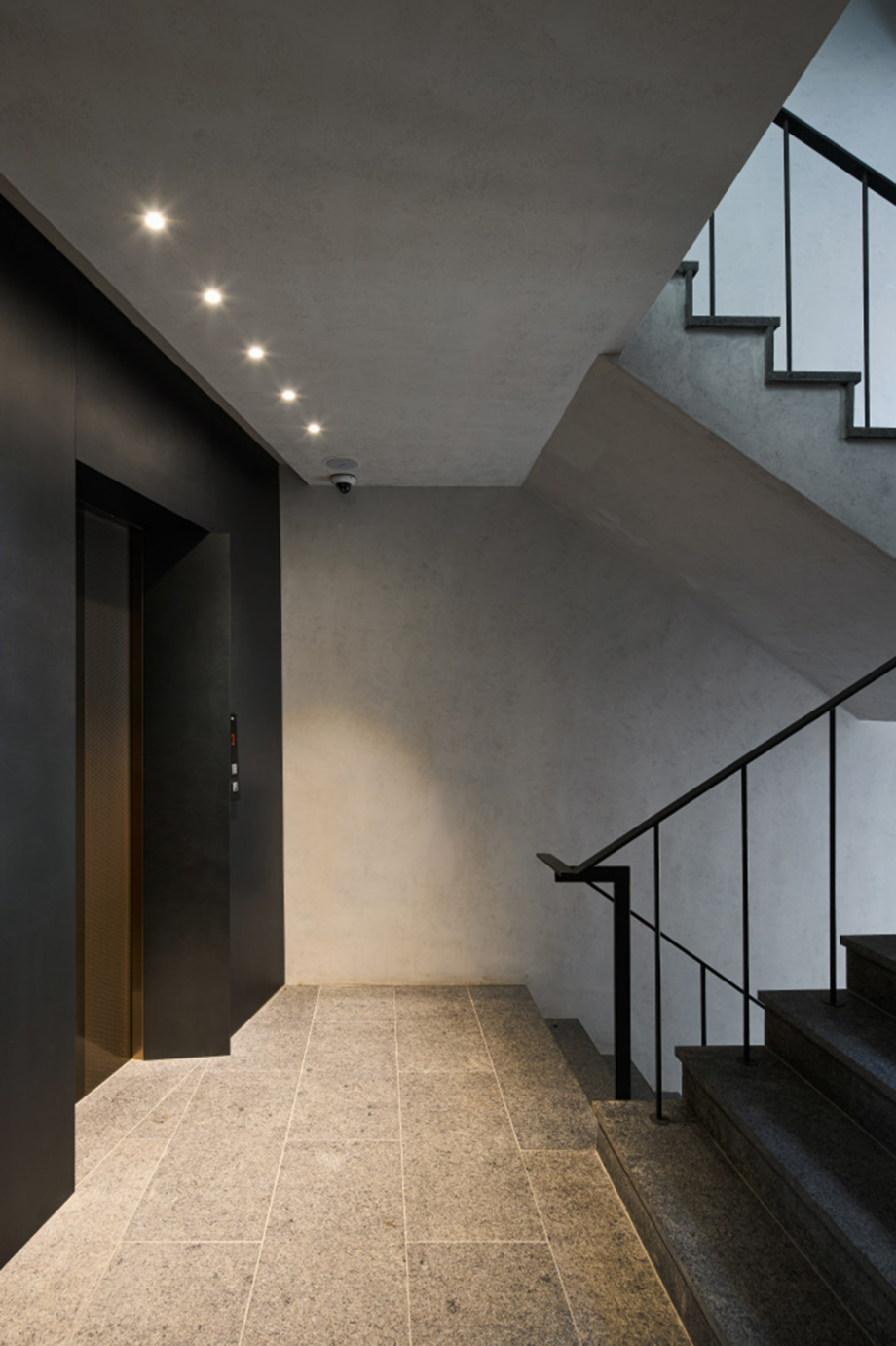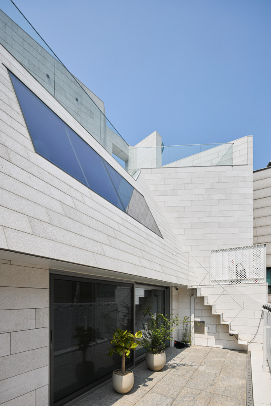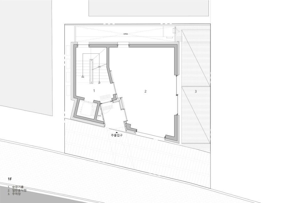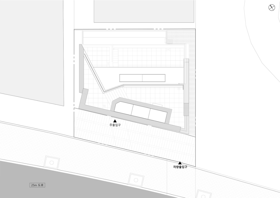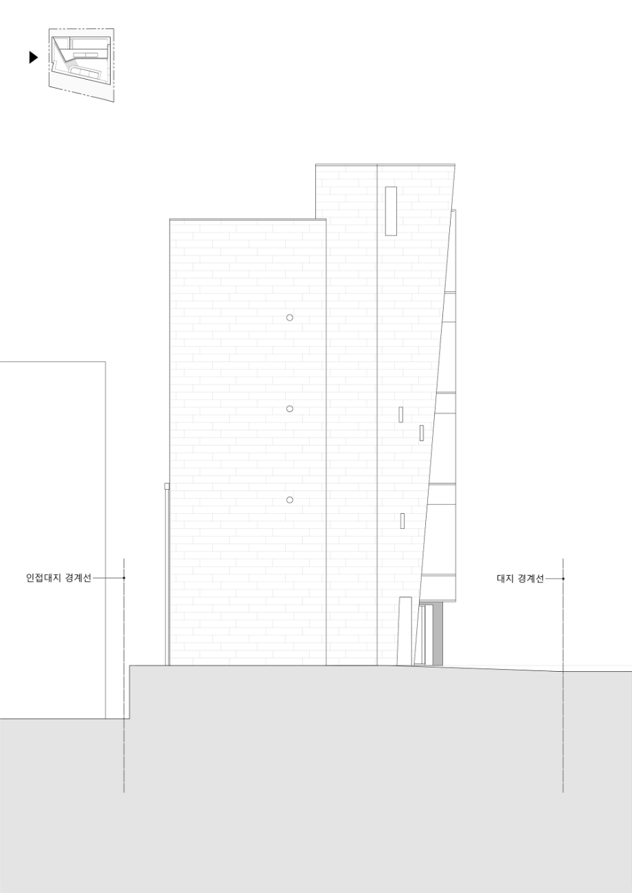 지하층은 손님초대와 개인의 취미활동을 담는 사적인 공간으로 높은 층고를 확보하고 빛을 깊게 드리울 수 있는 선큰공간을 두었다. 내부의 직통 계단은 외부 공간만큼이나 역동적인 구성으로 옥상까지 이어지도록 했다. 계단참마다 다양한 크기의 창을 두어 이동함에 따라 변화하는 빛과 풍경을 즐길 수 있는 재미있는 공간으로 계획했고, 옥탑으로 향하는 계단은 전면 천창을 계획하여 쾌적함을 배가했다. 건물의 입구는 '모노리스'라는 조형 컨셉을 고려하여, . 돌출된 캐노피나 장식적인 요소를 없애고, 동굴로 들어가는 입구처럼 그림자를 드리우고 사선을 활용하여 시선과 동선을 자연스럽게 내부로 끌어들일 수 있도록 했다.◼︎
