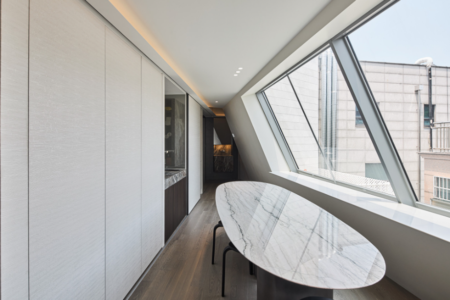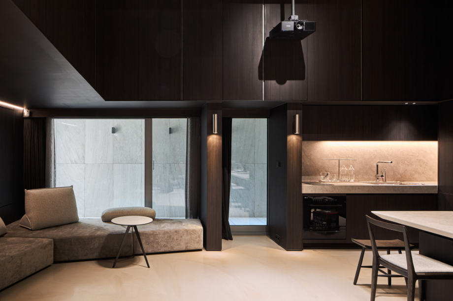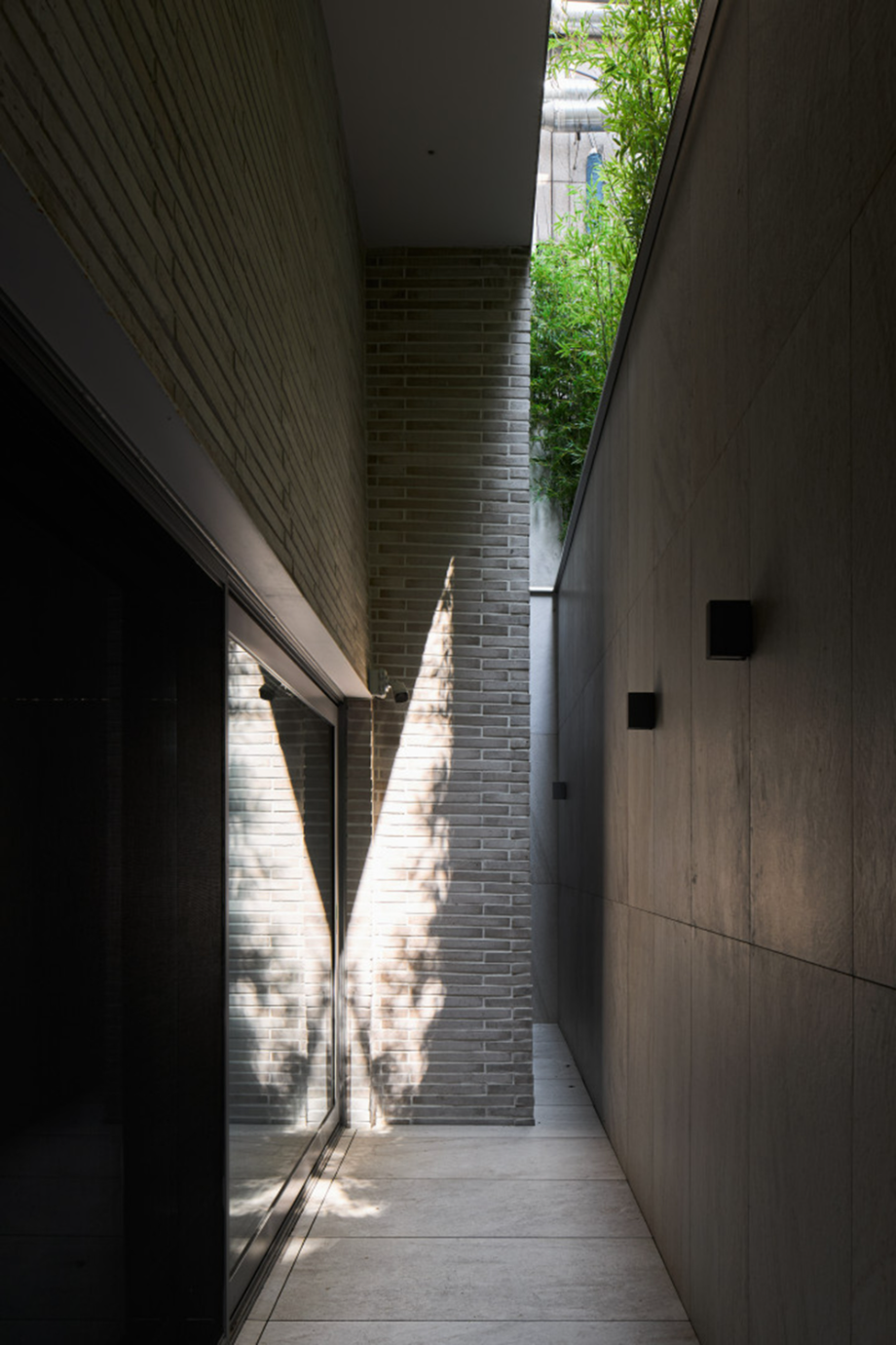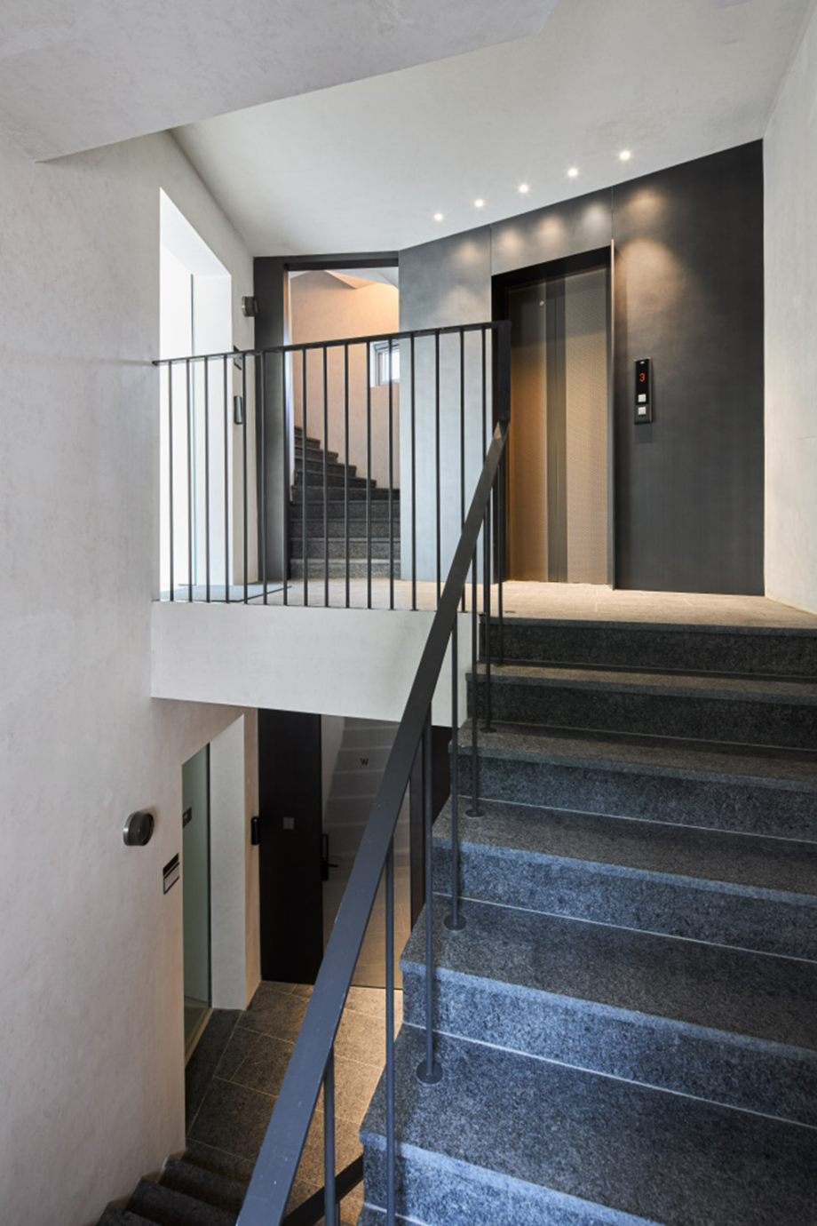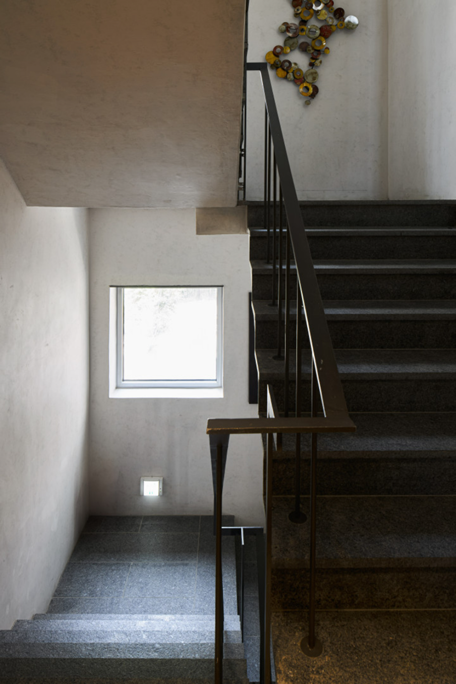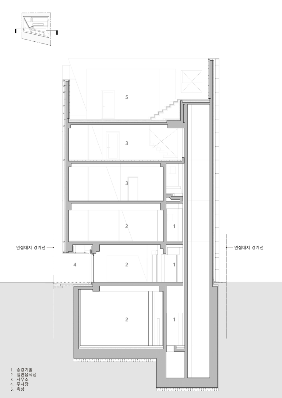 지하층은 손님초대와 개인의 취미활동을 담는 사적인 공간으로 높은 층고를 확보하고 빛을 깊게 드리울 수 있는 선큰공간을 두었다. 내부의 직통 계단은 외부 공간만큼이나 역동적인 구성으로 옥상까지 이어지도록 했다. 계단참마다 다양한 크기의 창을 두어 이동함에 따라 변화하는 빛과 풍경을 즐길 수 있는 재미있는 공간으로 계획했고, 옥탑으로 향하는 계단은 전면 천창을 계획하여 쾌적함을 배가했다. 건물의 입구는 '모노리스'라는 조형 컨셉을 고려하여, . 돌출된 캐노피나 장식적인 요소를 없애고, 동굴로 들어가는 입구처럼 그림자를 드리우고 사선을 활용하여 시선과 동선을 자연스럽게 내부로 끌어들일 수 있도록 했다.◼︎