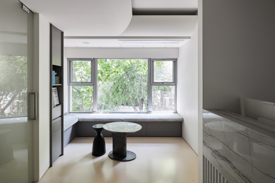기본적으로 수풀이 우거진 대지의 남측으로 액자처럼 커다란 프레임의 창을 두어 그림같은 풍경을 담았고, 배면의 테라스를 향해 통창과 슬라이딩창을 두어 개방적인 느낌을 주었다. 건물의 큰 창들이 배면과 측면의 자연을 향해 열려있다 보니 정면은 상대적으로 꼭 필요한 위치에 작은 환기용 창을 내었다. 랜덤하게 배치된 작은 창들은 하나의 덩어리 컨셉인 '모노리스'를 강조하며 자유로운 느낌을 부여한다.