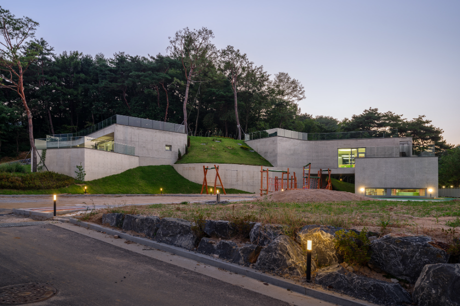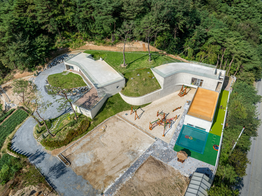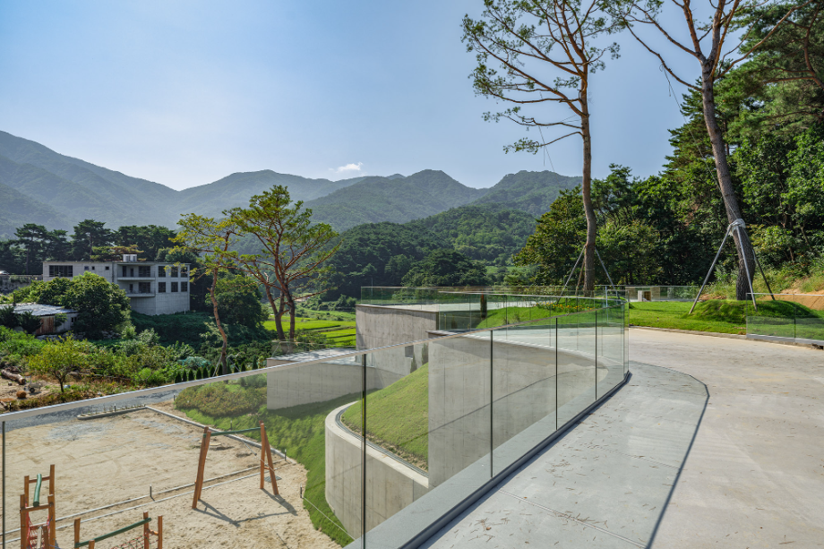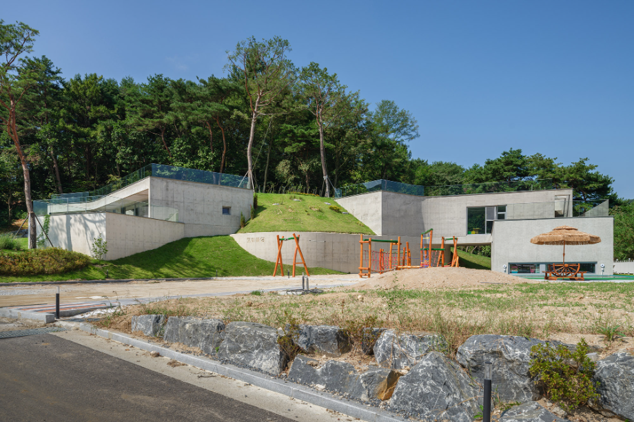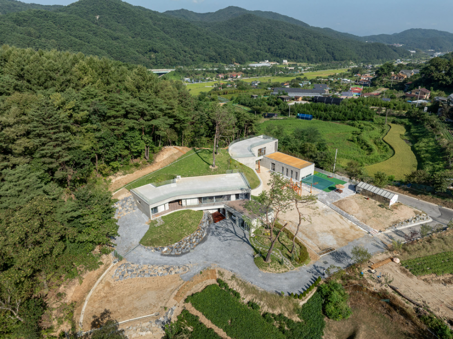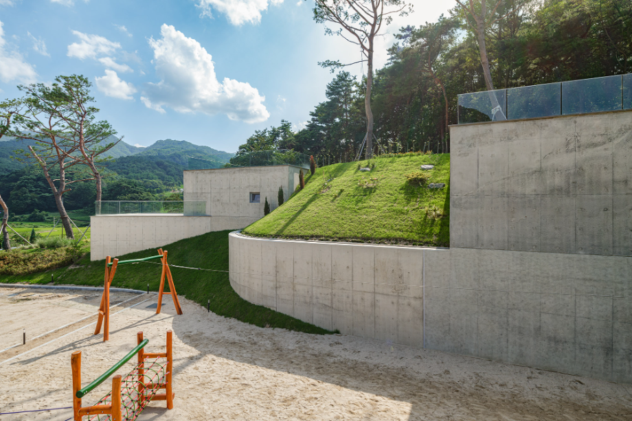 곡면으로 이어진 지붕에는 흙을 덮어 지형과의 연결을 시도했고, 벽체에는 절제된 개구부만을 허용해 형태의 흐름이 방해받지 않도록 했다. 자연에 개입된 건축의 존재감이 지나치게 앞서지 않도록 하기 위한 의도였다. 특히 상담센터의 매스는 경사면으로부터 조용히 띄워져 있다. 이 띄움은 물리적인 해법이기도 하지만, 결국에는 ‘존재의 거리두기’에 관한 건축적 태도다. 건축이 중심에 서기보다는 배경에 물러나, 사용자와 풍경 사이를 조심스레 매개하려는 시도이다.