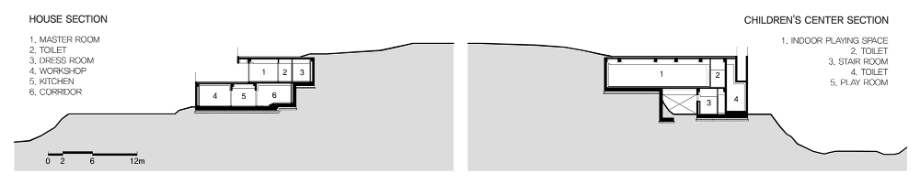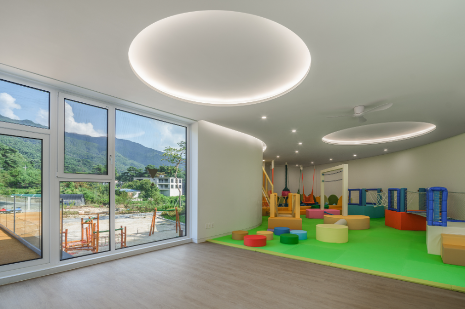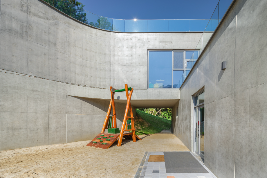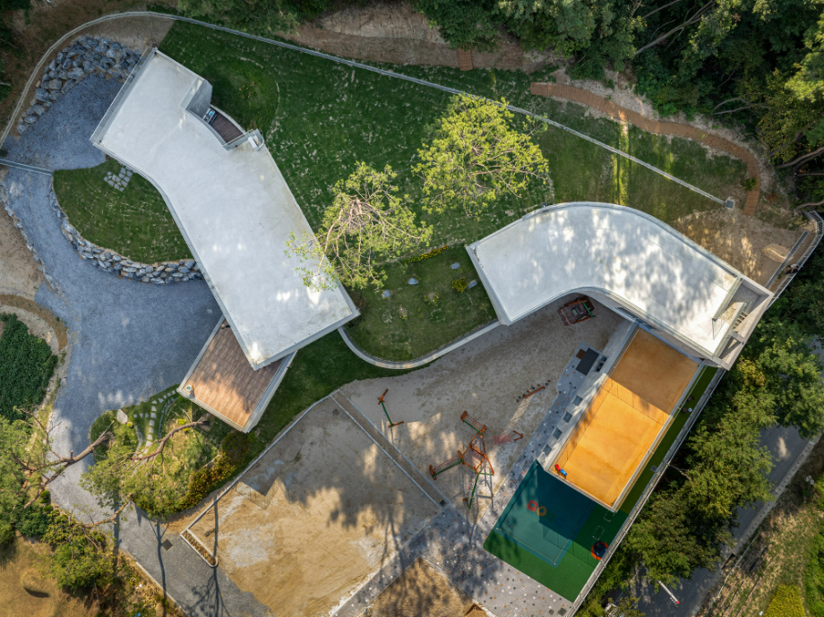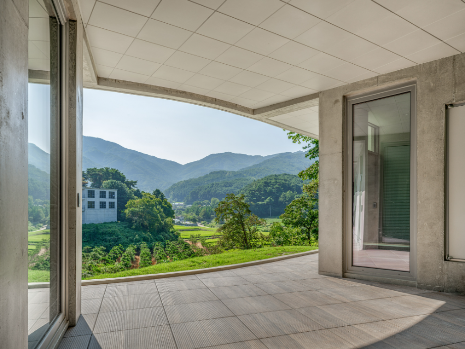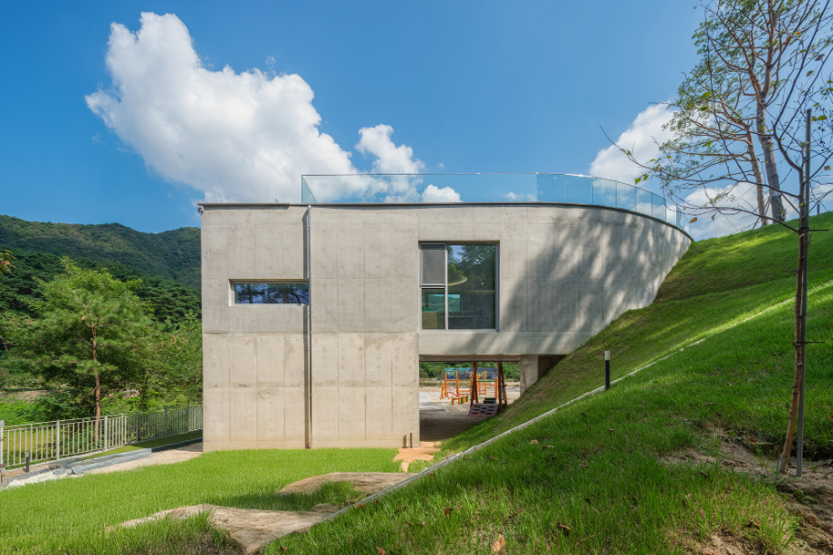 곡면으로 이어진 지붕에는 흙을 덮어 지형과의 연결을 시도했고, 벽체에는 절제된 개구부만을 허용해 형태의 흐름이 방해받지 않도록 했다. 자연에 개입된 건축의 존재감이 지나치게 앞서지 않도록 하기 위한 의도였다. 특히 상담센터의 매스는 경사면으로부터 조용히 띄워져 있다. 이 띄움은 물리적인 해법이기도 하지만, 결국에는 ‘존재의 거리두기’에 관한 건축적 태도다. 건축이 중심에 서기보다는 배경에 물러나, 사용자와 풍경 사이를 조심스레 매개하려는 시도이다.