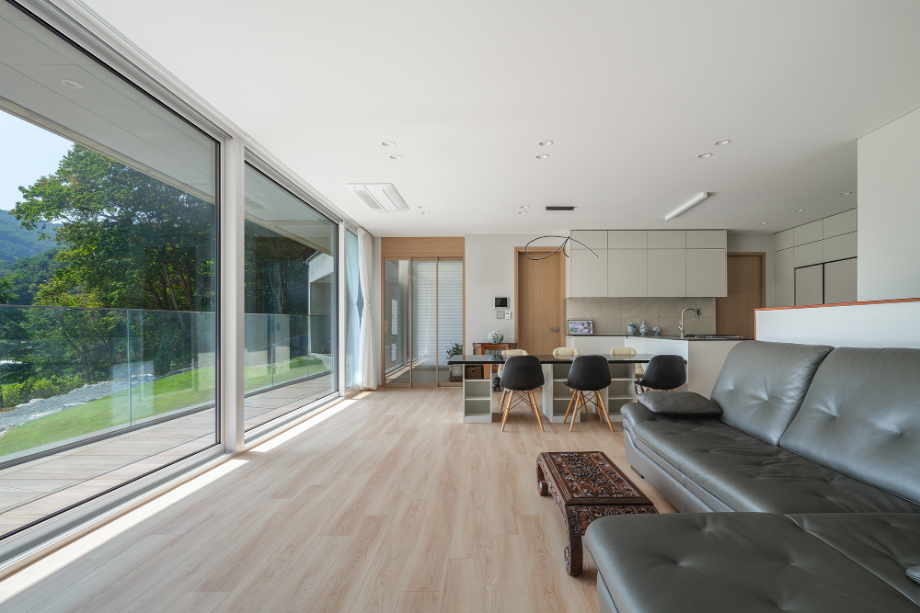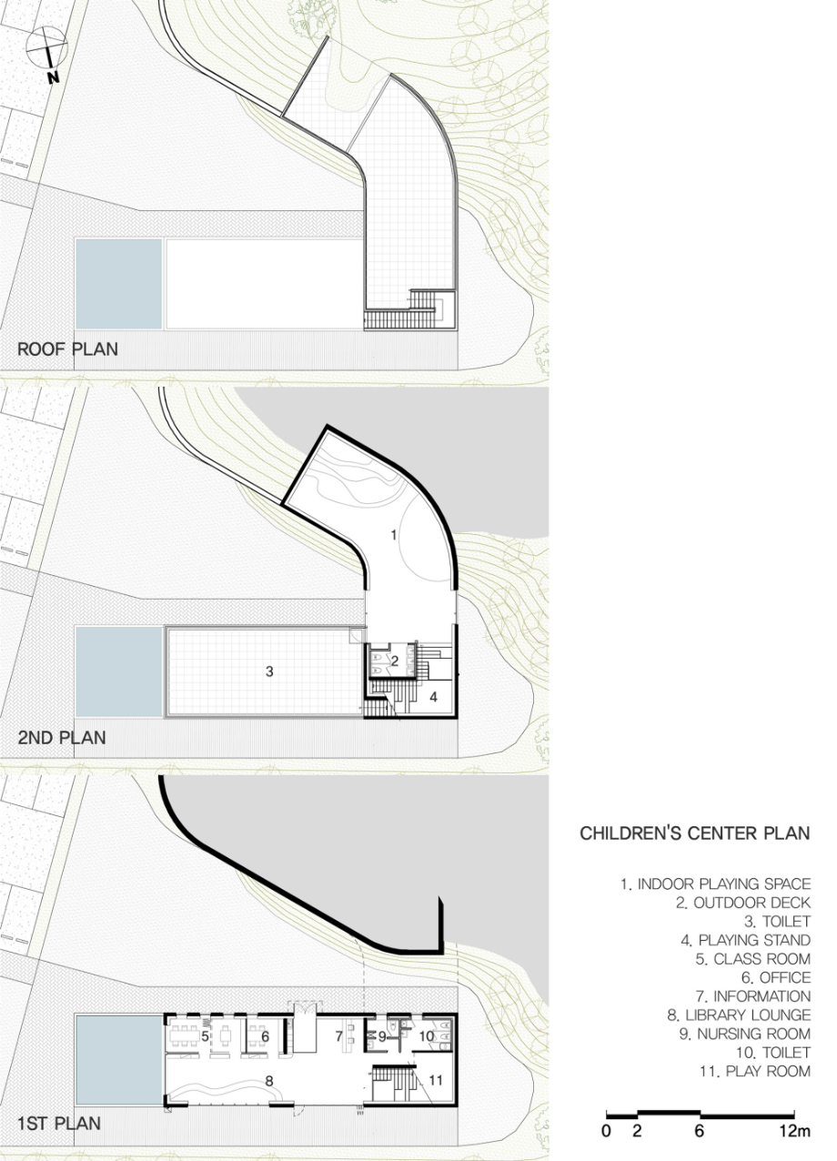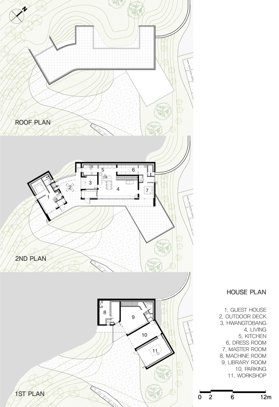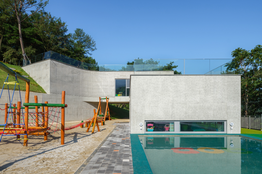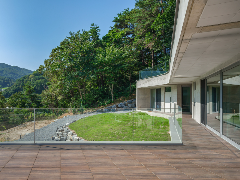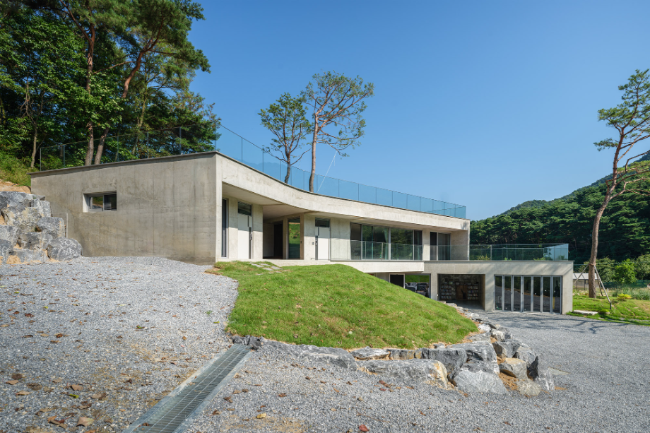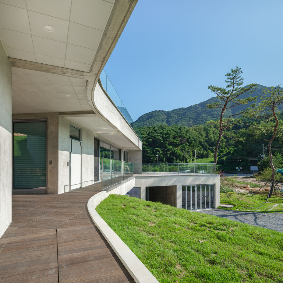 사람이 드나드는 쪽의 매스는 비교적 직선적이다. 그러나 땅과 맞닿는 경사면에서는 점차 곡선을 취한다. 이 변화는 지형의 흐름을 수용하려는 ‘형태의 배려’이며, 건축과 자연의 간극을 조용히 조율하고자 한 태도였다. 우리는 구체적인 조형보다는, 사용자의 움직임 속에서 감지되는 리듬감을 더 중요하게 여겼다.