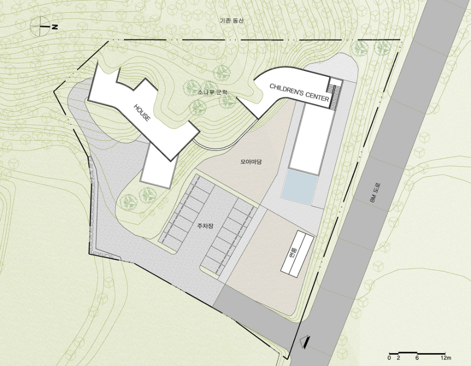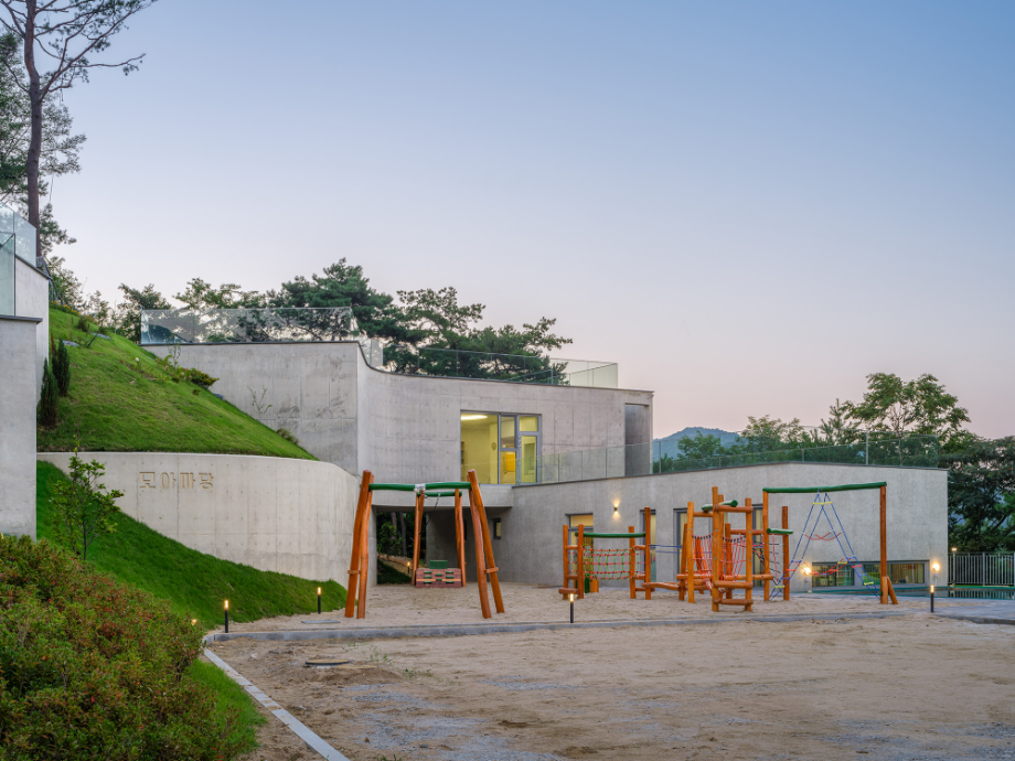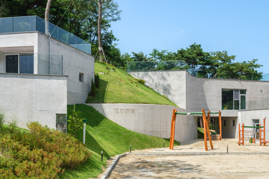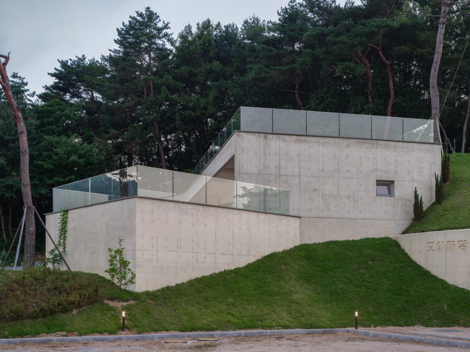 ‘모아마당’은 엄마와 아이가 만나는 마당이라는 뜻을 품고 있다. 건물은 두 개의 매스로 나뉘어, 동산의 흐름을 따라 조심스레 놓인다. 하나는 부부가 거주하는 공간, 다른 하나는 아이들을 위한 상담공간이다. 두 매스 사이에는 낮은 마당이 자리하며, 건축과 마당, 그리고 지형의 흐름이 서로 스며들듯 겹쳐진다.