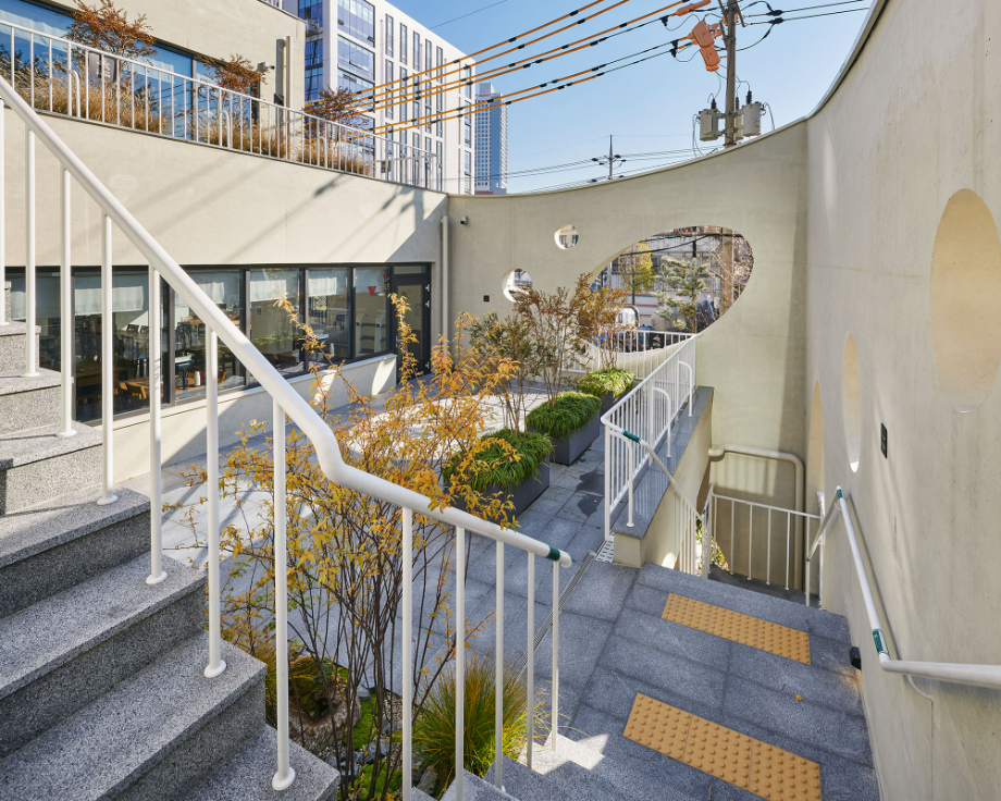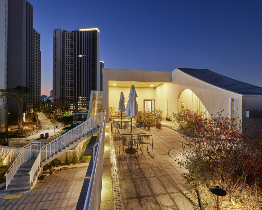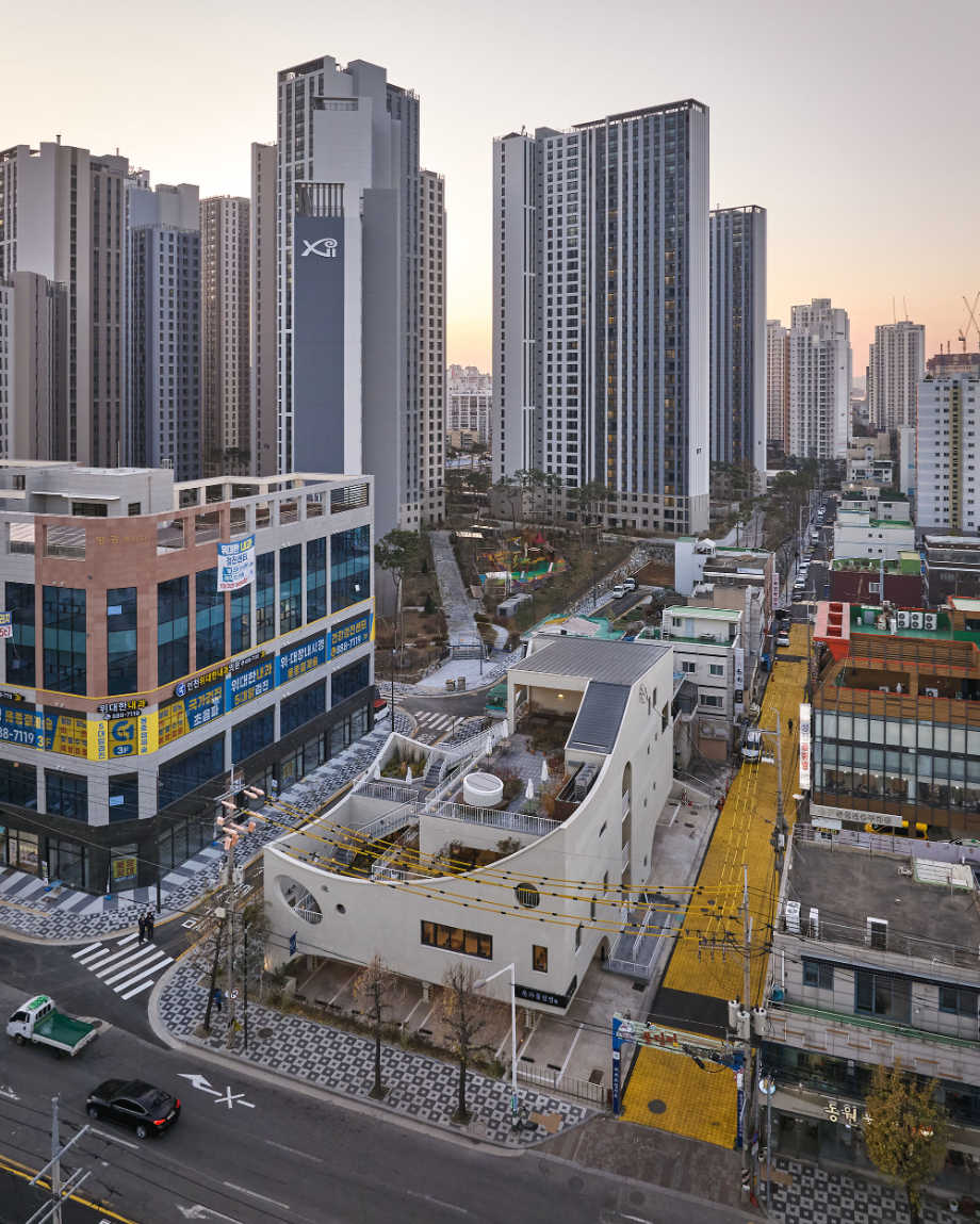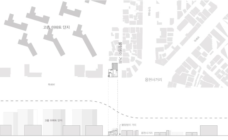 오래된 음식거리와 재개발 단지의 경계에서 이 둘 을 어색하지 않게 조우할 수 있게 해주는 것 같다. 이 땅의 쓰임을 남김 없이 다 사용하였더라면 볼 수 없는 장면이였을 것이다. 오히려 낮은 밀도로 지역적 위상을 꽉 채워 드러내는 것이라고 생각했다. 이 장소에서 새로 입주하는 아파트 주민들에게 기존 상권의 건재함을 알리고 일상의 커뮤니티 공간으로서 작동되길 희망해 본다.◼︎