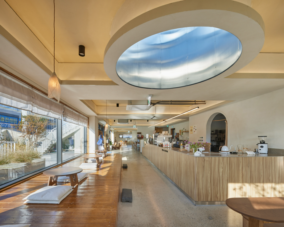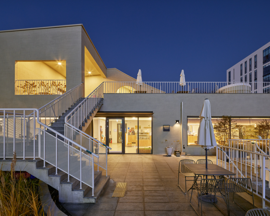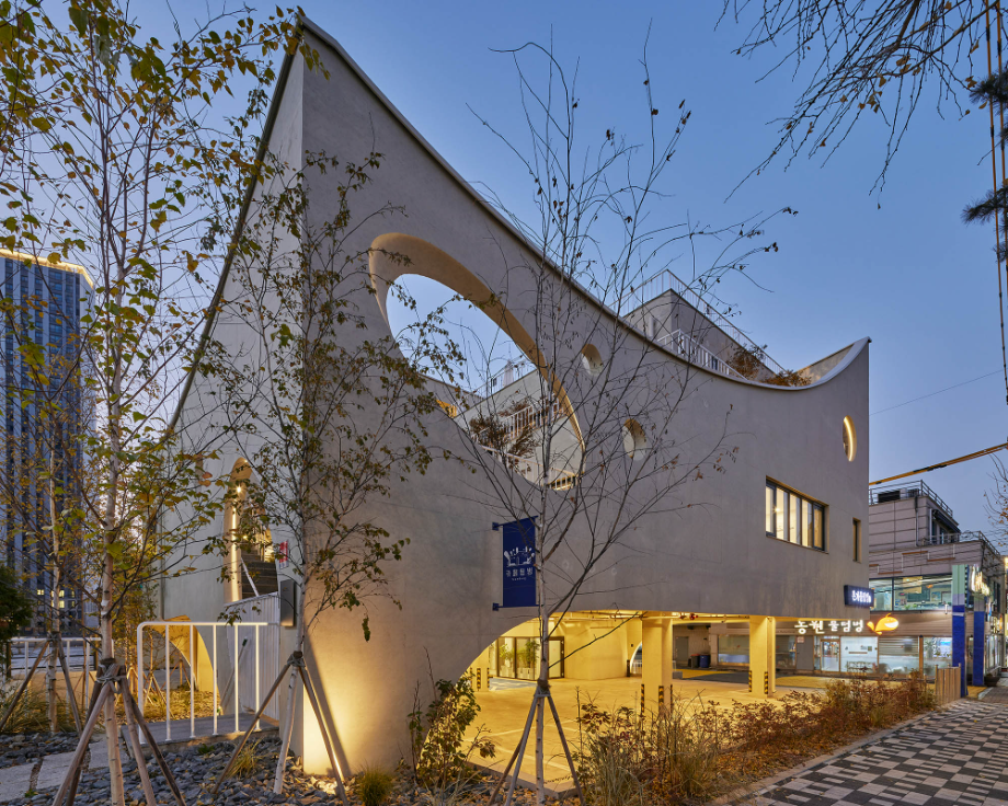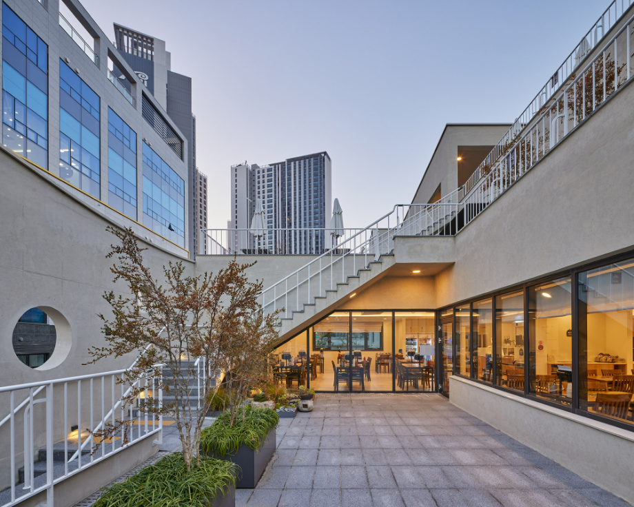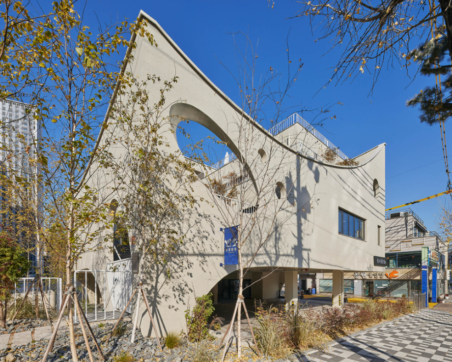 오래된 음식거리와 재개발 단지의 경계에서 이 둘 을 어색하지 않게 조우할 수 있게 해주는 것 같다. 이 땅의 쓰임을 남김 없이 다 사용하였더라면 볼 수 없는 장면이였을 것이다. 오히려 낮은 밀도로 지역적 위상을 꽉 채워 드러내는 것이라고 생각했다. 이 장소에서 새로 입주하는 아파트 주민들에게 기존 상권의 건재함을 알리고 일상의 커뮤니티 공간으로서 작동되길 희망해 본다.◼︎