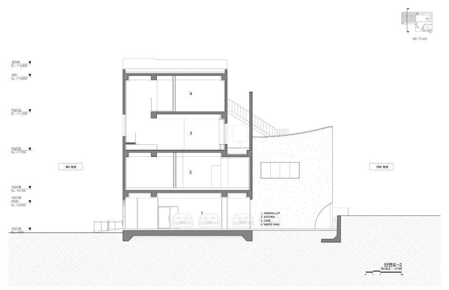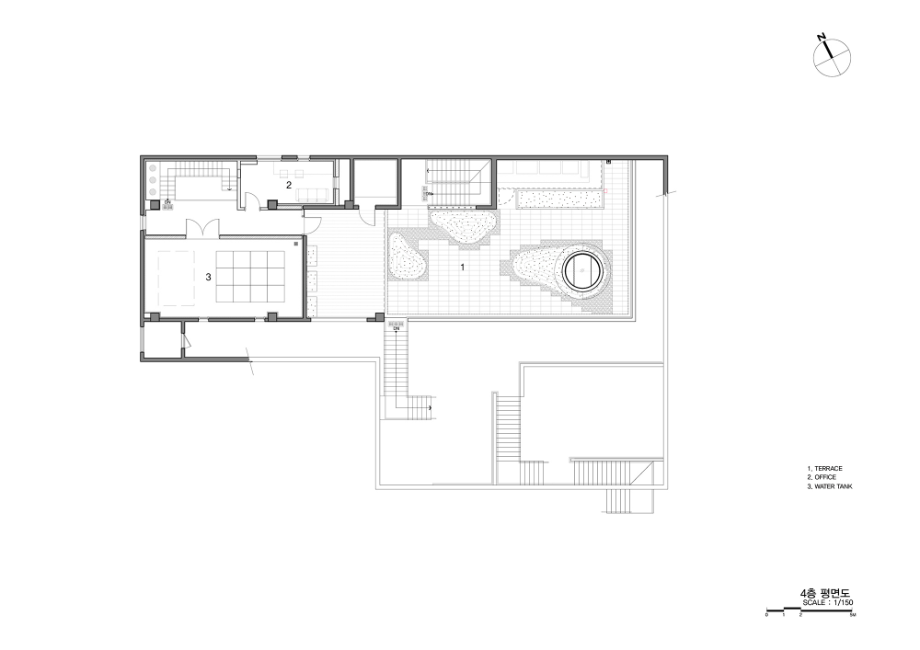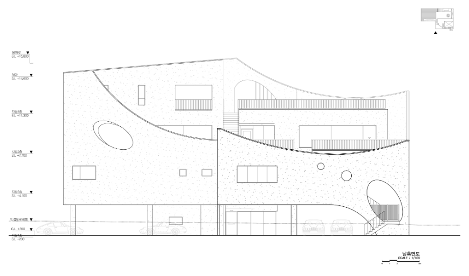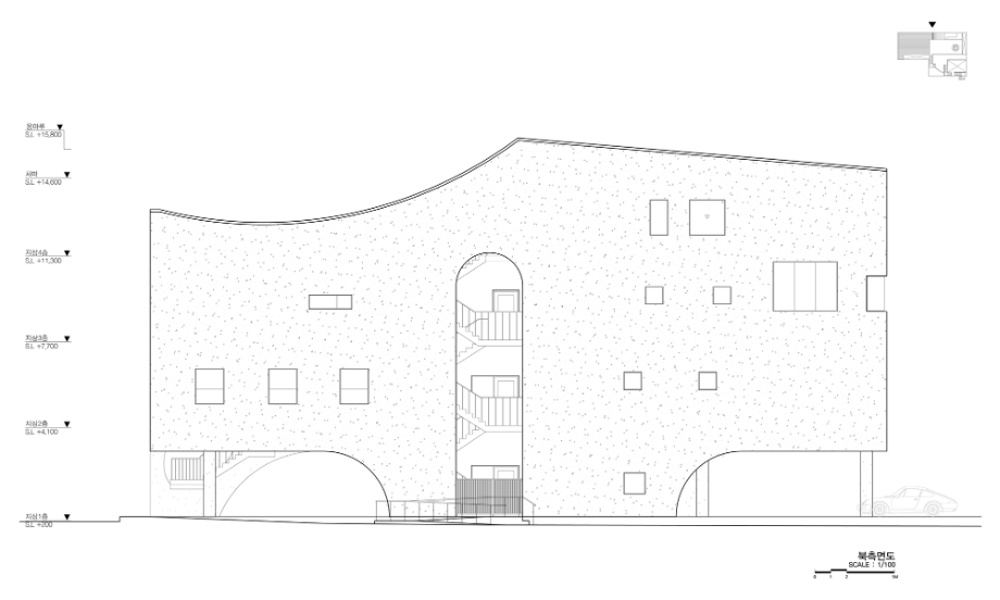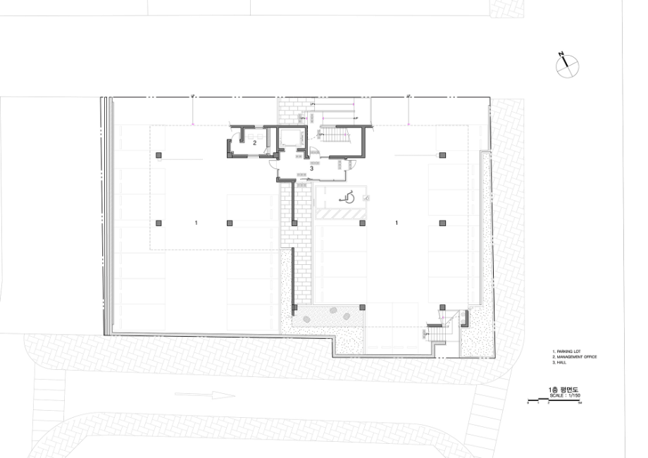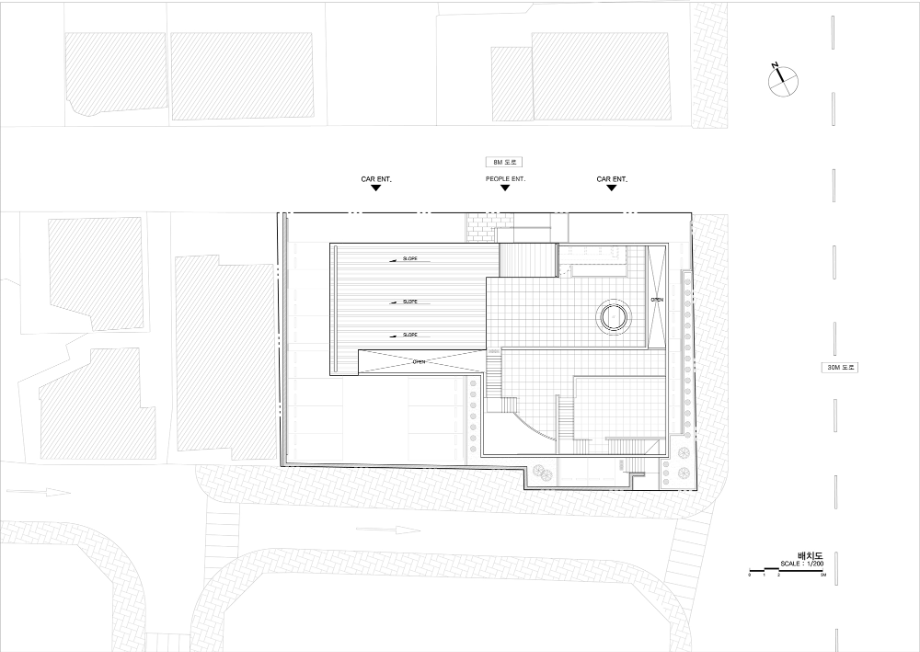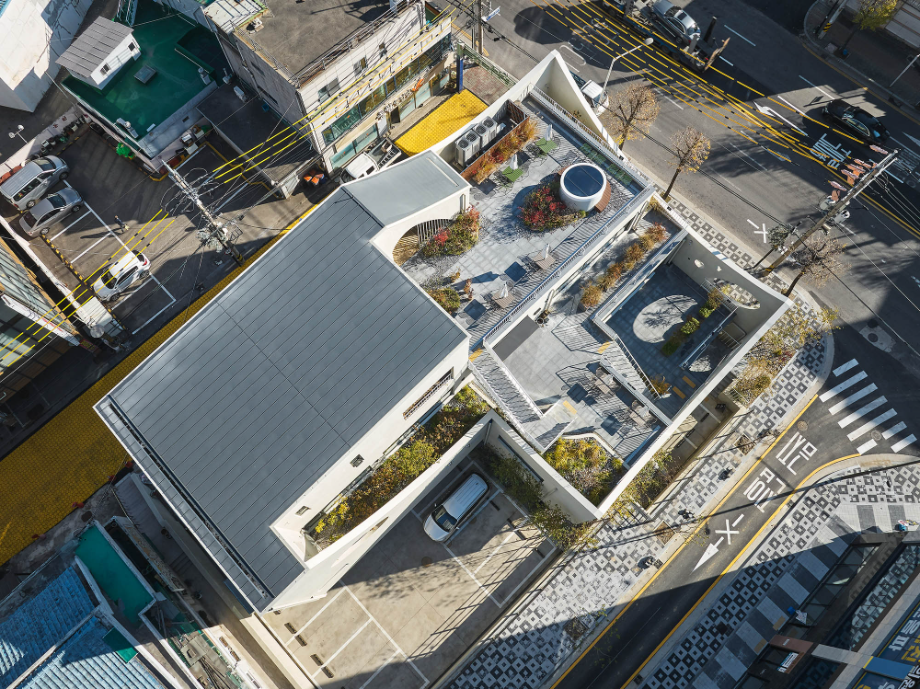 비교적 넓은 대지면적을 가지고 있고 250%라는 용적률을 사용할수 있었지만 100%도 안되는 용적률로 채운 낮은 밀도는 주변에 용적율을 다 사용하고 높게 지어지는 신축 건물들과는 확연히 다르다. 신축의 목적이 부동산 개발을 통한 임대의 목적이 아니기 때문에 오히려 실 사용목적에 맞게 적정규모와 밀도로 채울수 있었기에 건축적인 해석의 여지를 가질수 있었다.