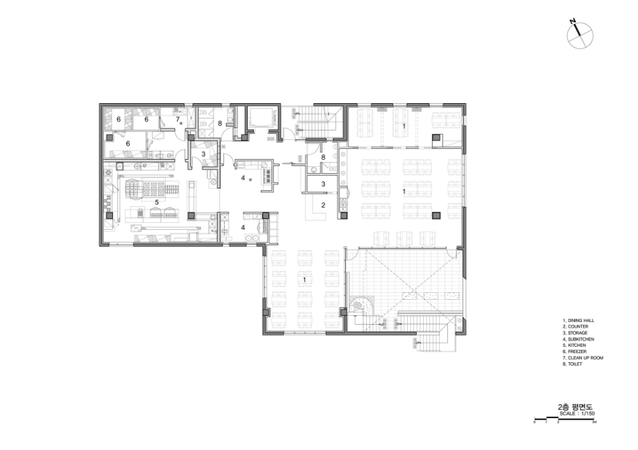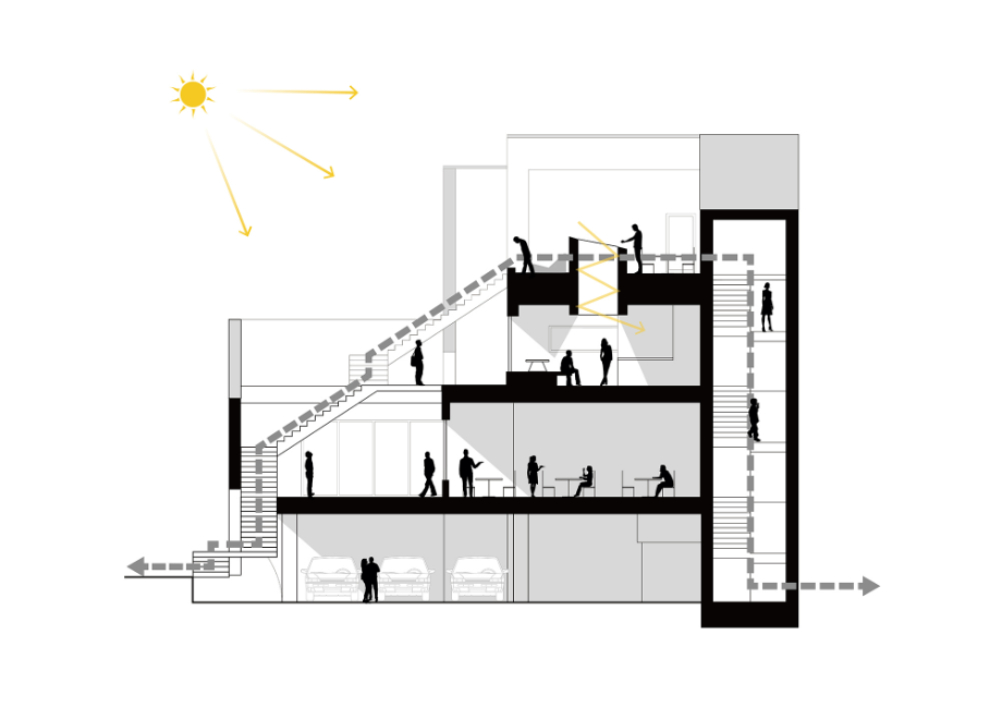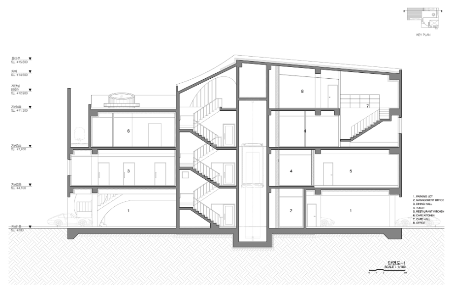 단순한 사각 형태의 평면이지만 기능을 구성하는데 있어서는 가장 효율적이다. 많은 수의 주차 댓수와 넓은 홀, 넓은 주방, 간결한 수직동선, 층마다 넓은 테라스 외부공간, 불특정 다수가 사용하는 다중이용업소에 필수적인 피난동선을 구성하는데 있어서 의심할 여지가 없는 평면의 형태이다.