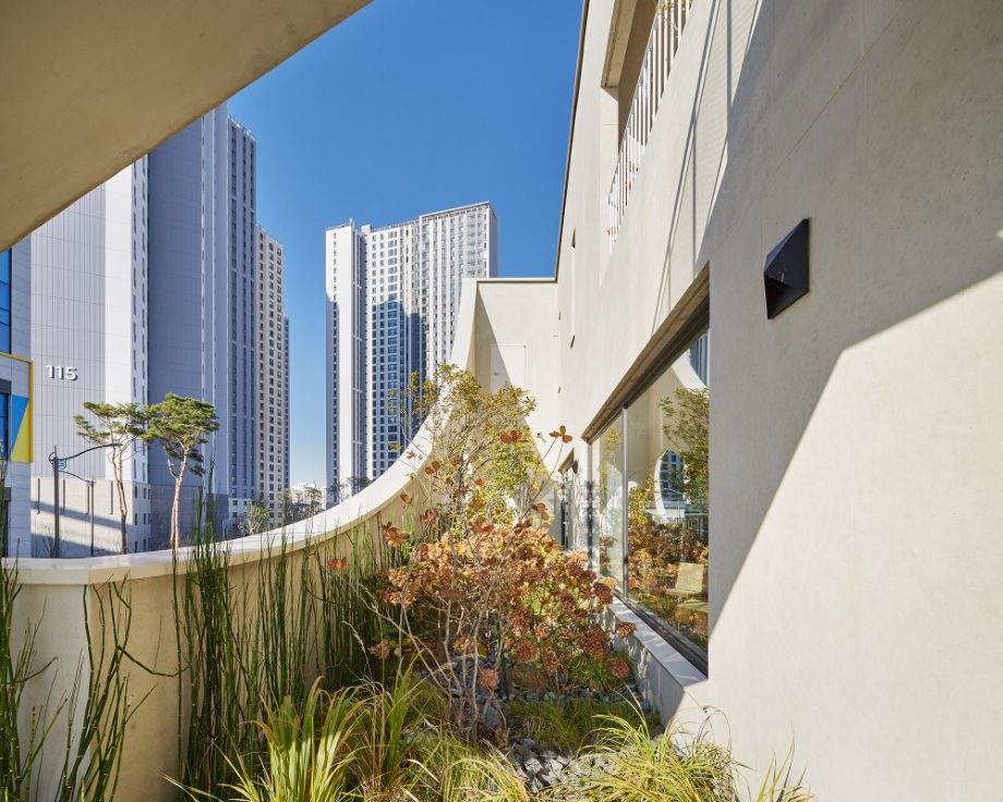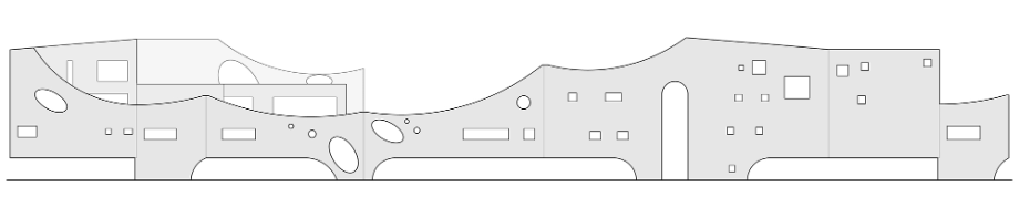 하지만 가로에서 보이는 외벽의 형태구성은 이들을 적당히 감춰주고 드러낸다. 벽이라는 단어에서 바로 떠오르는 재료의 물성은 여지 없이 콘크리트의 질감이다. 건축물의 외벽이 계속적으로 이어져 건물의 속살과 외부공간을 감추고 드러내는 벽으로서 또 다른 기능을 가지고 있고 이는 도시 가로변에 새로운 긴장감을 가져다 주는 디자인적 요소이다.