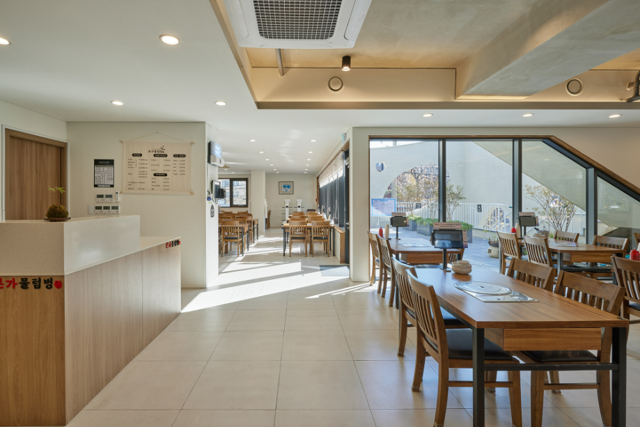 물텀벙이라는 단어에서는 소리도 들리지만, 그 형태를 연상시킨다. 의뢰인 가족이 20년 넘게 운영해 온 음식점의 이름이기도 하였고 임대형 건축물이 아닌 분명한 사업목적을 가진 건축물이었다. 기존에 운영하던 식당을 재구성하는 것에 더해 자제분들이 직접 운영할 카페까지 포함된 프로그램으로 신축하여야 했기에 건축물의 파사드를 구성함 에 있어 상징성을 고민하게 된다.