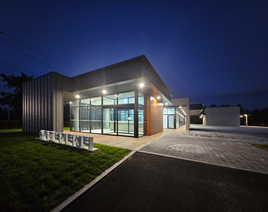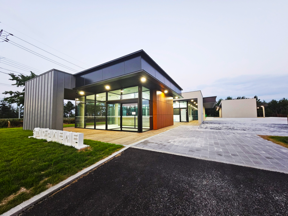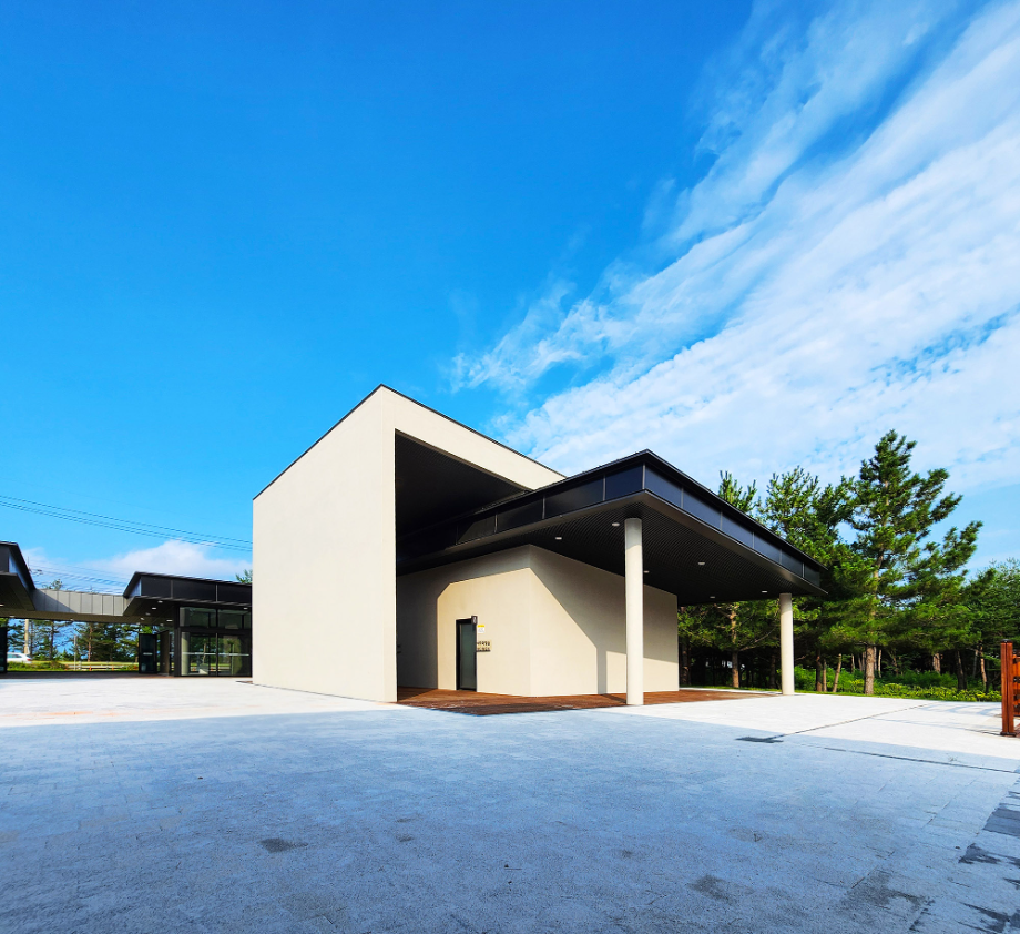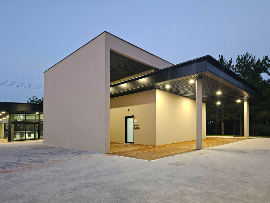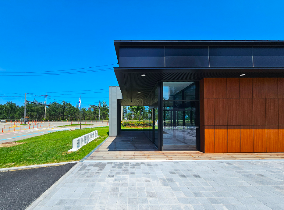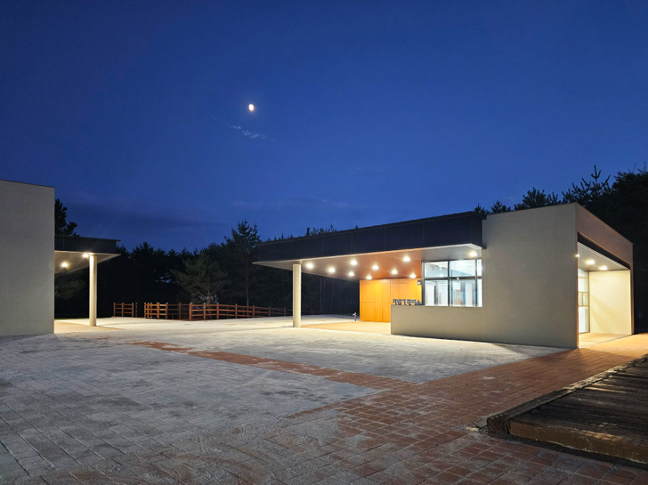 숲과 호수, 바다가 한 시선에 겹쳐지는 송지호의 지형 위에 낮고 긴 건물이 자리한다. 송지호 방문자센터는 자연으로 들어가기 직전, 잠시 머무는 경계의 공간으로 계획됐다. 단순한 안내소의 역할을 넘어, 사람과 자연이 만나는 전이의 무대이자 풍경의 일부로 존재한다.