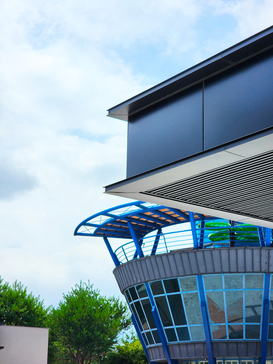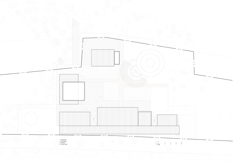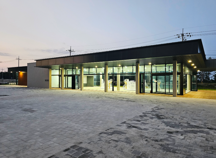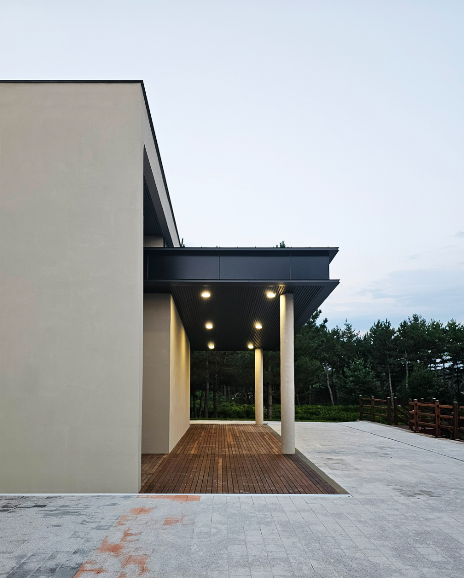 건물의 형태는 하나의 수평선처럼 정제되어 주변의 윤곽선과 맞닿는다. 땅에서 지붕으로 이어지는 벽체와 긴 처마, 필로티는 개방과 차단을 조율하며 보행의 흐름을 음영 속으로 이끈다. 낮고 단정한 매스는 경관을 방해하지 않고, 오히려 풍경을 담아내는 액자처럼 작동한다.