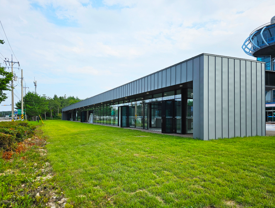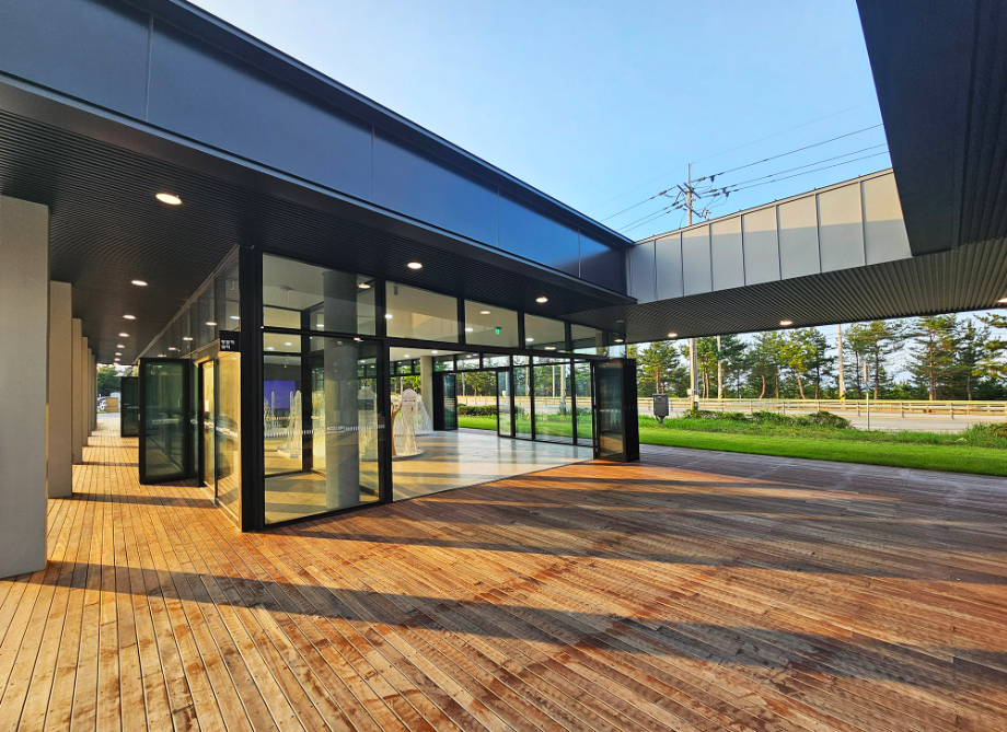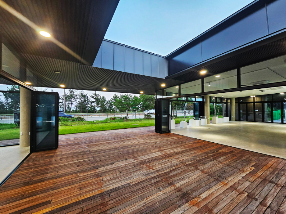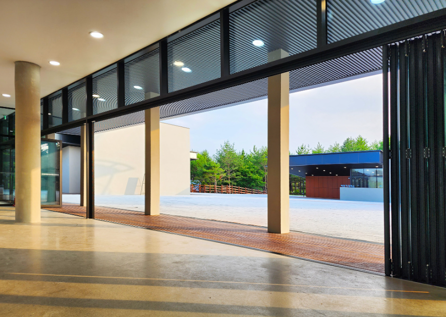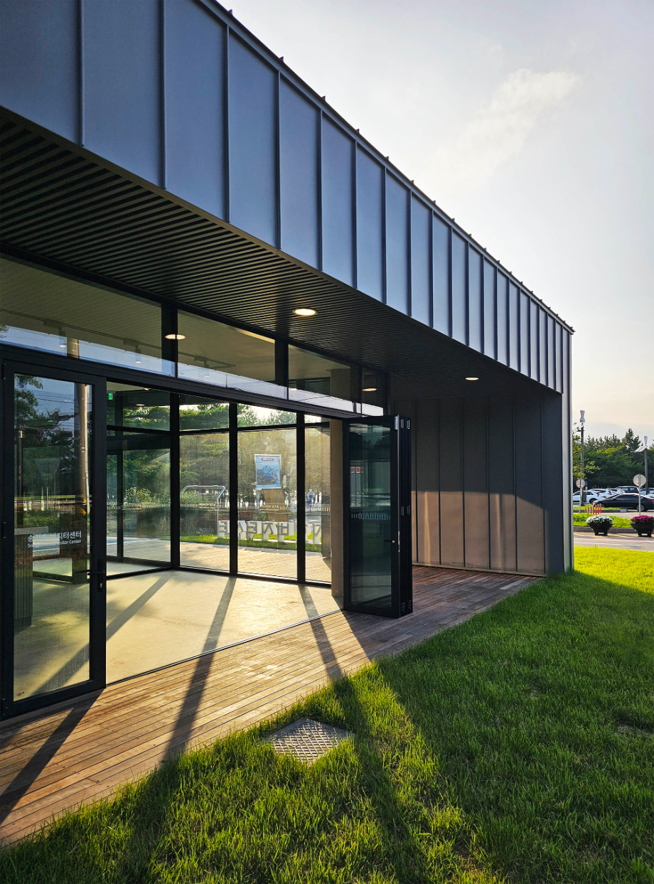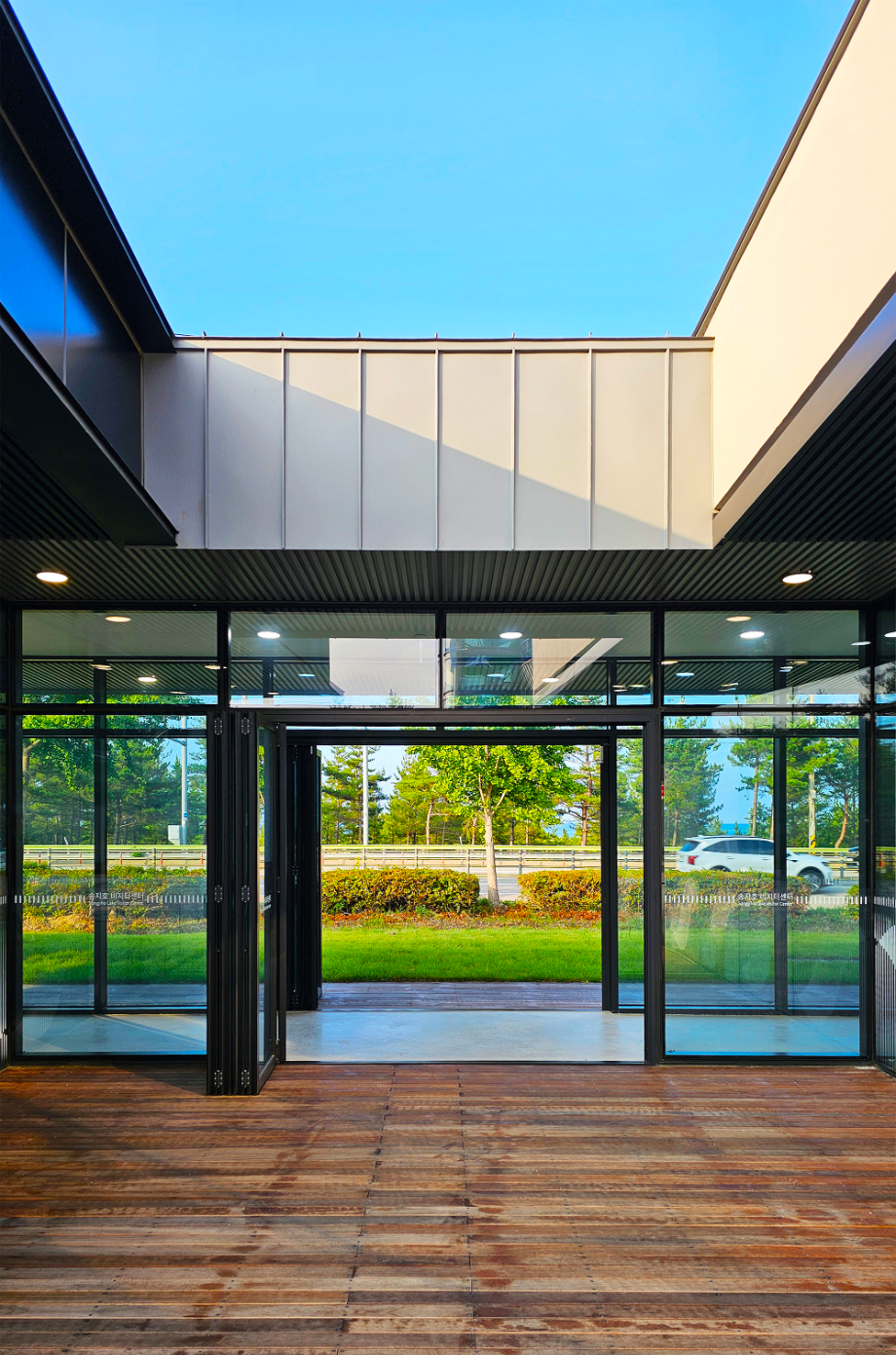 외장은 노출 콘크리트와 금속 패널, 합성 목재 패널을 조합하여 절제된 물성과 색조를 형성했다. 내부는 단순한 마감으로 전시와 안내 프로그램의 변화에 유연하게 대응하며, 폴딩도어를 통해 계절과 시간에 따라 확장된다.