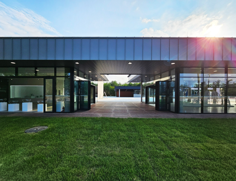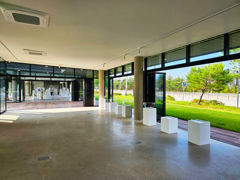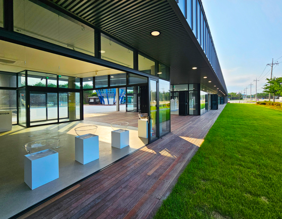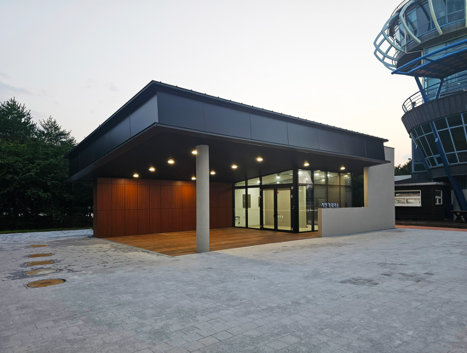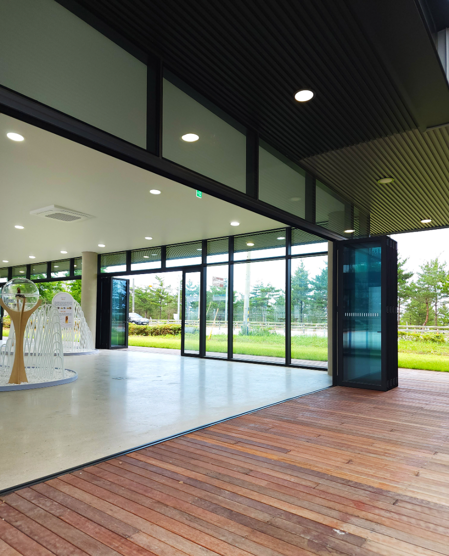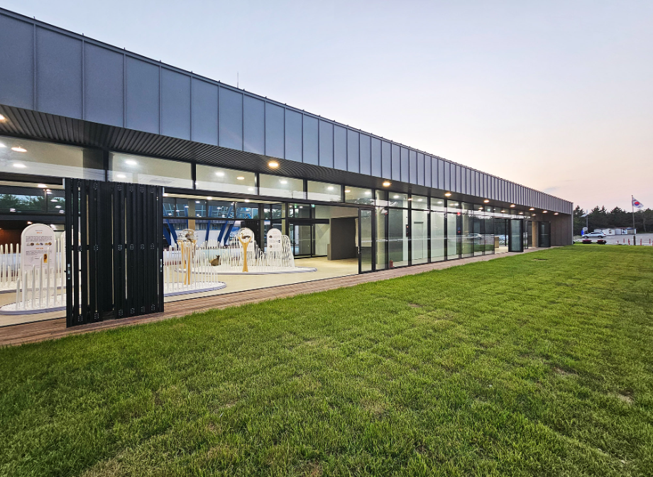 외장은 노출 콘크리트와 금속 패널, 합성 목재 패널을 조합하여 절제된 물성과 색조를 형성했다. 내부는 단순한 마감으로 전시와 안내 프로그램의 변화에 유연하게 대응하며, 폴딩도어를 통해 계절과 시간에 따라 확장된다.