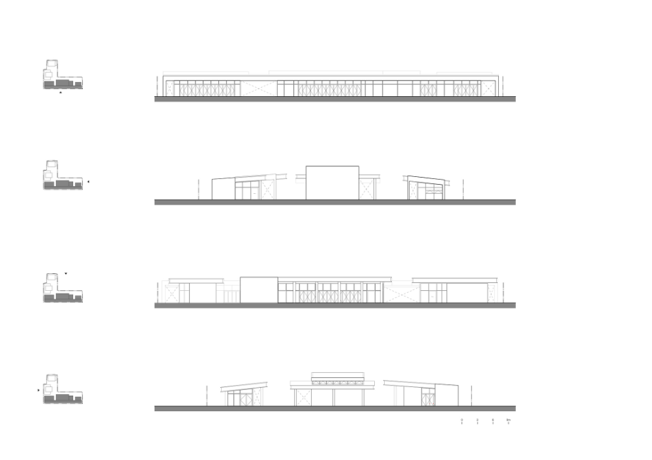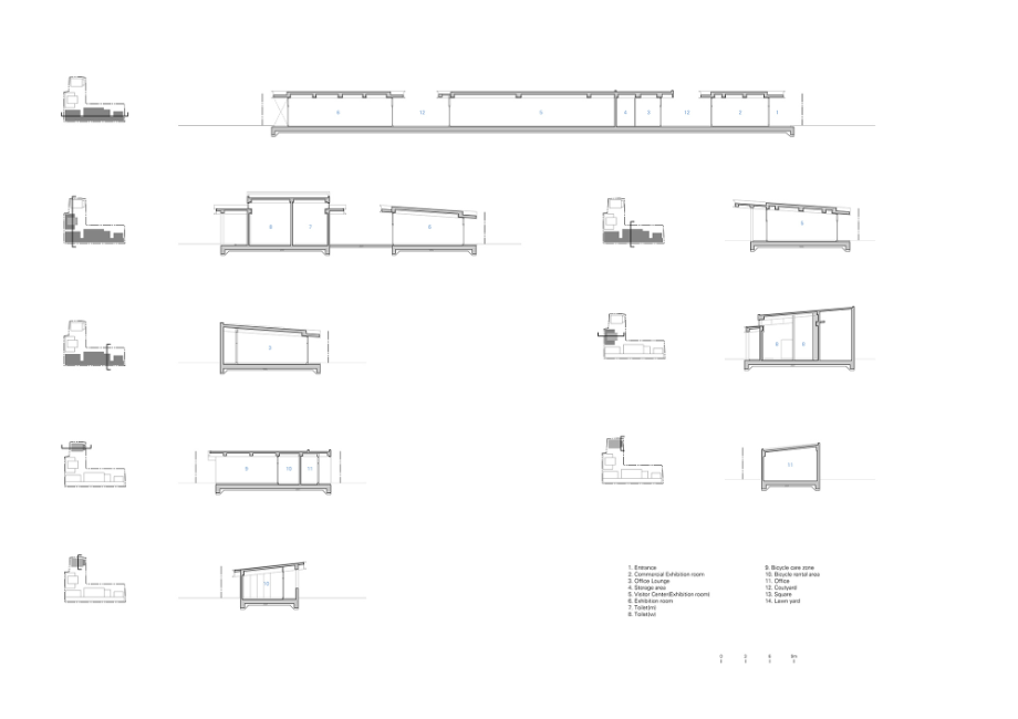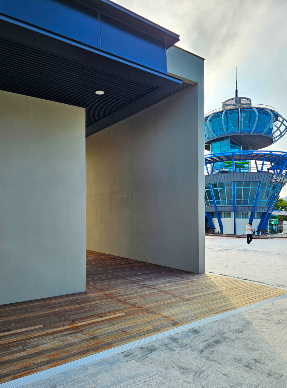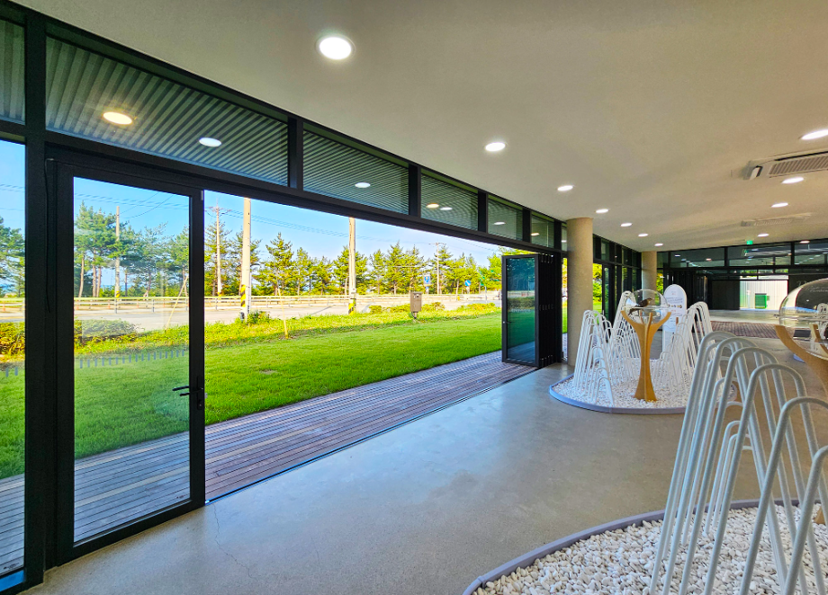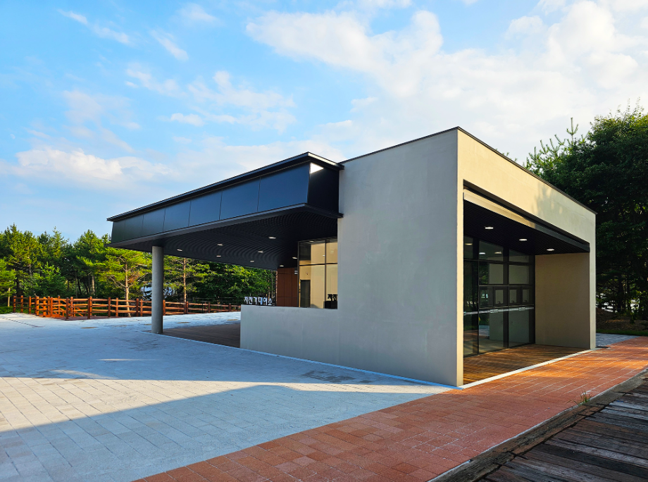 관광판매소와 갤러리는 중심부에 선형으로 배치되어 양쪽의 광장과 바다를 향해 열린다. 폴딩도어를 통해 처마 아래까지 이어지는 그늘 공간은 실내와 외부의 경계를 흐리며, 바람과 빛, 소리를 내부로 끌어들인다. 별도의 매스로 계획된 화장실은 둘레길에서 쉽게 접근할 수 있도록 두었고, 자전거 대여소는 자연 속으로 진입하는 출발점이 된다.