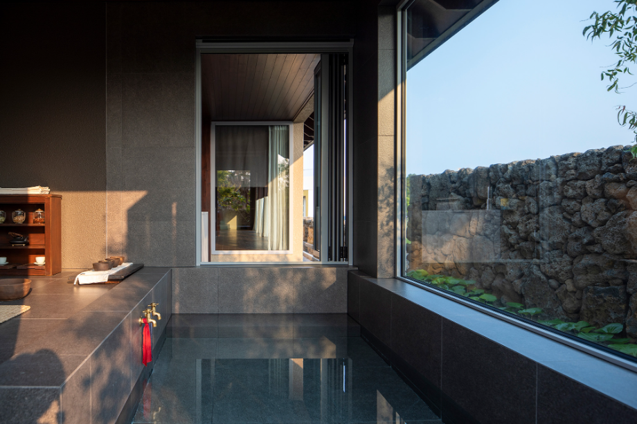 공간의 끝에 놓인 목욕실은 목욕재계(齋戒沐浴)의 의미를 따라, 육체와 정신이 함께 정화되는 성의정심(誠意正心)의 장소가 된다. 이는 건축주가 공간을 대하는 태도에서 비롯된 것으로, 마음을 정성스럽고 바르게 가다듬는 성의정심의 자세는 건축의 바탕이 되었고, 그 마음이 손님을 맞이하는 태도로 확장되며 목욕재계의 공간적 형식으로 구체화된 것이다. 즉, 이 목욕실은 단순한 위생의 공간이 아니라, 건축주의 수양적 태도가 물리적 공간으로 전이된 장소이자, 손님이 맑고 고요한 상태로 존재를 회복하는 ‘예(禮)의 공간’이다.