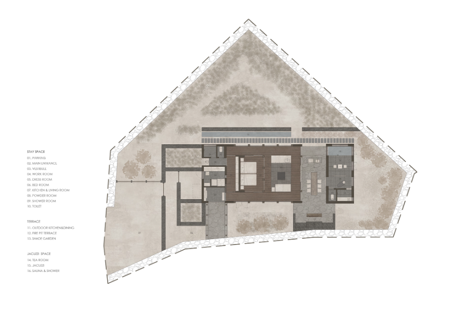 '와타'는 자연과 내밀한 관계를 통해 존재의 태도를 묻는다. 이곳은 일상 너머의 감각과 마음의 결을 정돈하는 장소로, 사유와 휴식 그리고 존재의 본질에 귀 기울이게 되는 조용한 건축적 응답이 되고자 한다.◼︎