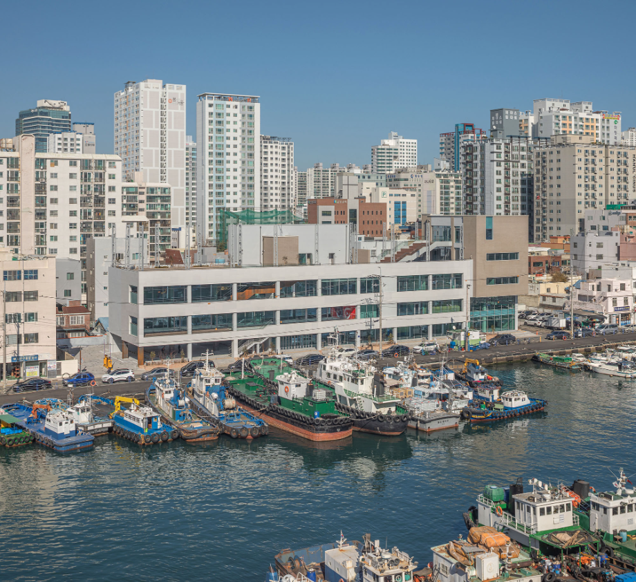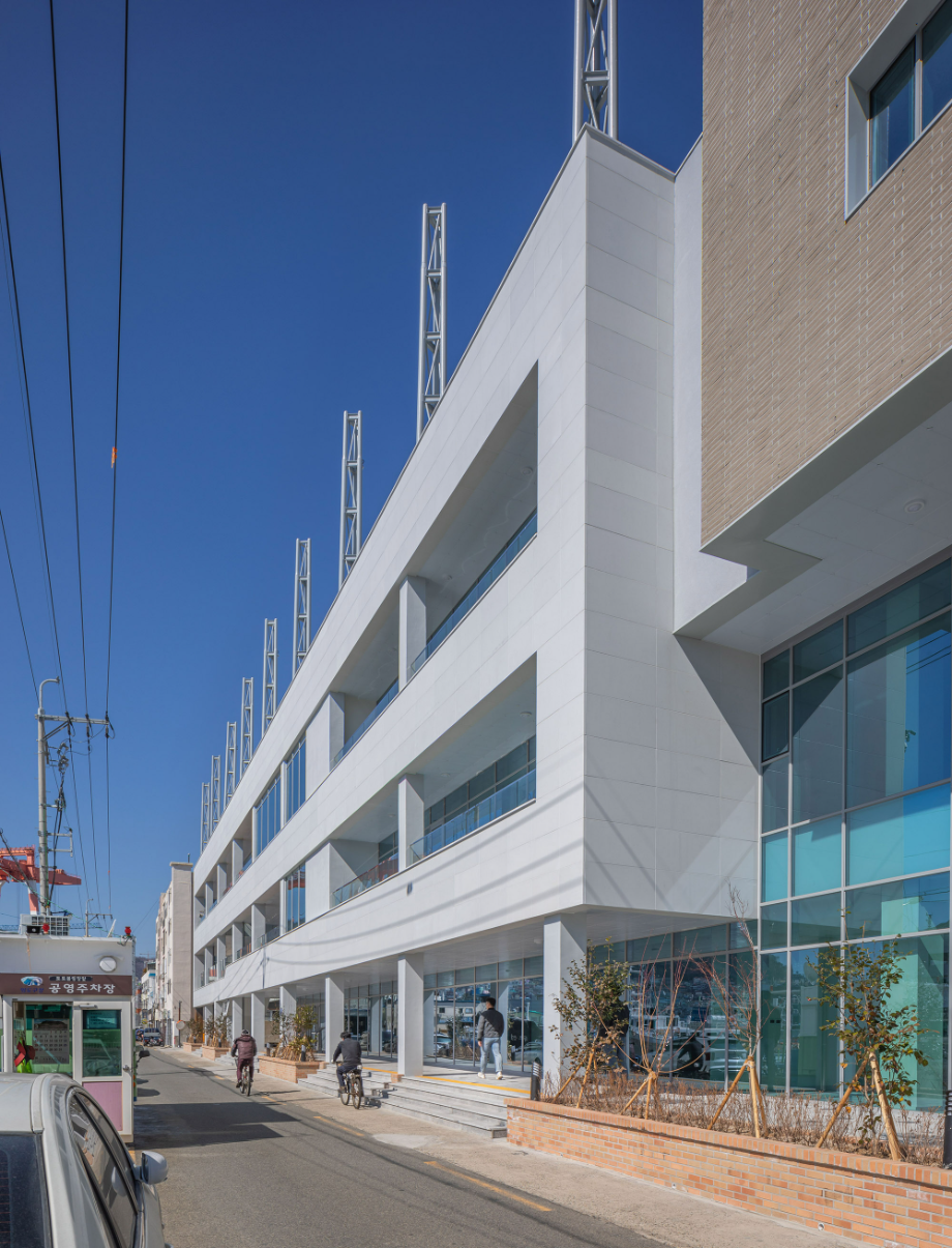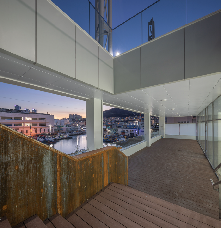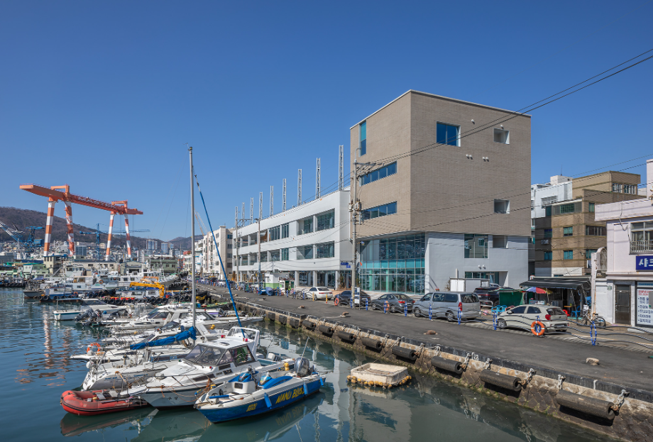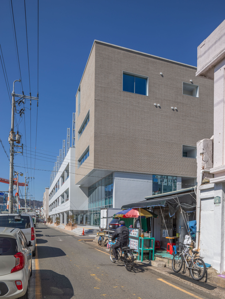 굴항 맞은편에서 보여지는 영도지역산업복지센터의 테라스를 가진 열린 파사드는 공공건축물의 디자인된 공용공간이 여유롭게 바다와 관계되어짐을 표출했다.◼︎