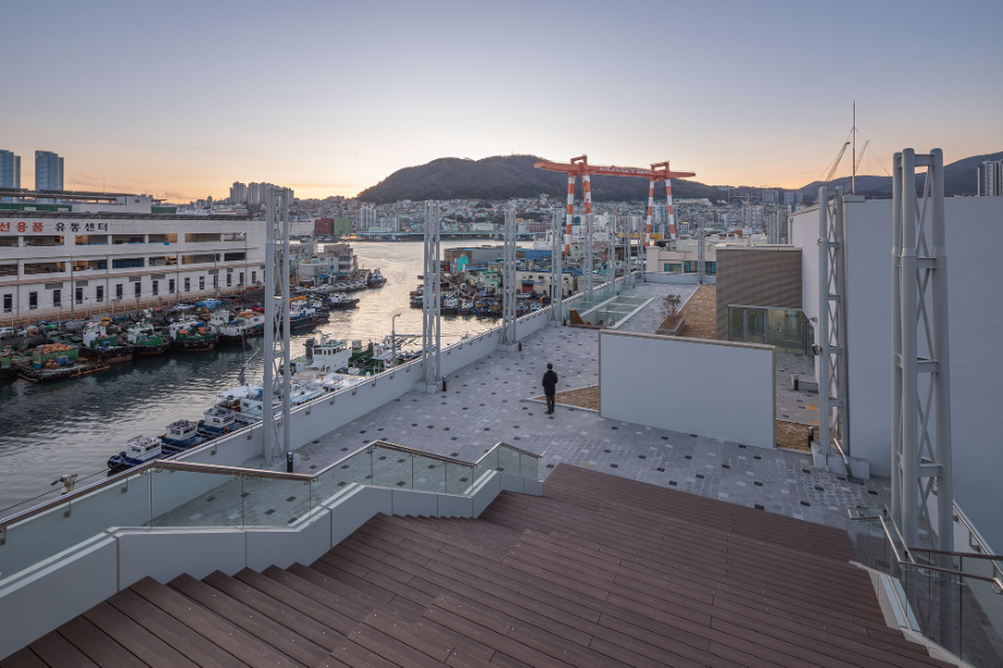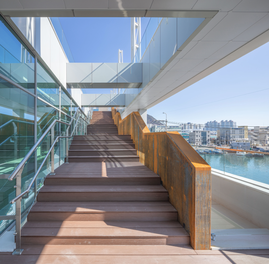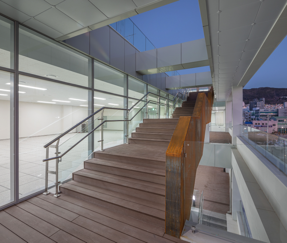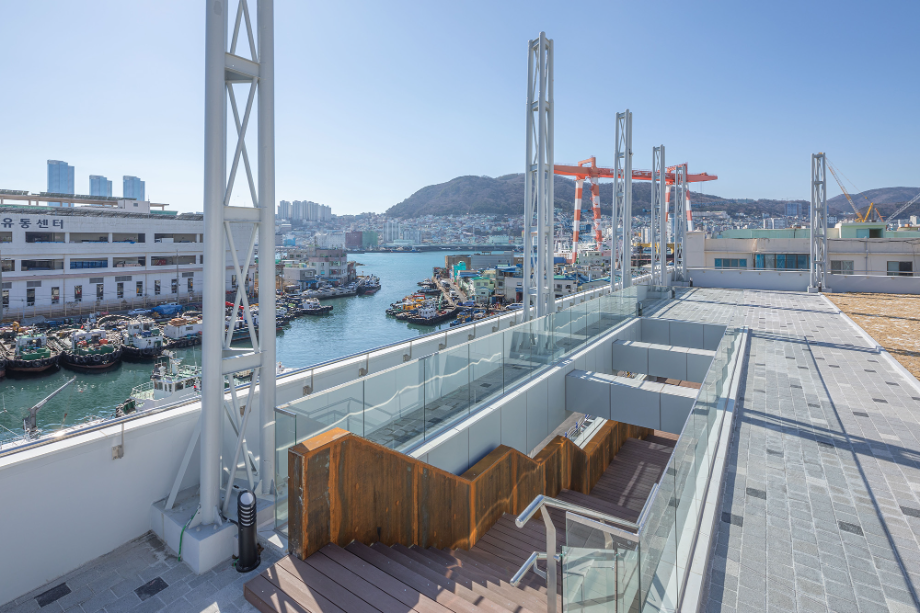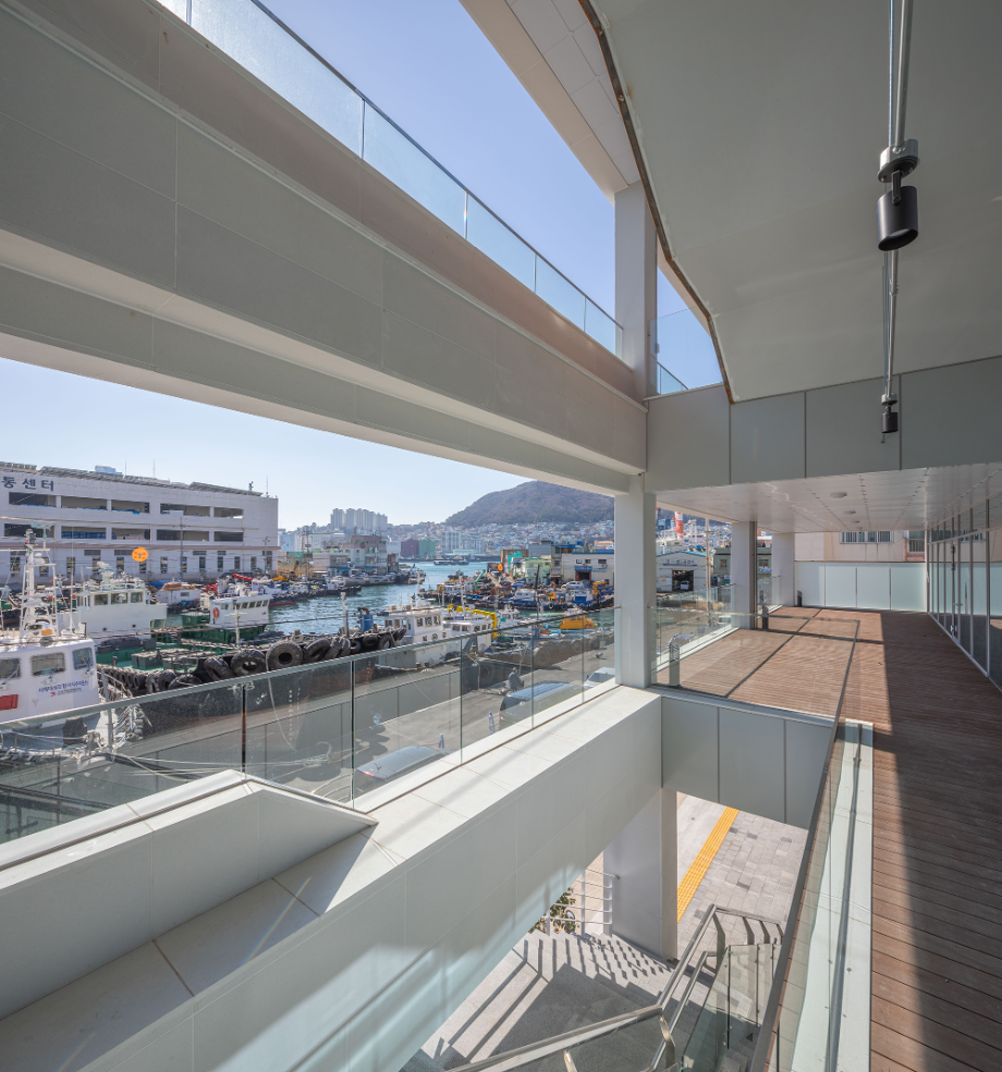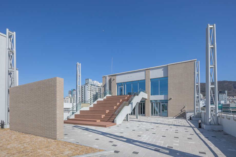 굴항 맞은편에서 보여지는 영도지역산업복지센터의 테라스를 가진 열린 파사드는 공공건축물의 디자인된 공용공간이 여유롭게 바다와 관계되어짐을 표출했다.◼︎