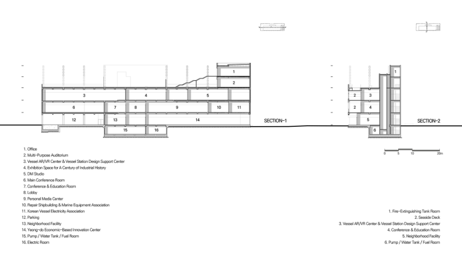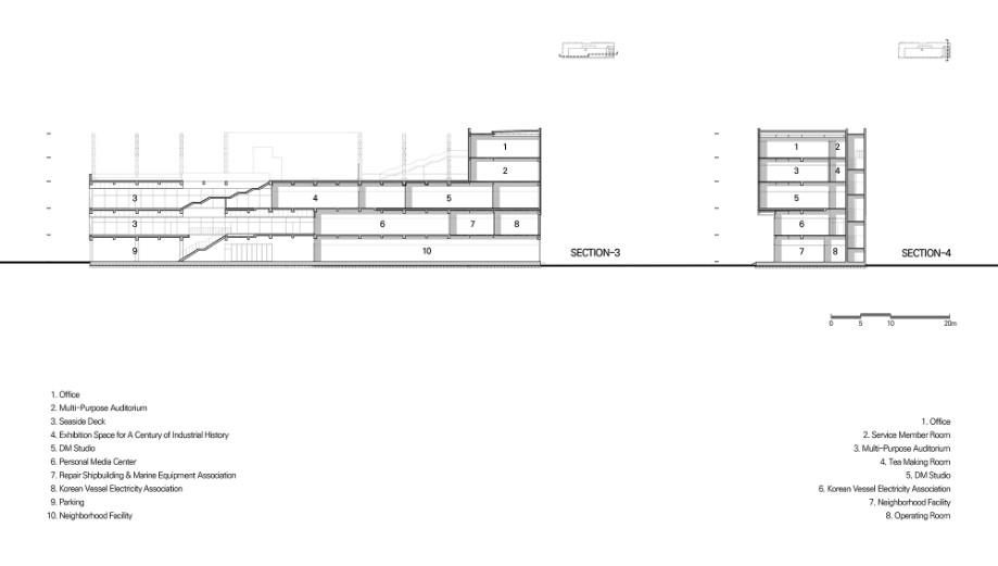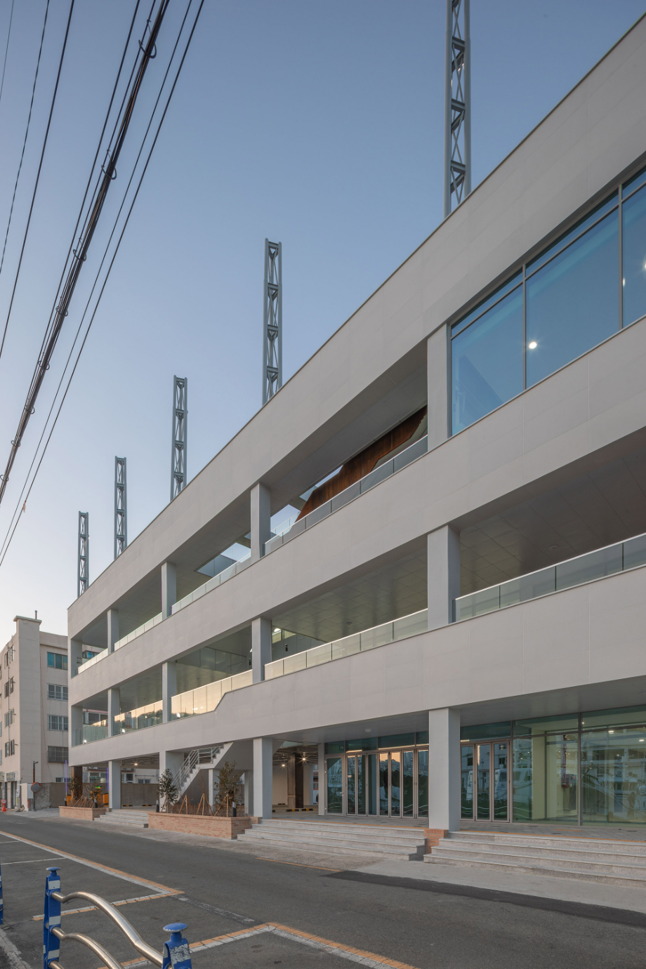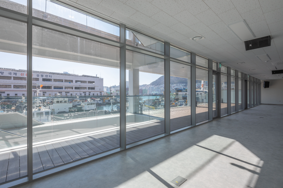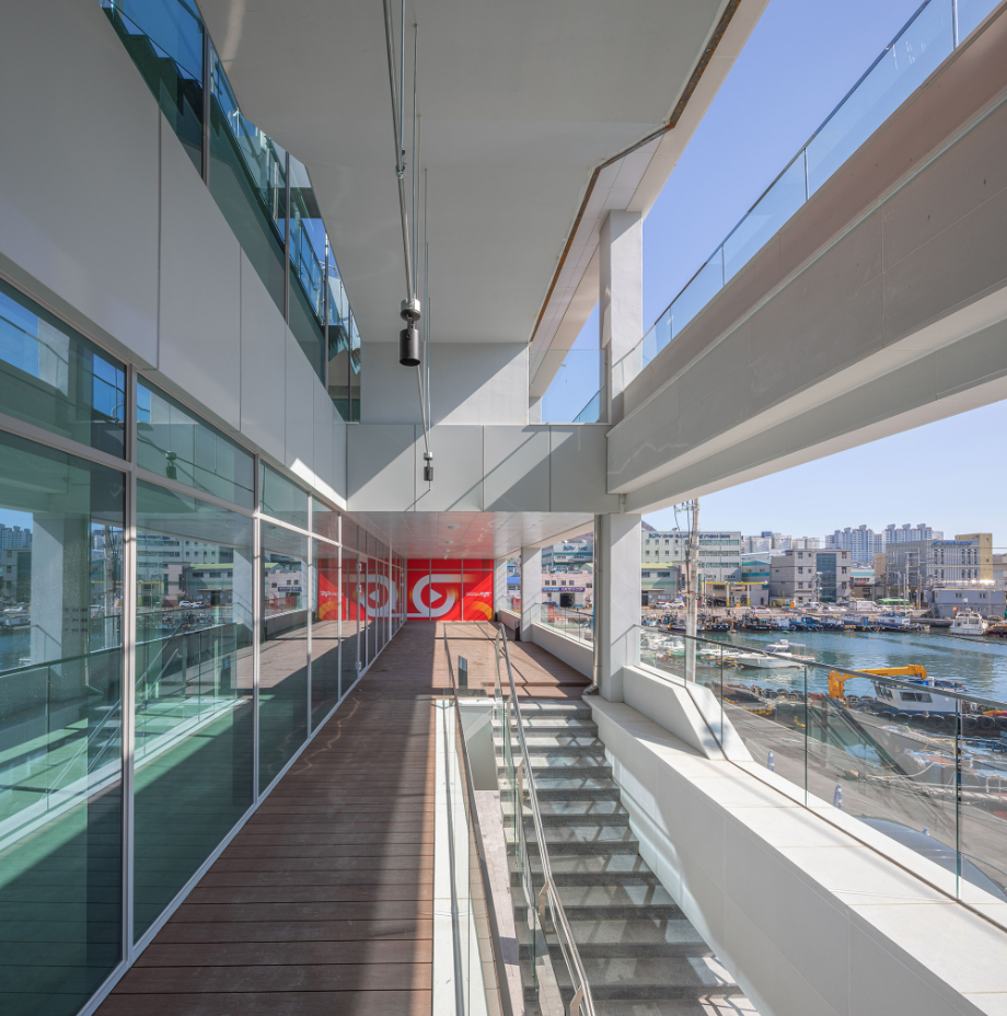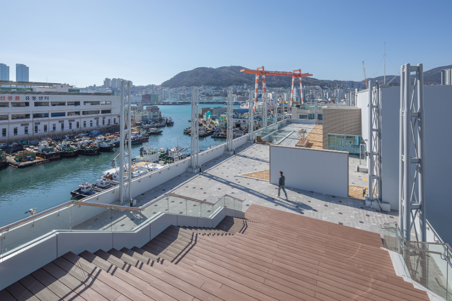 굴항 맞은편에서 보여지는 영도지역산업복지센터의 테라스를 가진 열린 파사드는 공공건축물의 디자인된 공용공간이 여유롭게 바다와 관계되어짐을 표출했다.◼︎