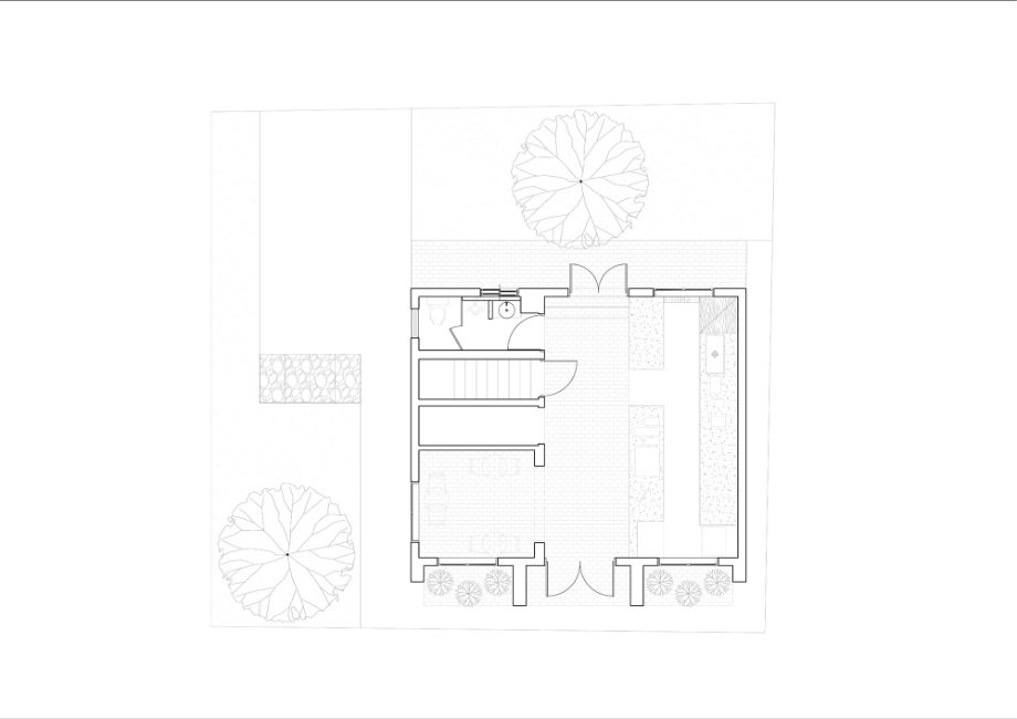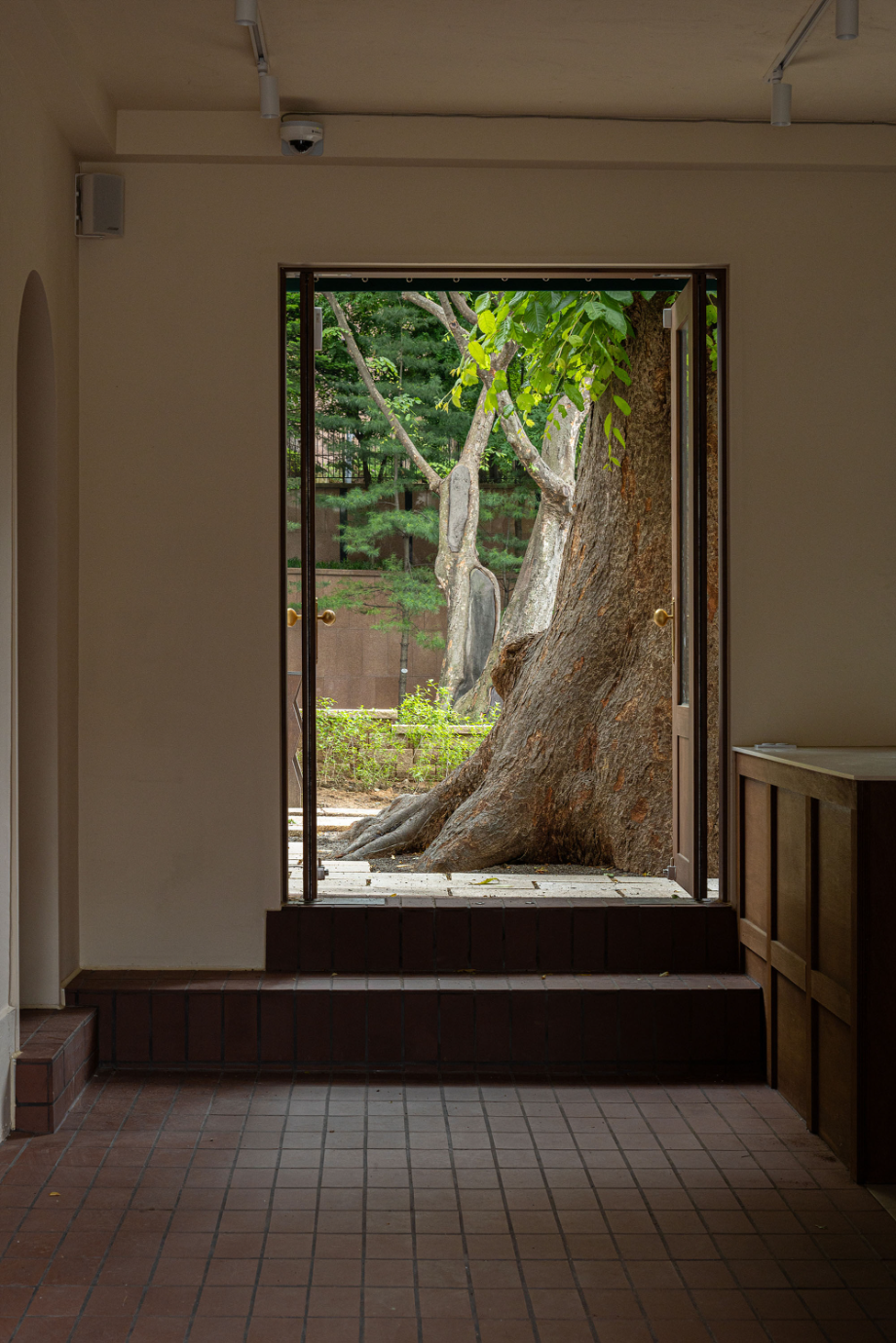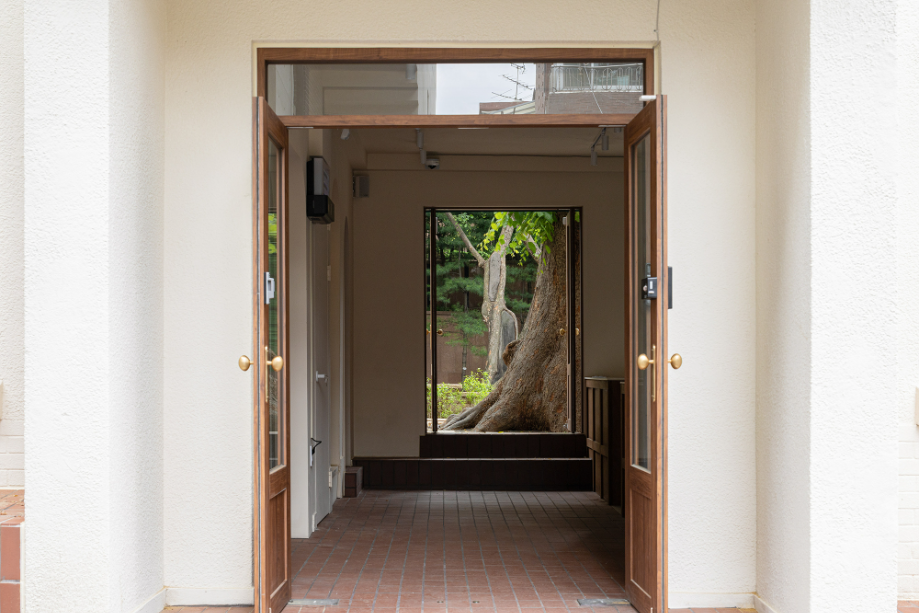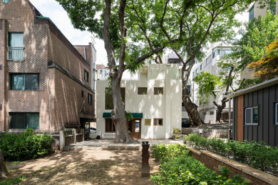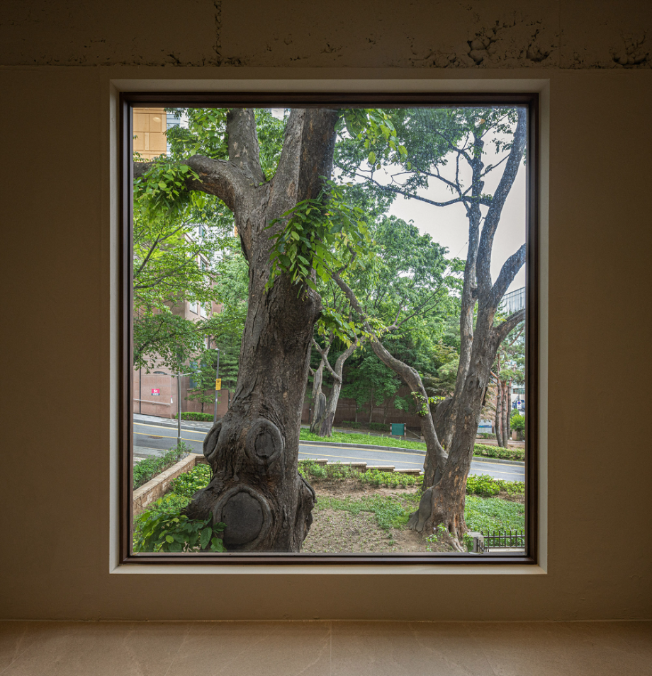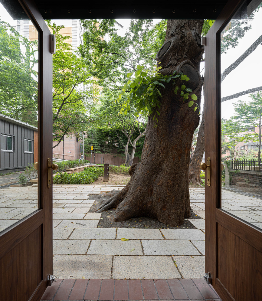 재료 선택은 단순하고 정직한 방향을 따랐다. 외부는 일부 기존 벽돌 마감을 보존했고, 내부는 노출 콘크리트와 오크 목재를 주재료로 사용했다. 대형 로이유리(low-e glass)는 실내와 실외의 경계를 흐리며, 느티나무의 존재를 공간 안으로 끌어들인다. 외부 마당은 계절에 따라 다양한 활동이 가능하도록 계획되어, 이웃이 함께 머물 수 있는 확장된 커뮤니티 영역으로 기능한다.