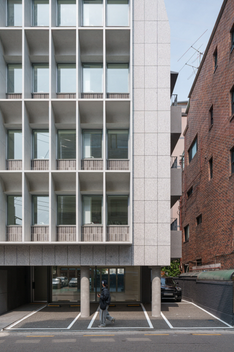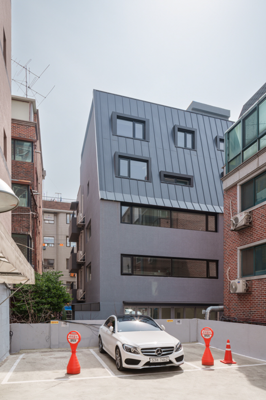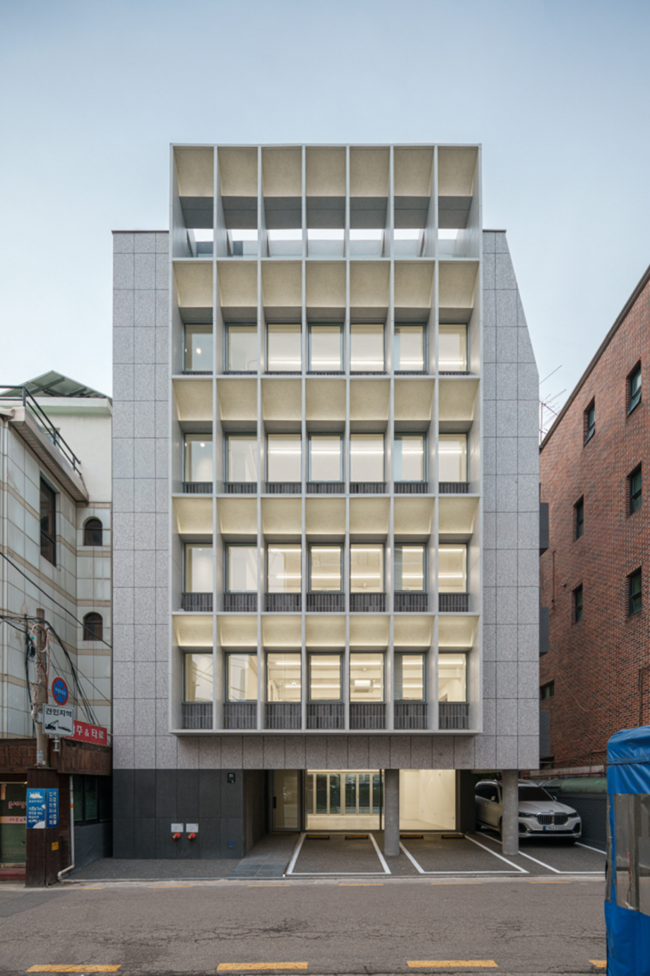 보통 건축물을 그릴 때에 네모안에 네모를 그리드 패턴으로 연속되게 표현하는 것처럼 이러한 네모가 가득한 풍경들이 모여 바로 도시를 이룬다는 것이 무의식중에 남아있을테니까. 사실 그러한 그리드(Grid) 체계의 입면 패턴은 구조에 따른 수직하중의 연속이 그대로 드러나는 것과 별개로 실제 건축물 층층이 각 실을 쪼개어 개별임대로서 융통성 있는 벽 구획이 용이하도록 했던 문제해결방식이 낳은 형태였는데, 클라이언트가 누누이 강조했던 ‘통임대도 가능하고 개별임대도 가능’하게 해달라는 이율배반적인 욕심(Greed)이 담긴 표현도구로서 실제로 내벽으로 구분할 수 있는 기준이 되기도 하고 조형적으로도 개별과 집합이 유연하게 구성될 수 있는 형태가 된다. 그렇게 그리드는 처마와 루버로서 정남향을 바라보는 건축물에게 있어 다소 부담스러웠던 태양빛을 걸러준다.