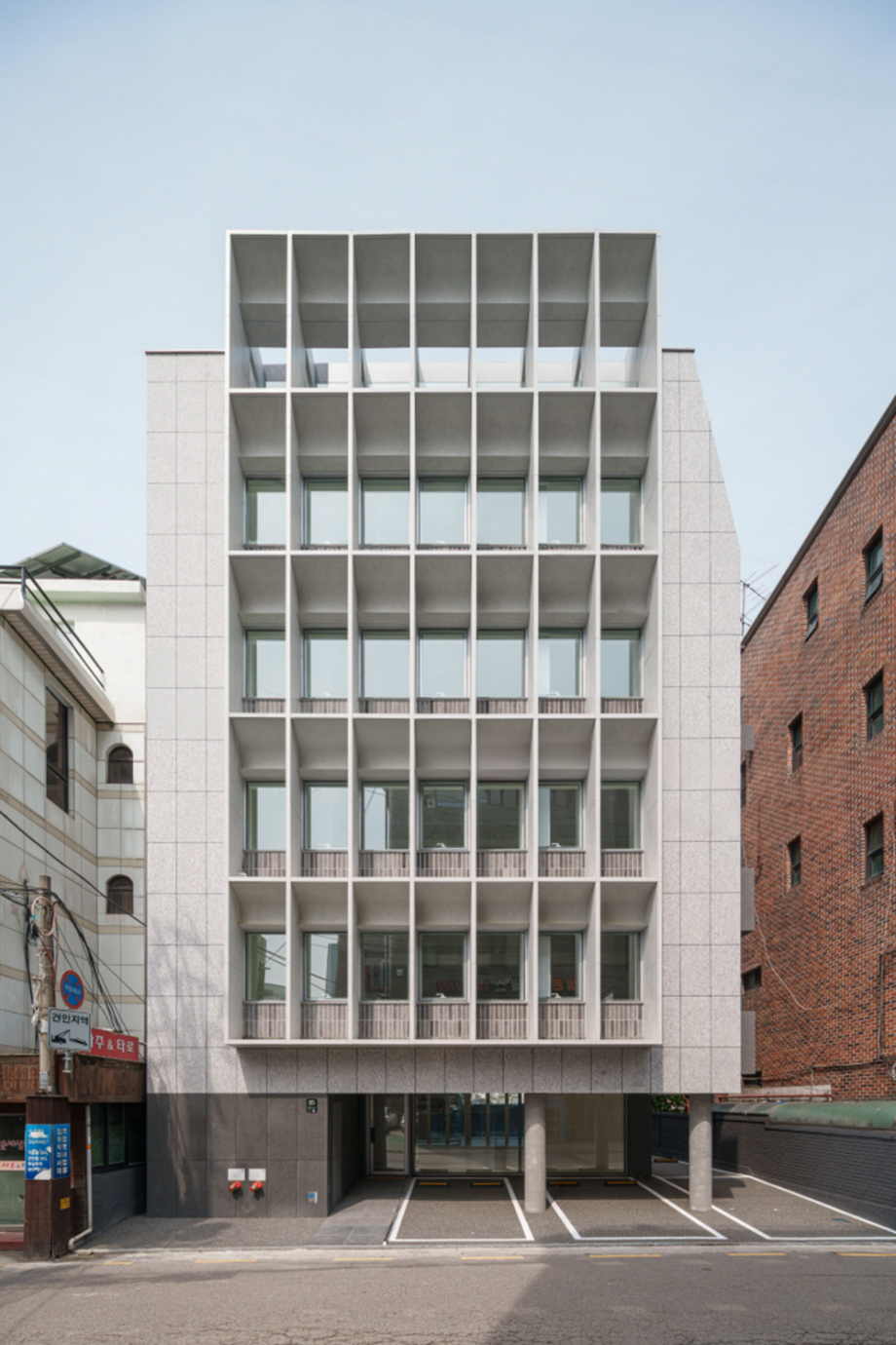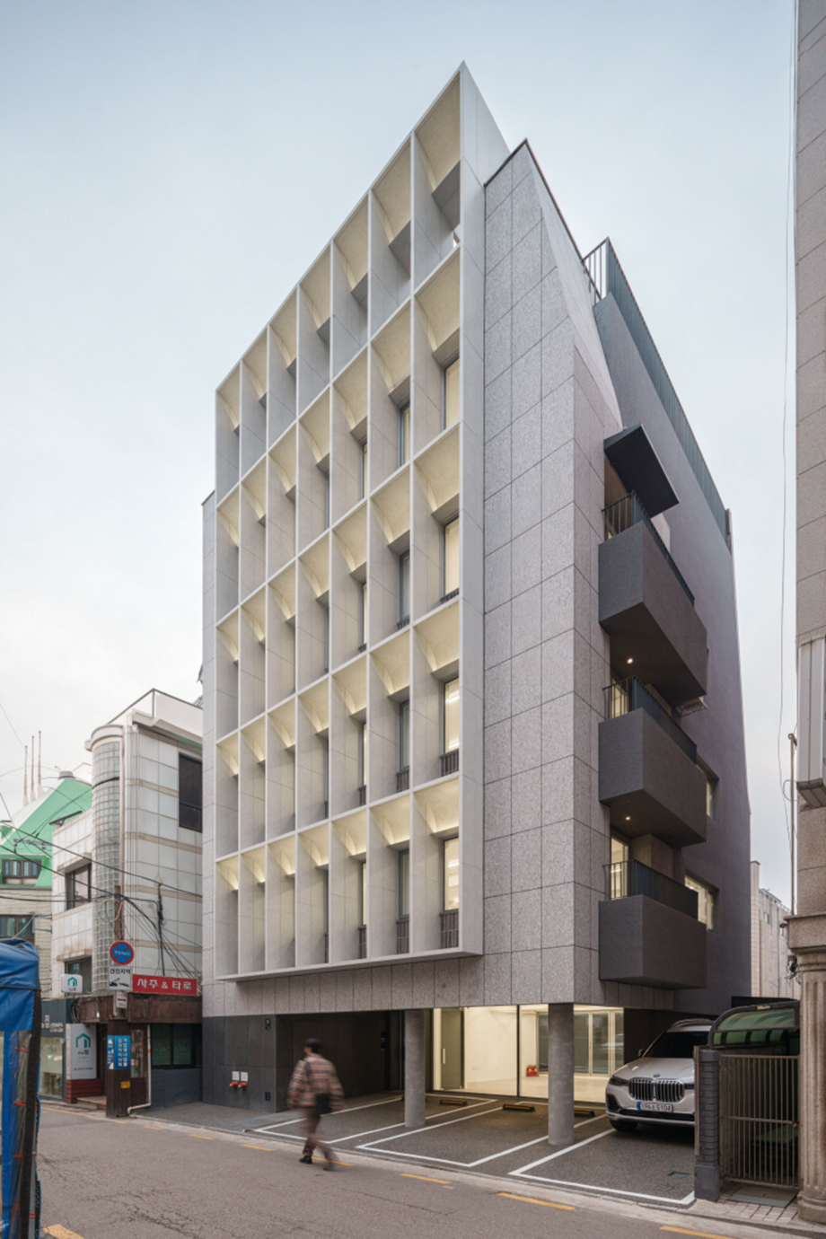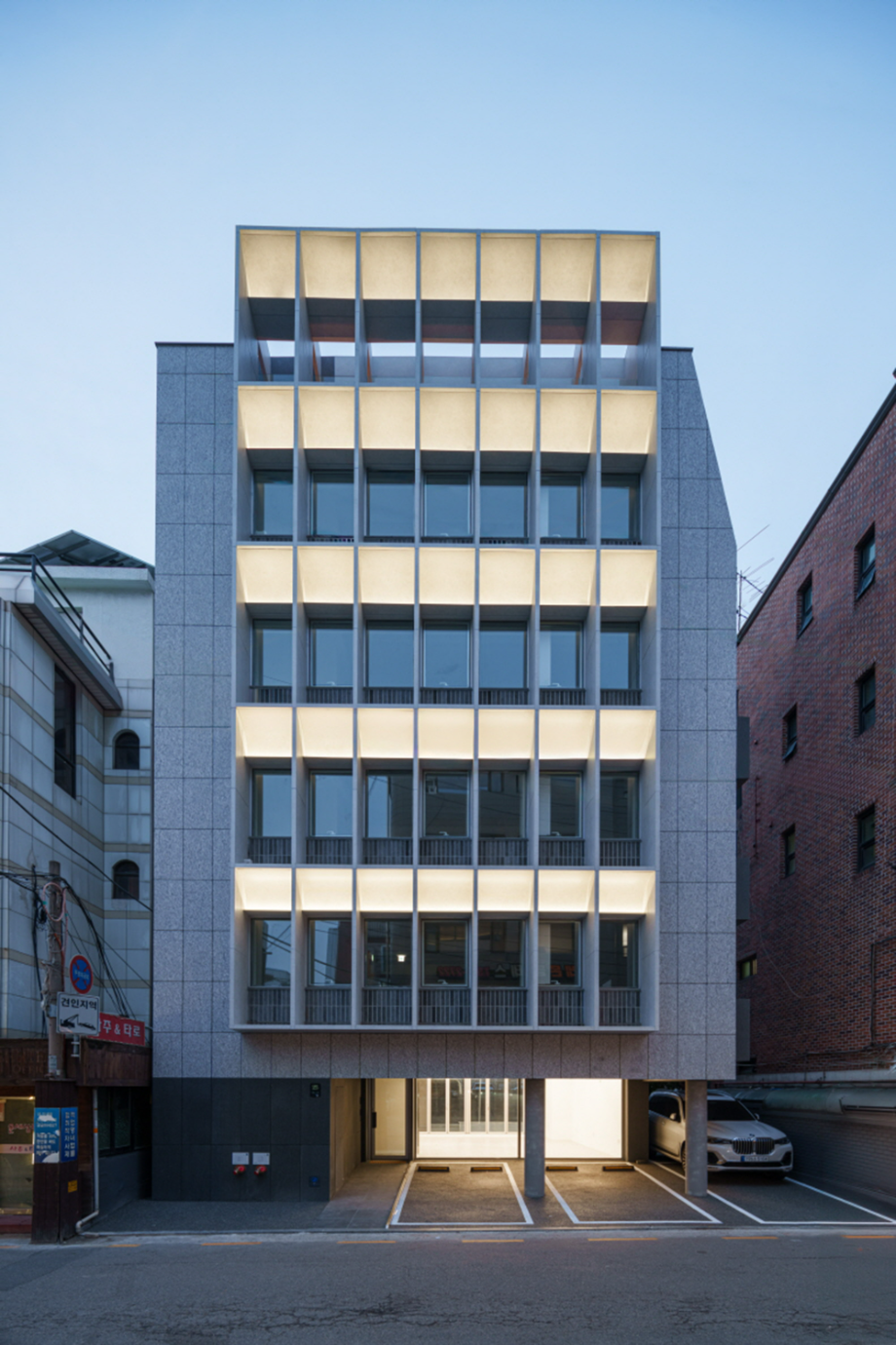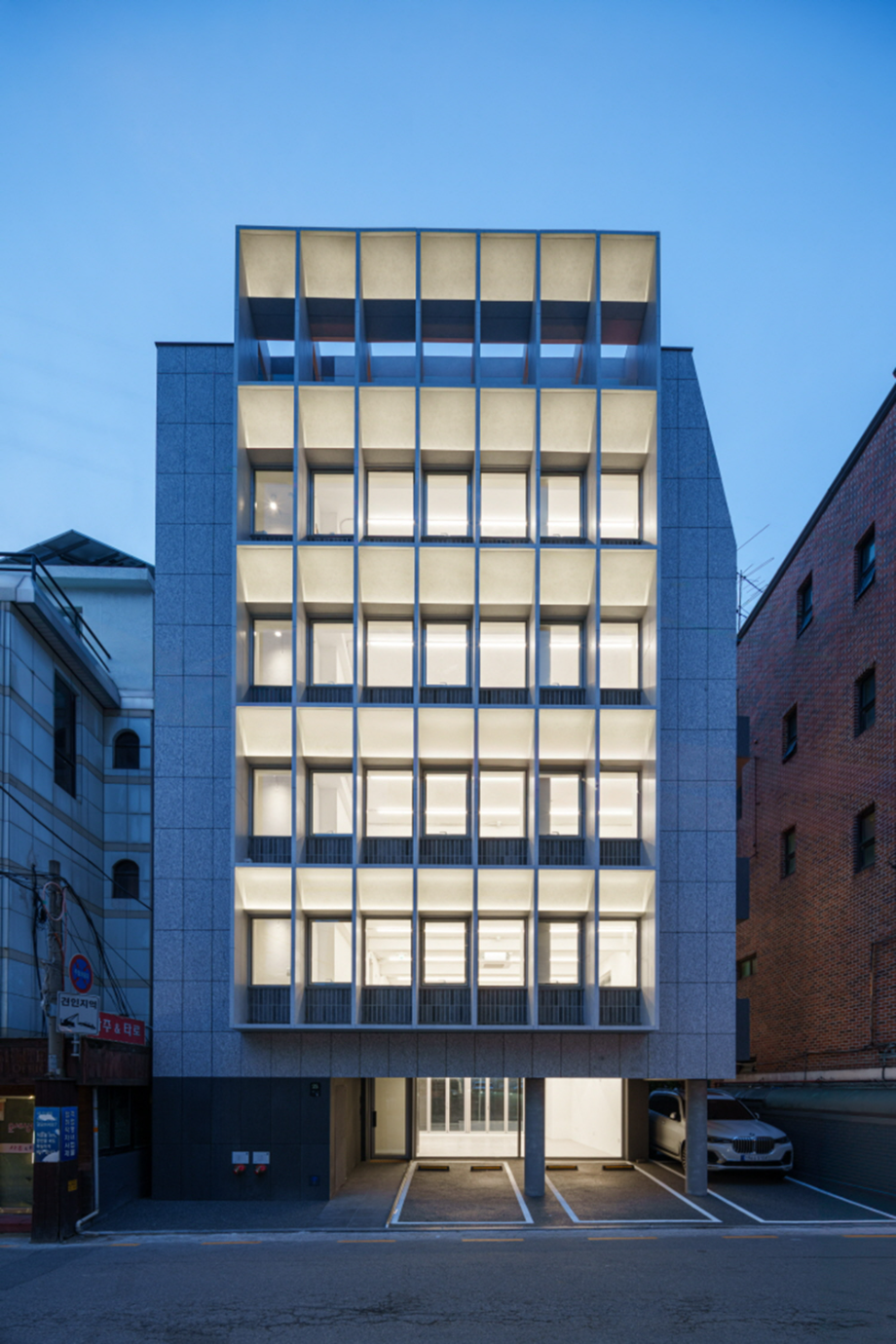 보통 건축물을 그릴 때에 네모안에 네모를 그리드 패턴으로 연속되게 표현하는 것처럼 이러한 네모가 가득한 풍경들이 모여 바로 도시를 이룬다는 것이 무의식중에 남아있을테니까. 사실 그러한 그리드(Grid) 체계의 입면 패턴은 구조에 따른 수직하중의 연속이 그대로 드러나는 것과 별개로 실제 건축물 층층이 각 실을 쪼개어 개별임대로서 융통성 있는 벽 구획이 용이하도록 했던 문제해결방식이 낳은 형태였는데, 클라이언트가 누누이 강조했던 ‘통임대도 가능하고 개별임대도 가능’하게 해달라는 이율배반적인 욕심(Greed)이 담긴 표현도구로서 실제로 내벽으로 구분할 수 있는 기준이 되기도 하고 조형적으로도 개별과 집합이 유연하게 구성될 수 있는 형태가 된다. 그렇게 그리드는 처마와 루버로서 정남향을 바라보는 건축물에게 있어 다소 부담스러웠던 태양빛을 걸러준다.