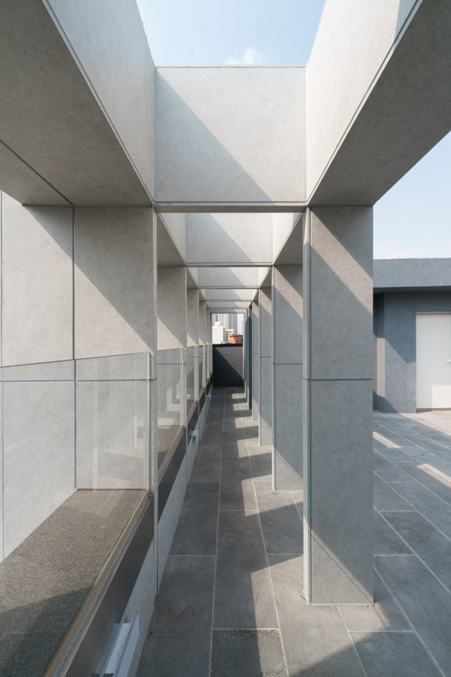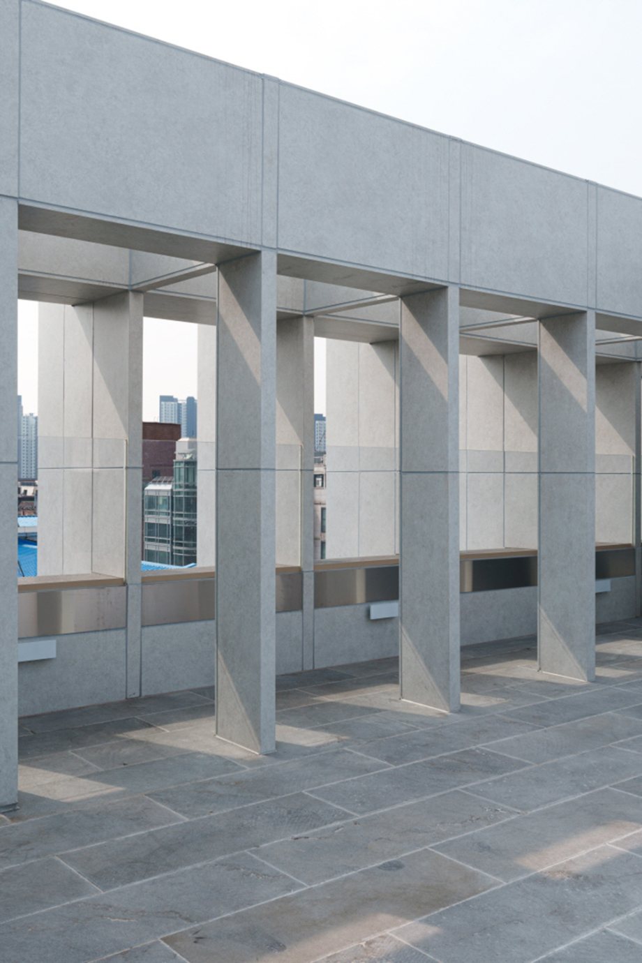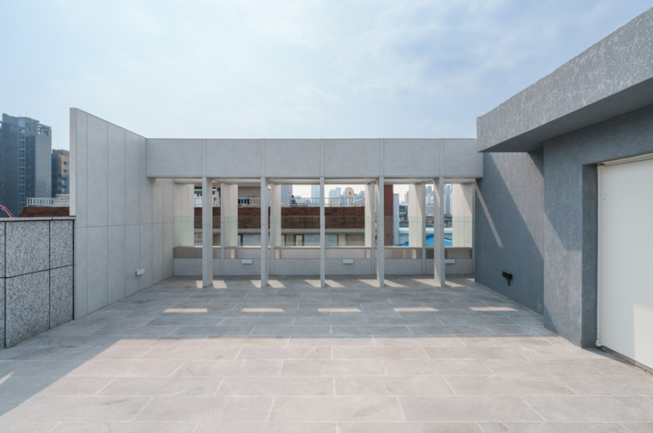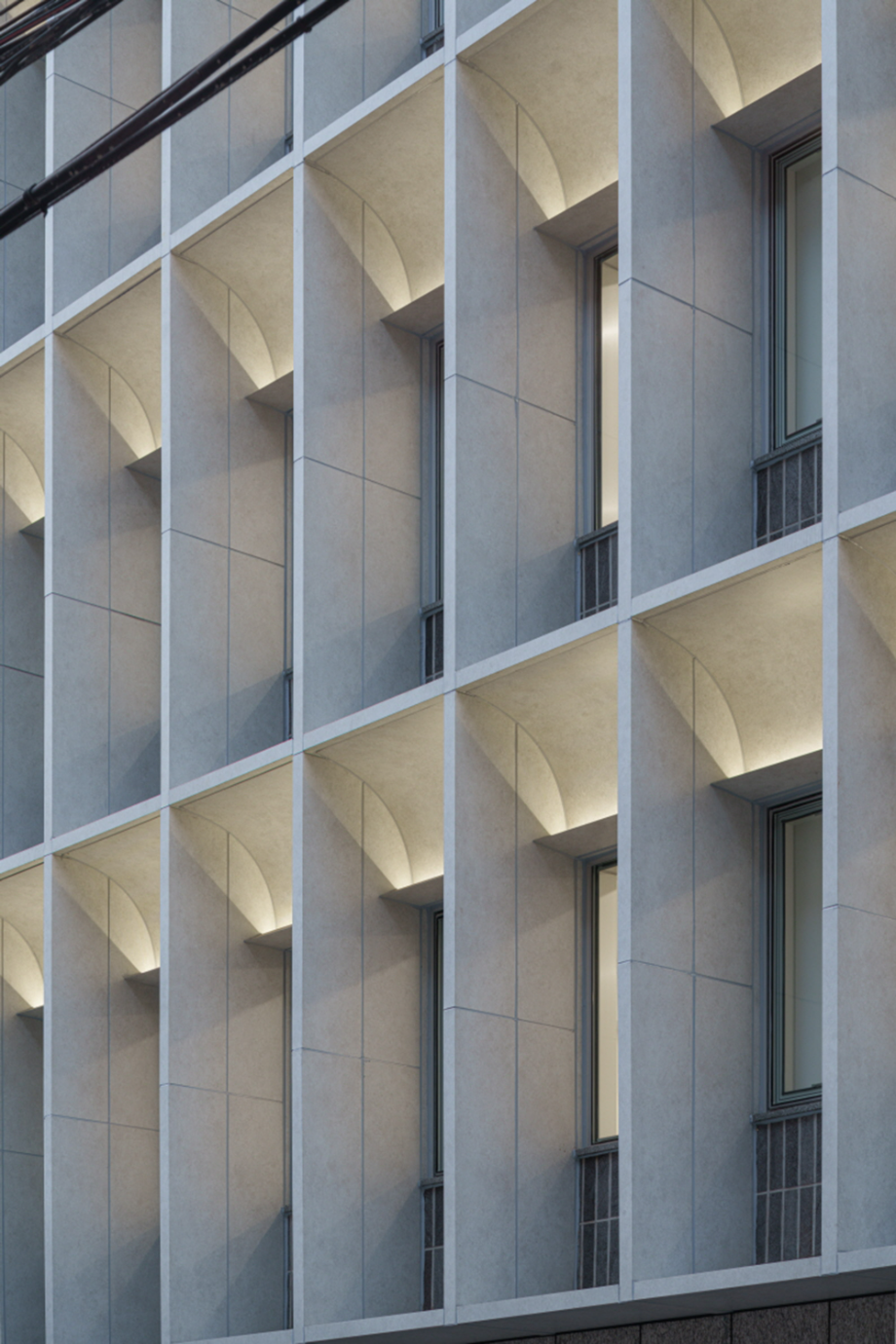 보통 건축물을 그릴 때에 네모안에 네모를 그리드 패턴으로 연속되게 표현하는 것처럼 이러한 네모가 가득한 풍경들이 모여 바로 도시를 이룬다는 것이 무의식중에 남아있을테니까. 사실 그러한 그리드(Grid) 체계의 입면 패턴은 구조에 따른 수직하중의 연속이 그대로 드러나는 것과 별개로 실제 건축물 층층이 각 실을 쪼개어 개별임대로서 융통성 있는 벽 구획이 용이하도록 했던 문제해결방식이 낳은 형태였는데, 클라이언트가 누누이 강조했던 ‘통임대도 가능하고 개별임대도 가능’하게 해달라는 이율배반적인 욕심(Greed)이 담긴 표현도구로서 실제로 내벽으로 구분할 수 있는 기준이 되기도 하고 조형적으로도 개별과 집합이 유연하게 구성될 수 있는 형태가 된다. 그렇게 그리드는 처마와 루버로서 정남향을 바라보는 건축물에게 있어 다소 부담스러웠던 태양빛을 걸러준다.