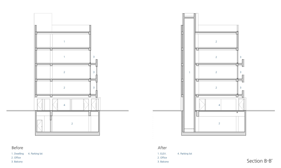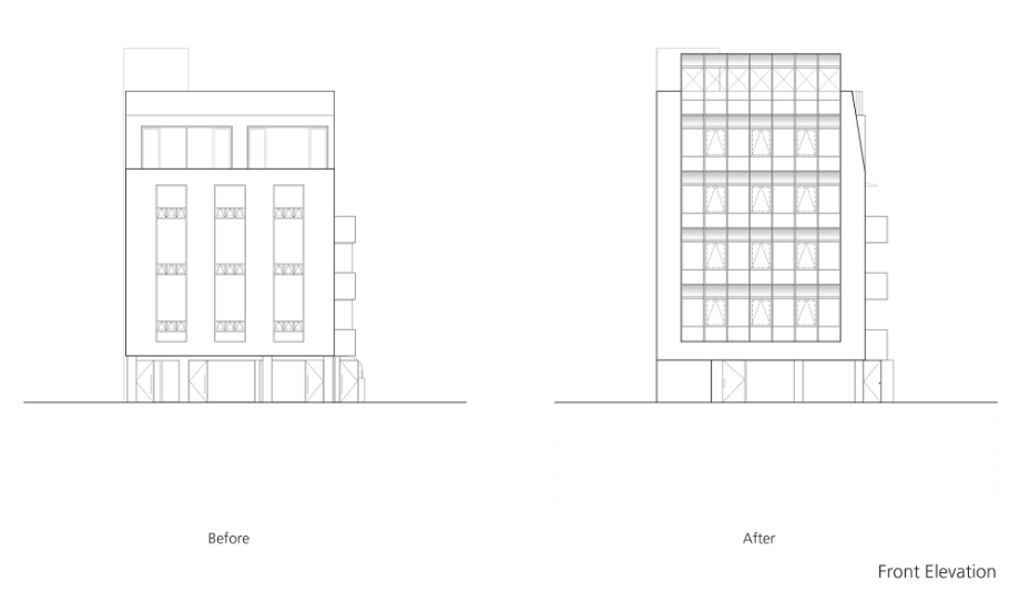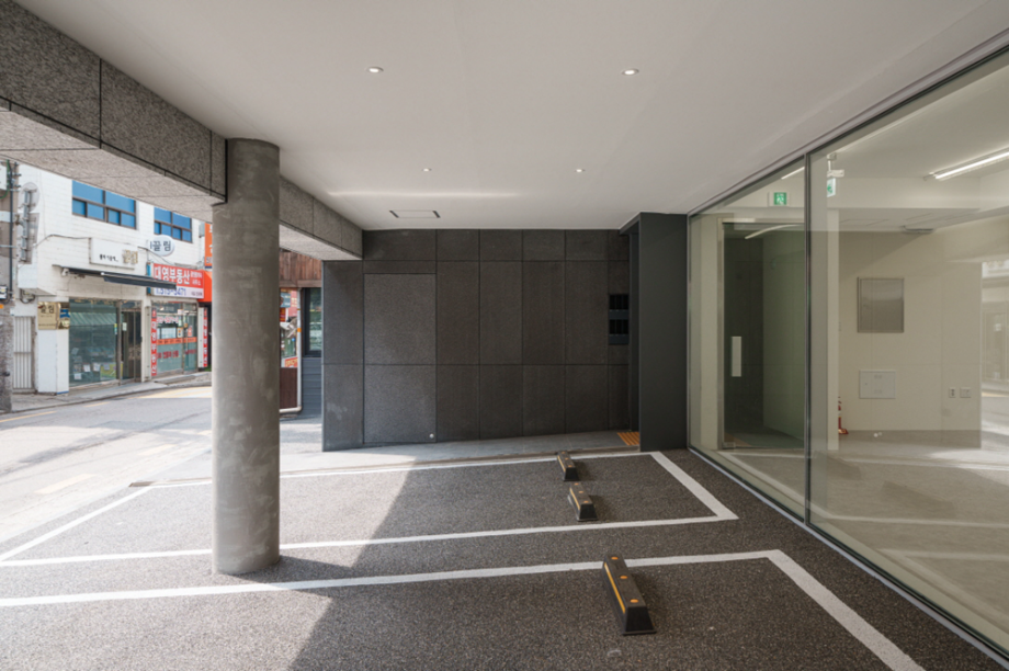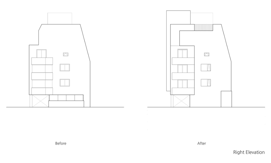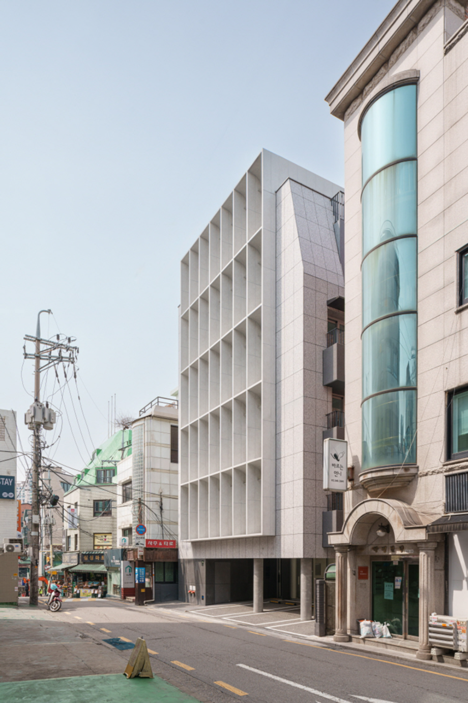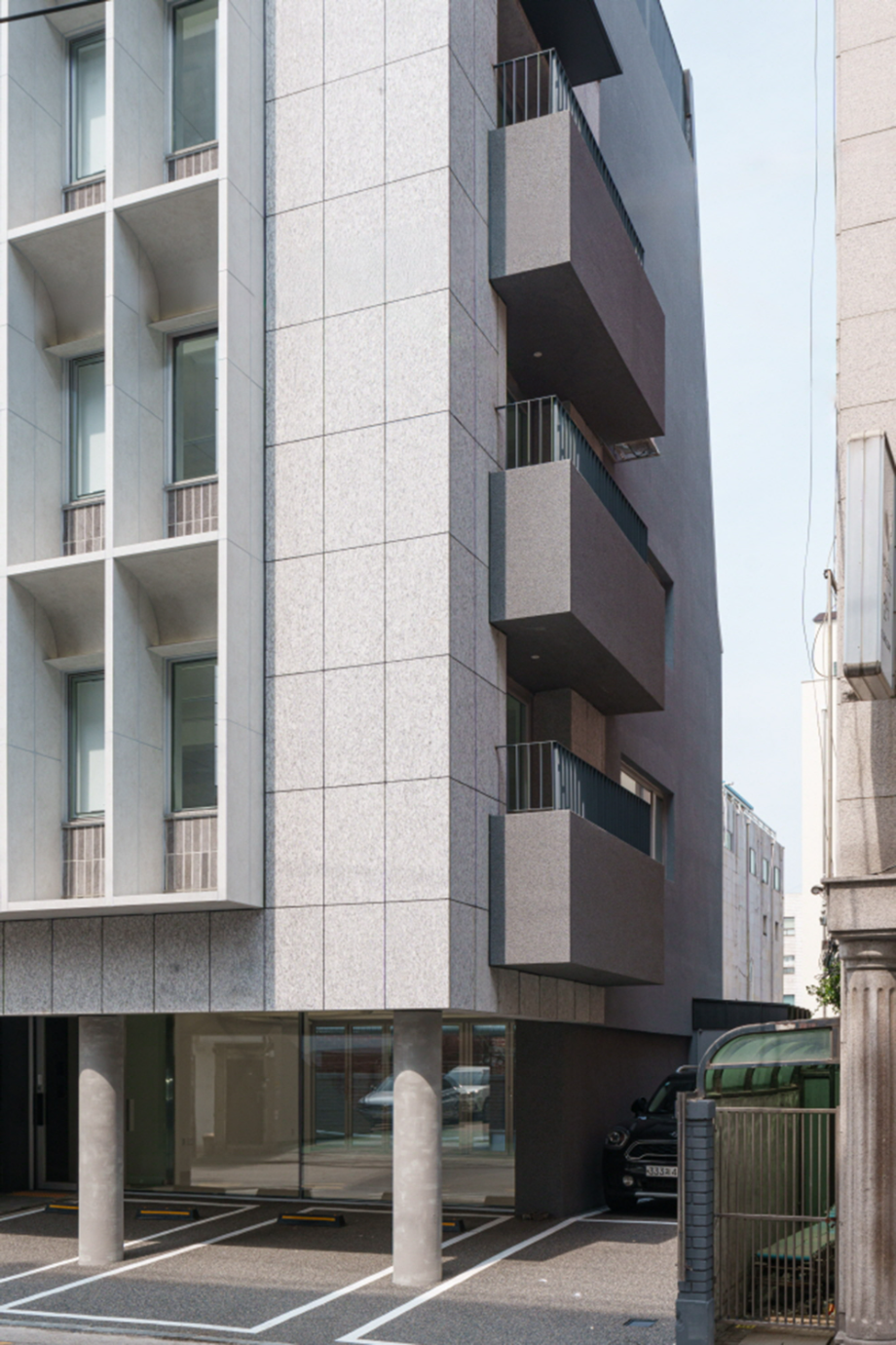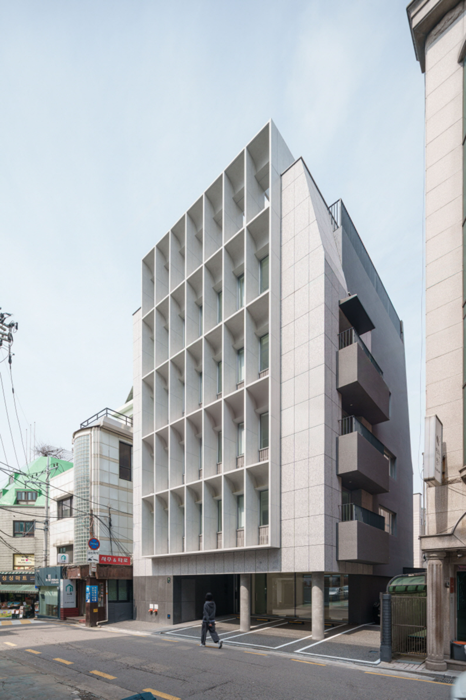 그러한 이유로 먼저 건축물의 새로운 축을 정립해야 했다. 엘리베이터 설치 및 내진성능 개선을 위해 계단실 폭에 맞춰 철근콘크리트구조의 내력벽을 외벽에 면하여 신설했고, 이는 전면 파사드의 돌출 정도의 기준이 됐다. 그 가상의 면을 바탕으로 기존 건축물 외벽의 경계를 다듬어 파사드가 하나의 존재로 여겨질 수 있도록 단단하고 큰 덩어리감을 가진 석재를 사용하여 마감했다. 이때에 근생으로 용도변경하는 연와조 주택(4, 5층) 부분은 각 실의 벽체 및 베란다의 경계를 허물며 H빔으로 구조보강을 하는데, 일조사선에 영향을 미치는 부분의 일부는 사선으로 처리하고 석재 파사드의 연속적 흐름을 이어주어 매스의 통일감을 잃지 않으려 했다.