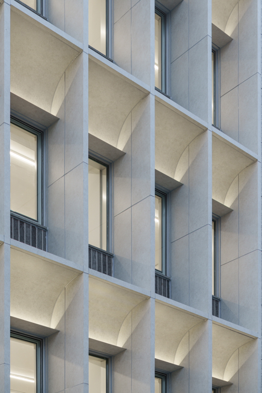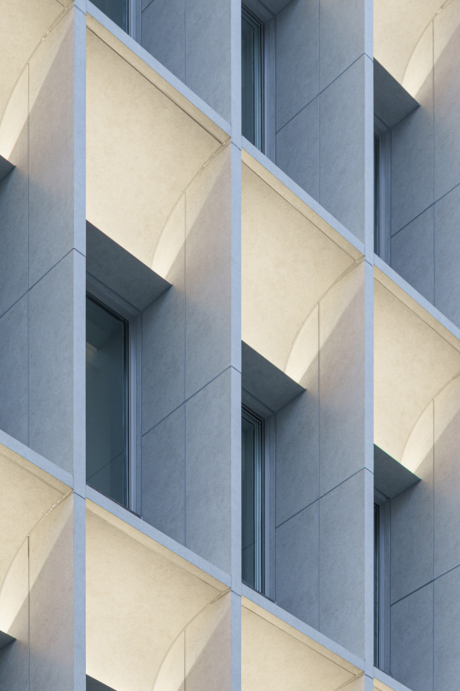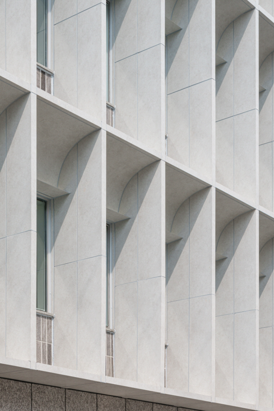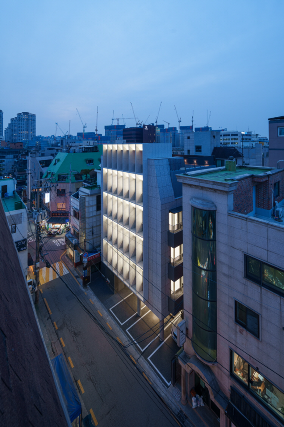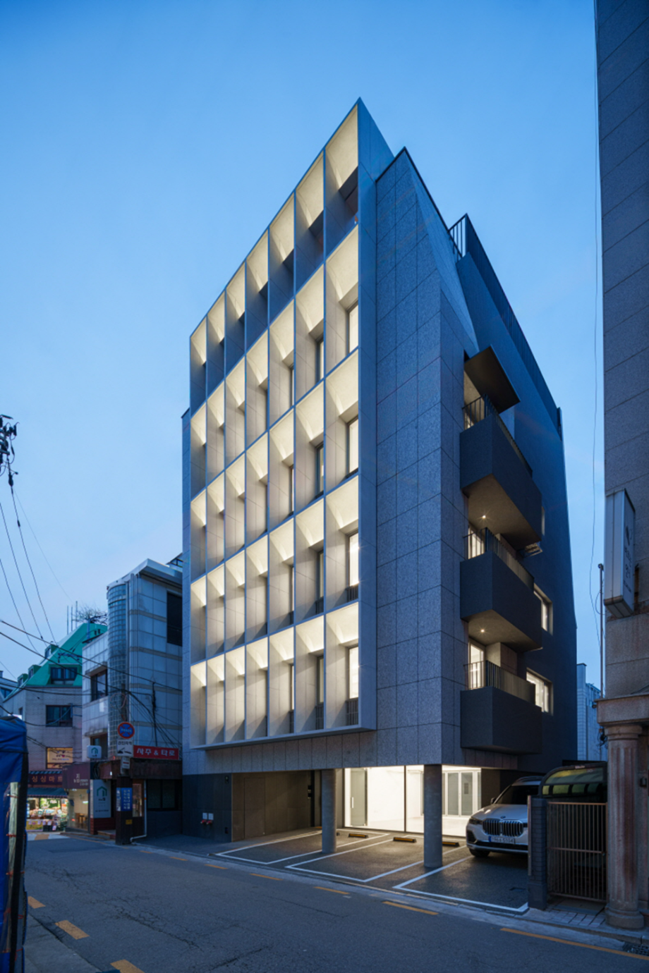 그러한 이유로 먼저 건축물의 새로운 축을 정립해야 했다. 엘리베이터 설치 및 내진성능 개선을 위해 계단실 폭에 맞춰 철근콘크리트구조의 내력벽을 외벽에 면하여 신설했고, 이는 전면 파사드의 돌출 정도의 기준이 됐다. 그 가상의 면을 바탕으로 기존 건축물 외벽의 경계를 다듬어 파사드가 하나의 존재로 여겨질 수 있도록 단단하고 큰 덩어리감을 가진 석재를 사용하여 마감했다. 이때에 근생으로 용도변경하는 연와조 주택(4, 5층) 부분은 각 실의 벽체 및 베란다의 경계를 허물며 H빔으로 구조보강을 하는데, 일조사선에 영향을 미치는 부분의 일부는 사선으로 처리하고 석재 파사드의 연속적 흐름을 이어주어 매스의 통일감을 잃지 않으려 했다.