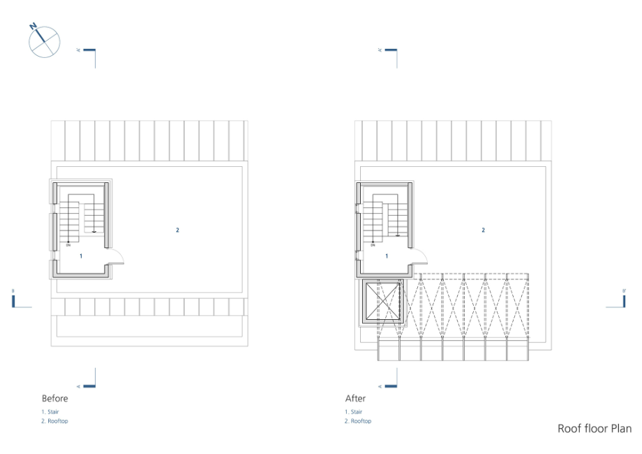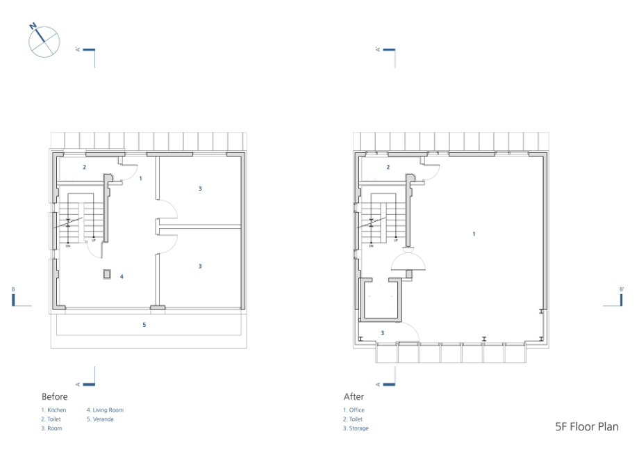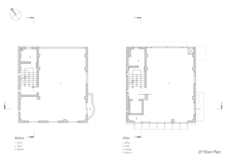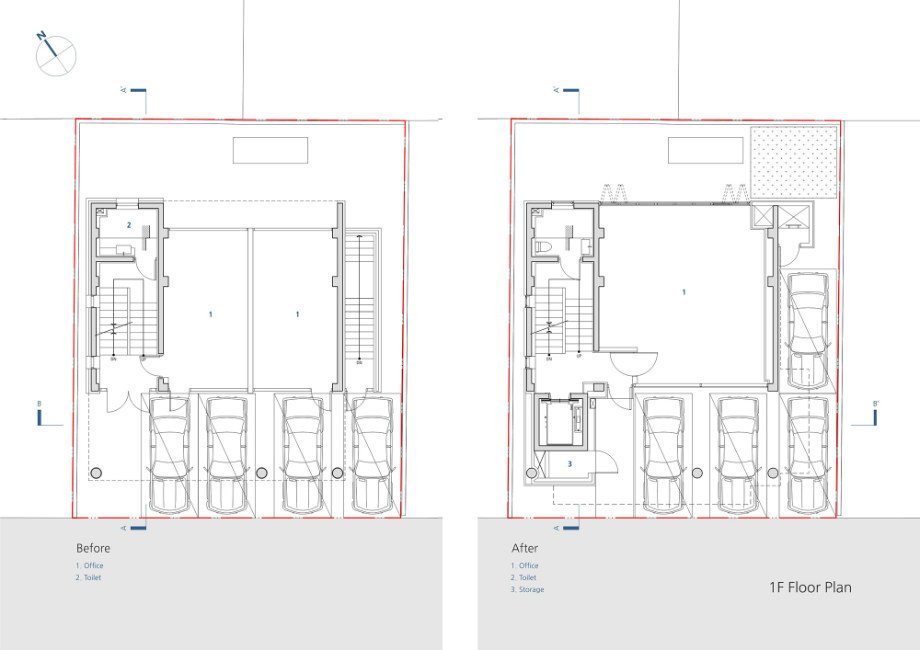 수익형 부동산 개념을 바탕한 임대형 건축물을 리모델링 하는 입장에서 가장 중요한건 투자비용 대비 효용일 텐데 그러한 방법에 대해 욕심을 내는건 당연한 심리다. 그러한 이유로 가장 저평가 될 만한 낡은 건축물을 찾아내는 일이 먼저였다. 엘리베이터가 없고 연와조 주택을 겸한 근생 건축물이자 오랫동안 불법건축물로서 관리가 잘 되지 않아 공실이 오랫동안 이어져온 이 건축물이 제격이었다. 하지만 오래된 건축물이라 지하에는 누수로 인해 바닥이 물로 찰랑거렸고 수직, 수평이 맞지 않은 평면과 들쭉날쭉한 계단의 형태로 인해 건축물 자체가 비뚤어져 있었기에 건축물을 반듯하게 정리정돈 하는 것이 필요해 보였다.