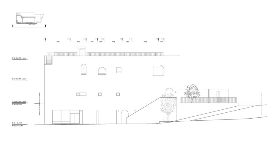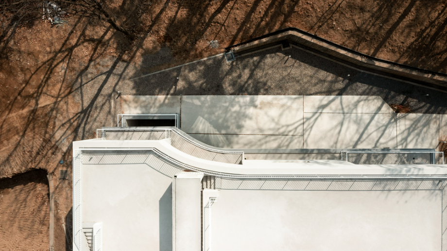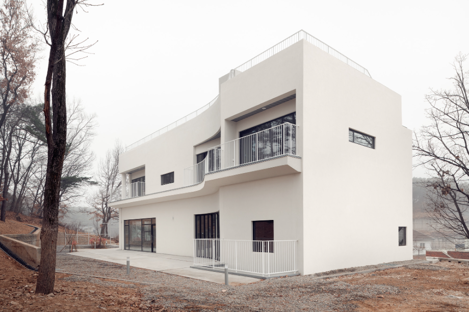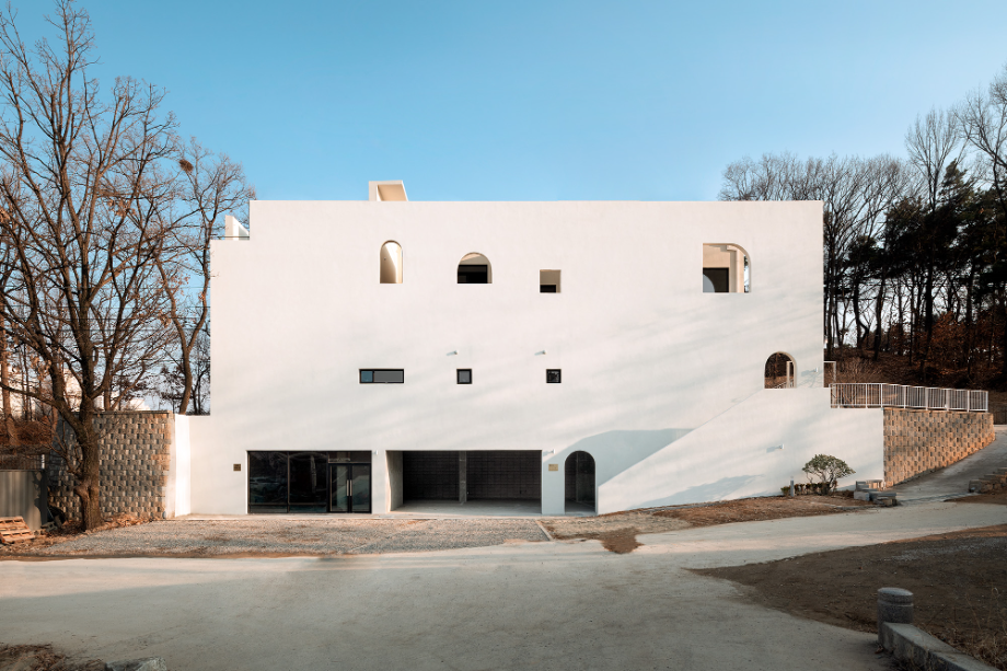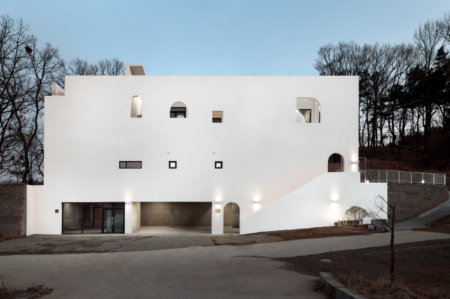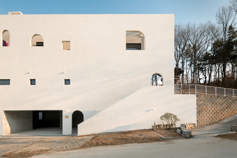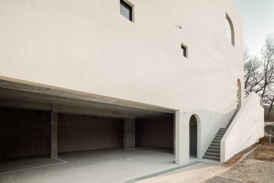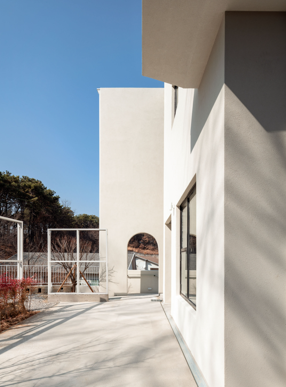 벽은 부드럽되 단호하게 안과 밖을 경계 짓는다. 투박하고 고요한 벽의 바깥세상에서 벽을 따라 올라 벽 안쪽으로 들어서면, 나무들과 햇볕과 나무그림자들을 온전히 받아내는 마당이 나타난다. 벽의 따뜻한 백색과 아치 등 곡선처리가 된 개구부들은 단호한 벽을 부드럽게 만들어 준다.