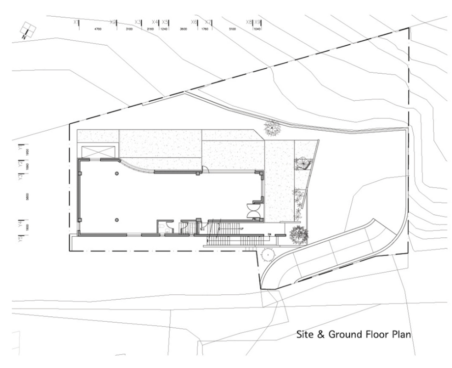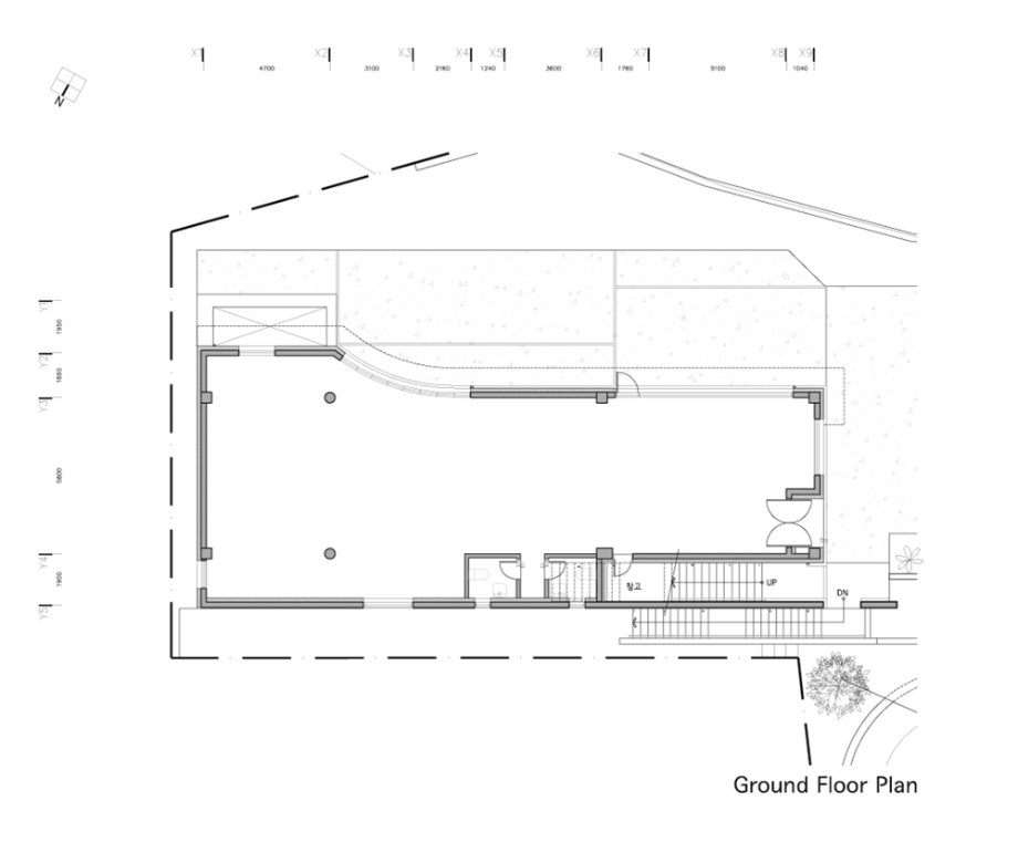처음 땅을 만났을 때, 위쪽 공원의 아름드리나무들이 마당으로 드리워져, 마치 나무들이 땅을 보듬고 끌어안는 듯했다. 그 나무들의 품을 건물이 받아 안아, 포근하고 따스한 마당이 되기를 바랐다.